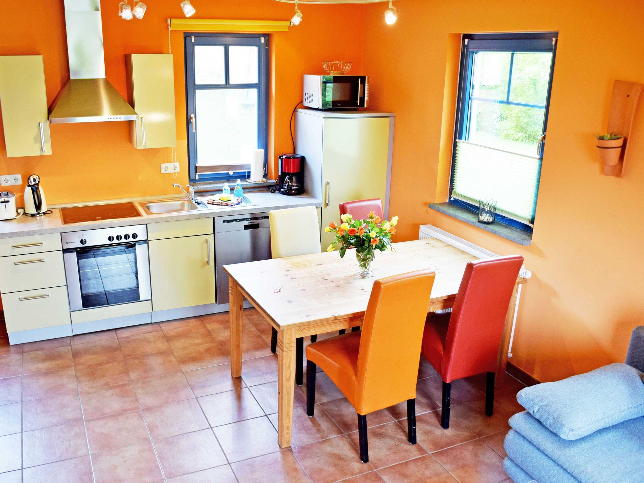 Die moderne Küchenzeile ist mit Herd, Backofen, Kaffeemaschine, Toaster, Wasserkocher, Spülmaschine und Kühlschrank komplett ausgestattet. Vom Wohnbereich aus gelangt man auf die Terrasse mit Gartenmöbeln und in den Gemeinschaftsgarten.
