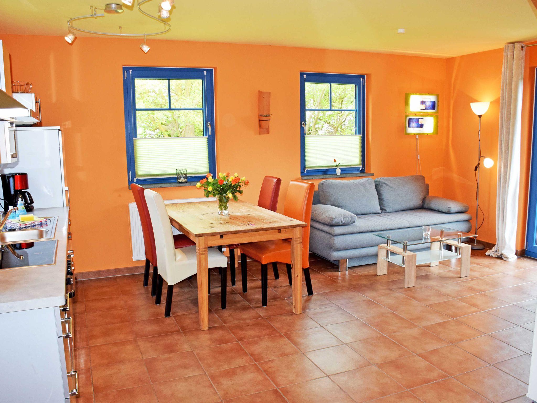 Im Erdgeschoss befinden sich ein Wohn- und Essbereich mit moderner Einbauküche, einem Esstisch mit Stühlen sowie einer Couchgarnitur, modern. Flachbild-TV und Radio.