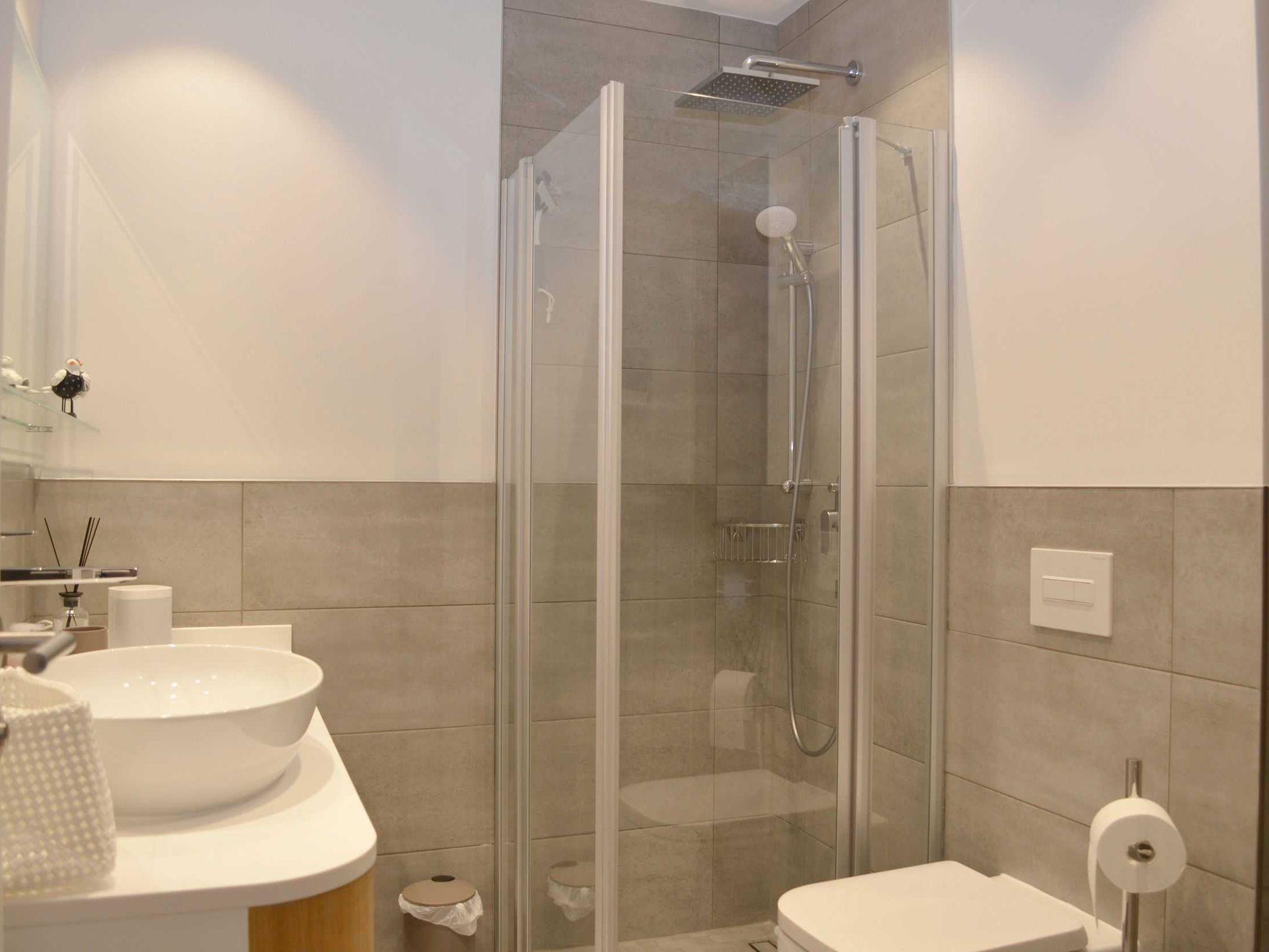 Das Bad ist mit einer ebenerdigen Dusche, beheiztem und beleuchtetem Spiegel, Haartrockner und WC ausgestattet. Die Sauna und Fußbodenheizung komplettieren das Möwennest.