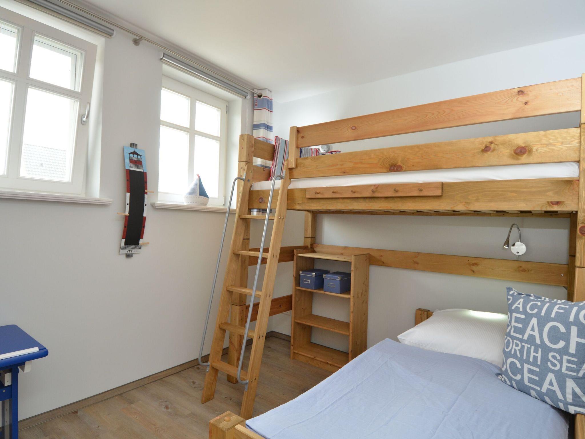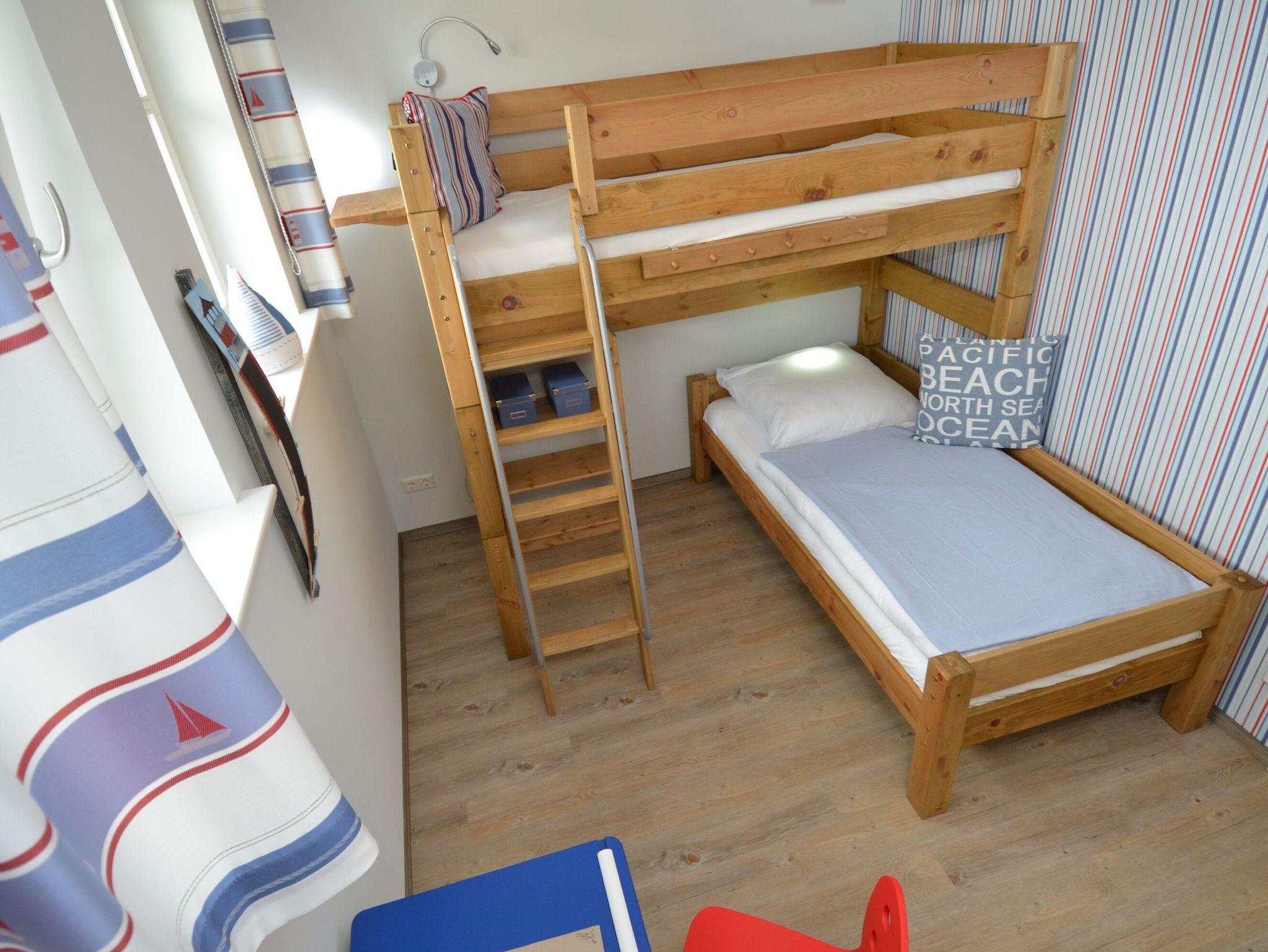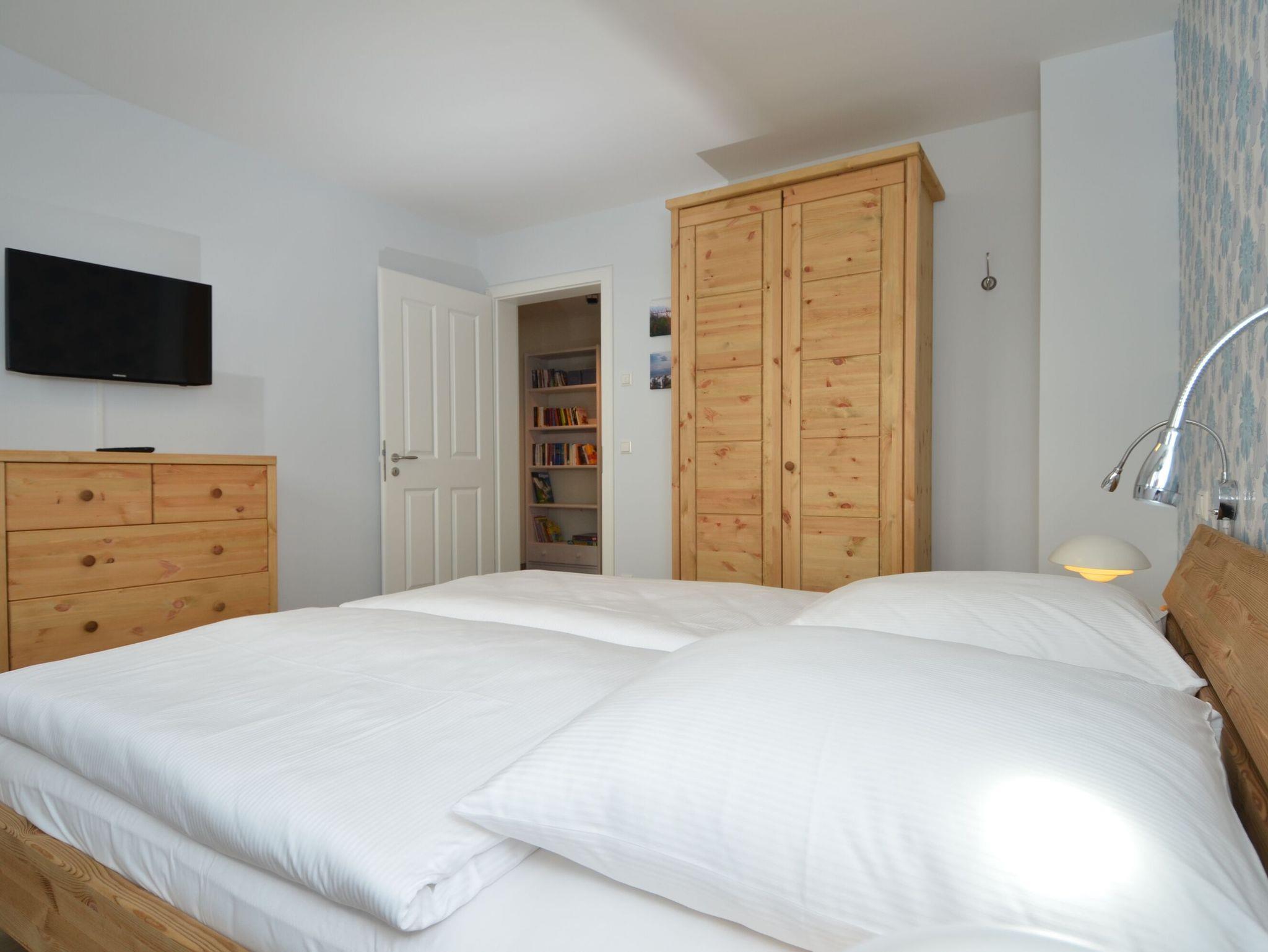 In dem mit Designbelag ausgestatteten Obergeschoss befinden sich drei weitere Schlafzimmer. Zwei Schlafzimmer sind ausgestattet mit einem 180cm breiten Doppelbett (eines davon mit 220 cm Überlänge) sowie je einem Flachbildfernseher. Und falls im Urlaub mal dringend notwendige Büroarbeiten anstehen, können diese in einem dieser Schlafzimmer am Schreibtisch mit Sitzgelegenheit erledigt werden. Das dritte Schlafzimmer verfügt über ein Eck-Etagenbett mit zwei Einzelbetten der Größe 90x200cm und einen kleineren Schreibtisch mit Sitzgelegenheit. Ausreichend Platz für Ihre Garderobe ist in allen Schlafzimmern vorhanden.