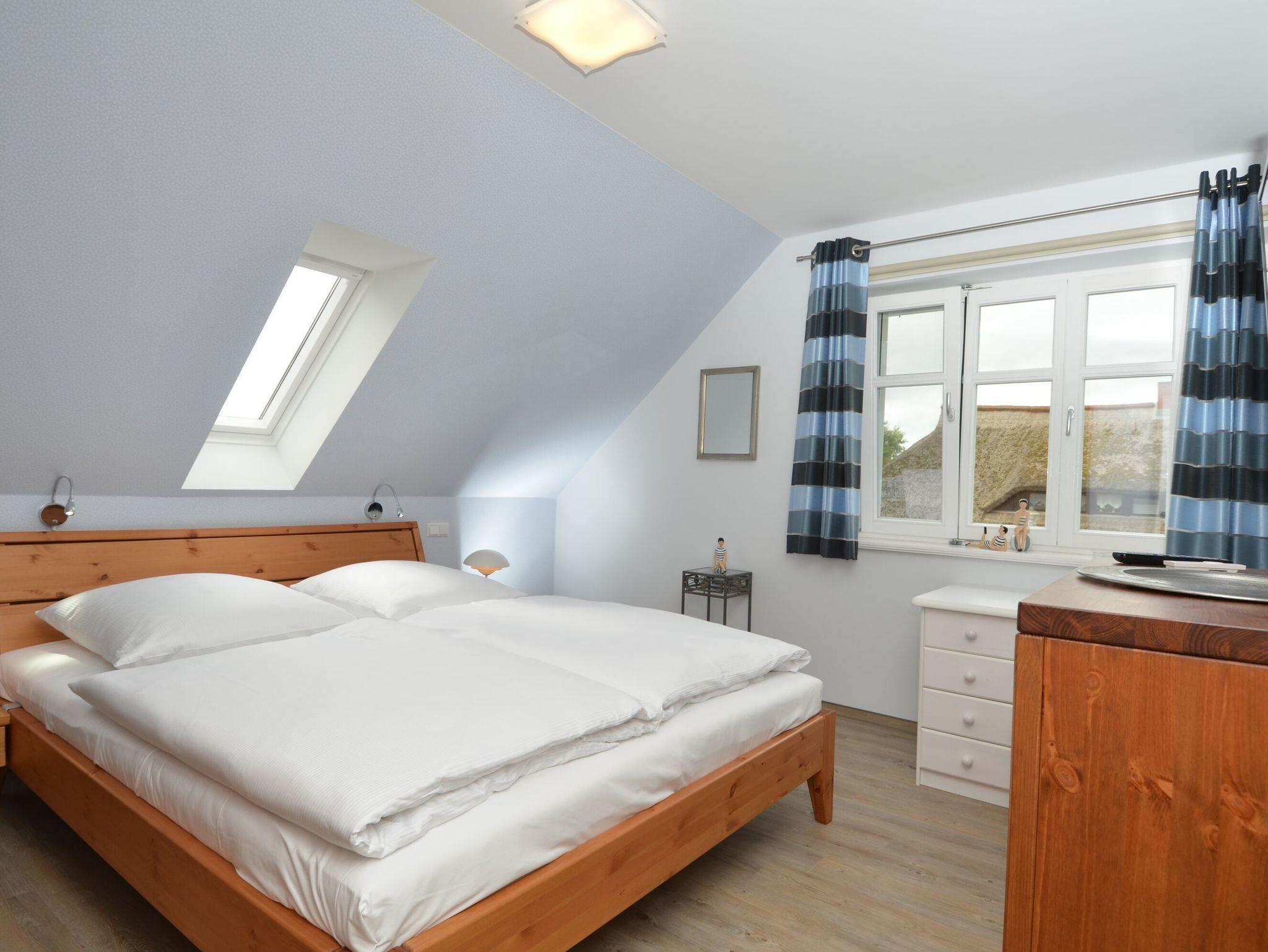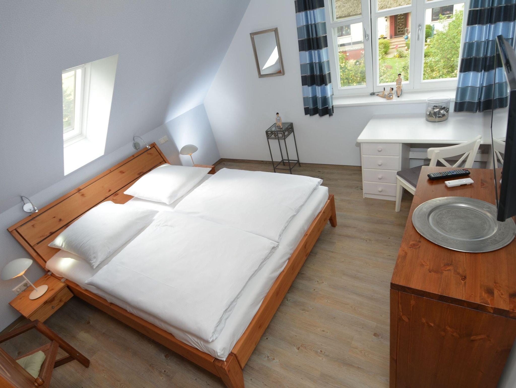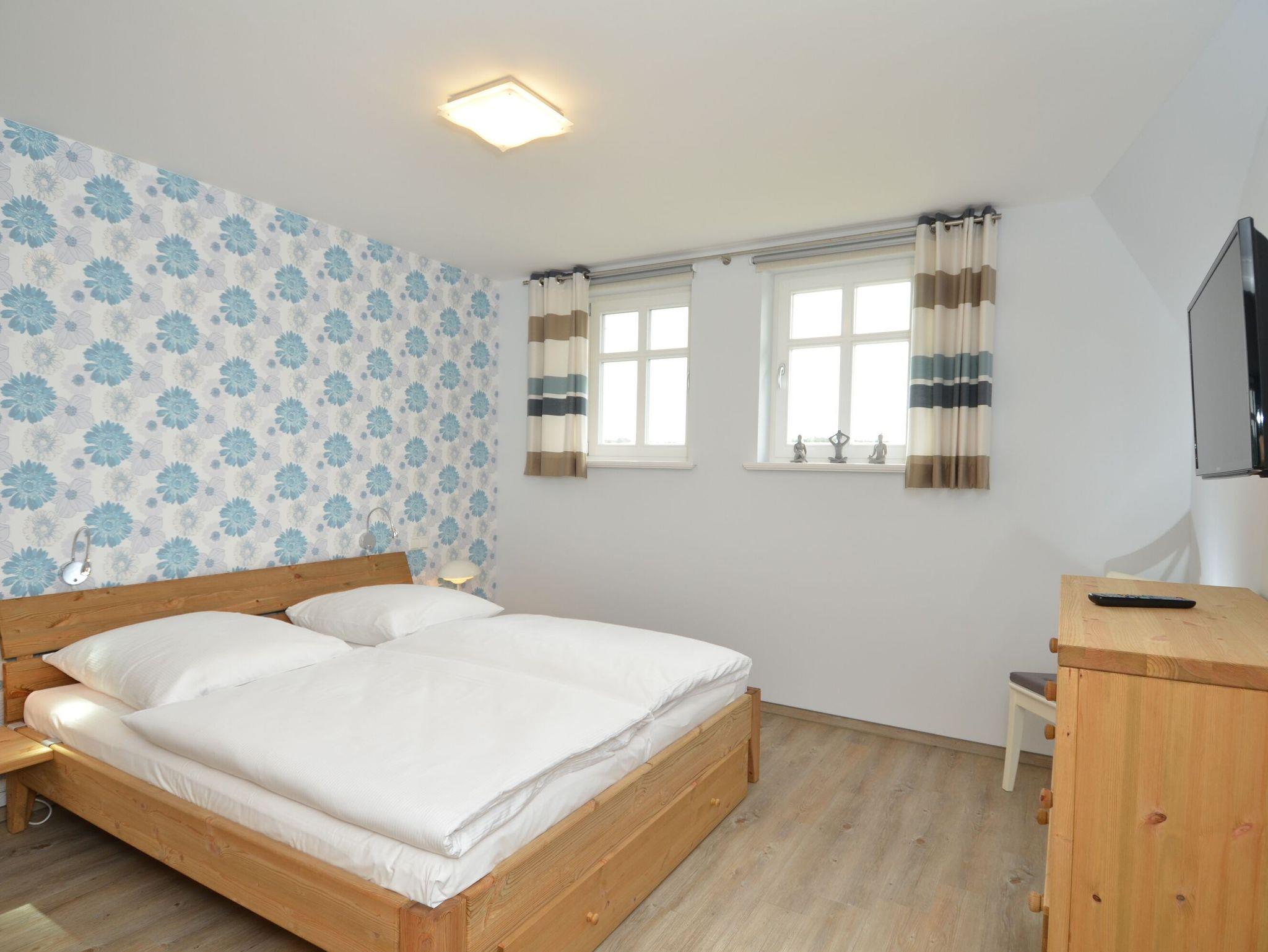 In dem mit Designbelag ausgestatteten Obergeschoss befinden sich drei weitere Schlafzimmer. Zwei Schlafzimmer sind ausgestattet mit einem 180cm breiten Doppelbett (eines davon mit 220 cm Überlänge) sowie je einem Flachbildfernseher. Und falls im Urlaub mal dringend notwendige Büroarbeiten anstehen, können diese in einem dieser Schlafzimmer am Schreibtisch mit Sitzgelegenheit erledigt werden. Das dritte Schlafzimmer verfügt über ein Eck-Etagenbett mit zwei Einzelbetten der Größe 90x200cm und einen kleineren Schreibtisch mit Sitzgelegenheit. Ausreichend Platz für Ihre Garderobe ist in allen Schlafzimmern vorhanden.