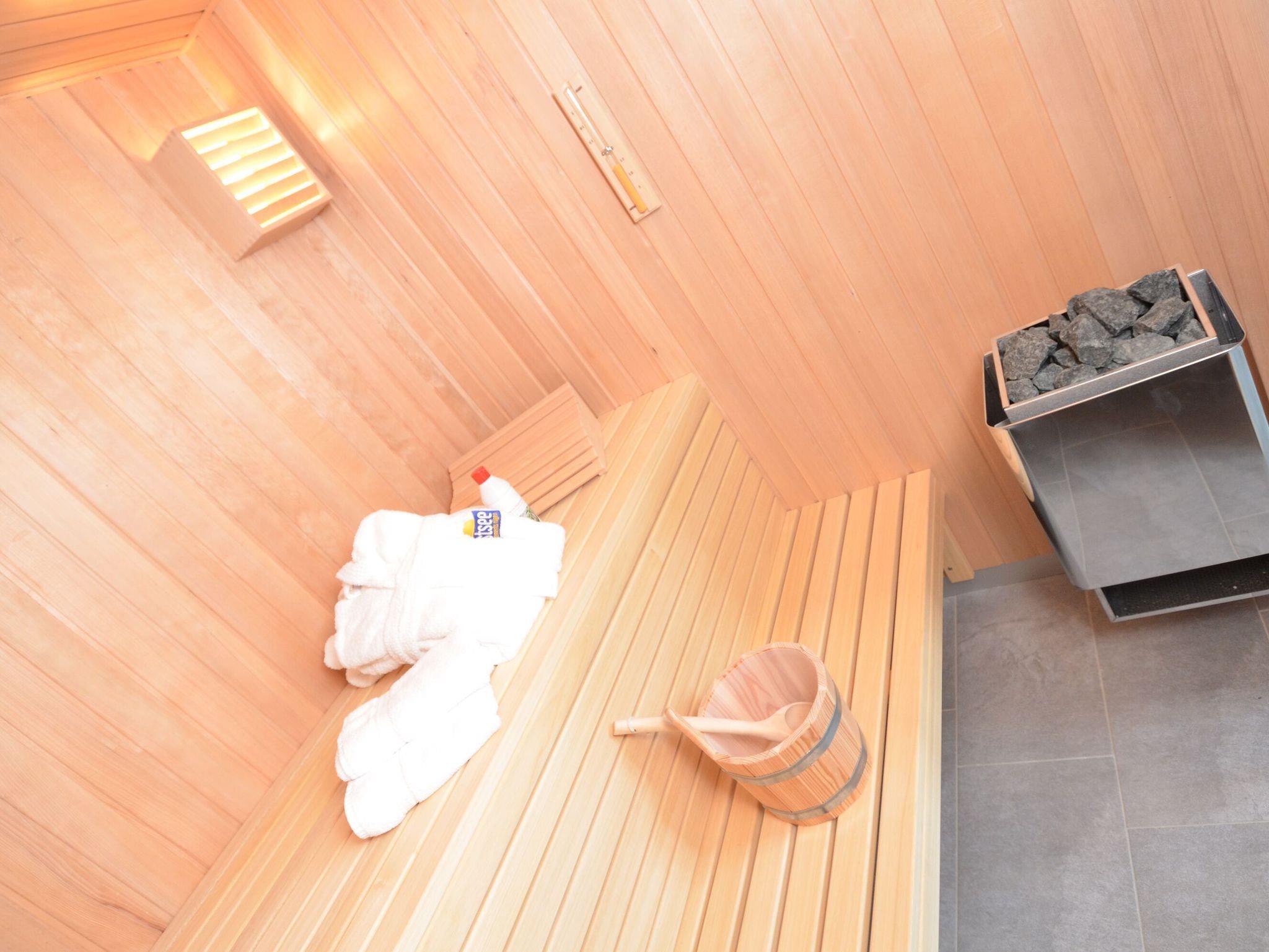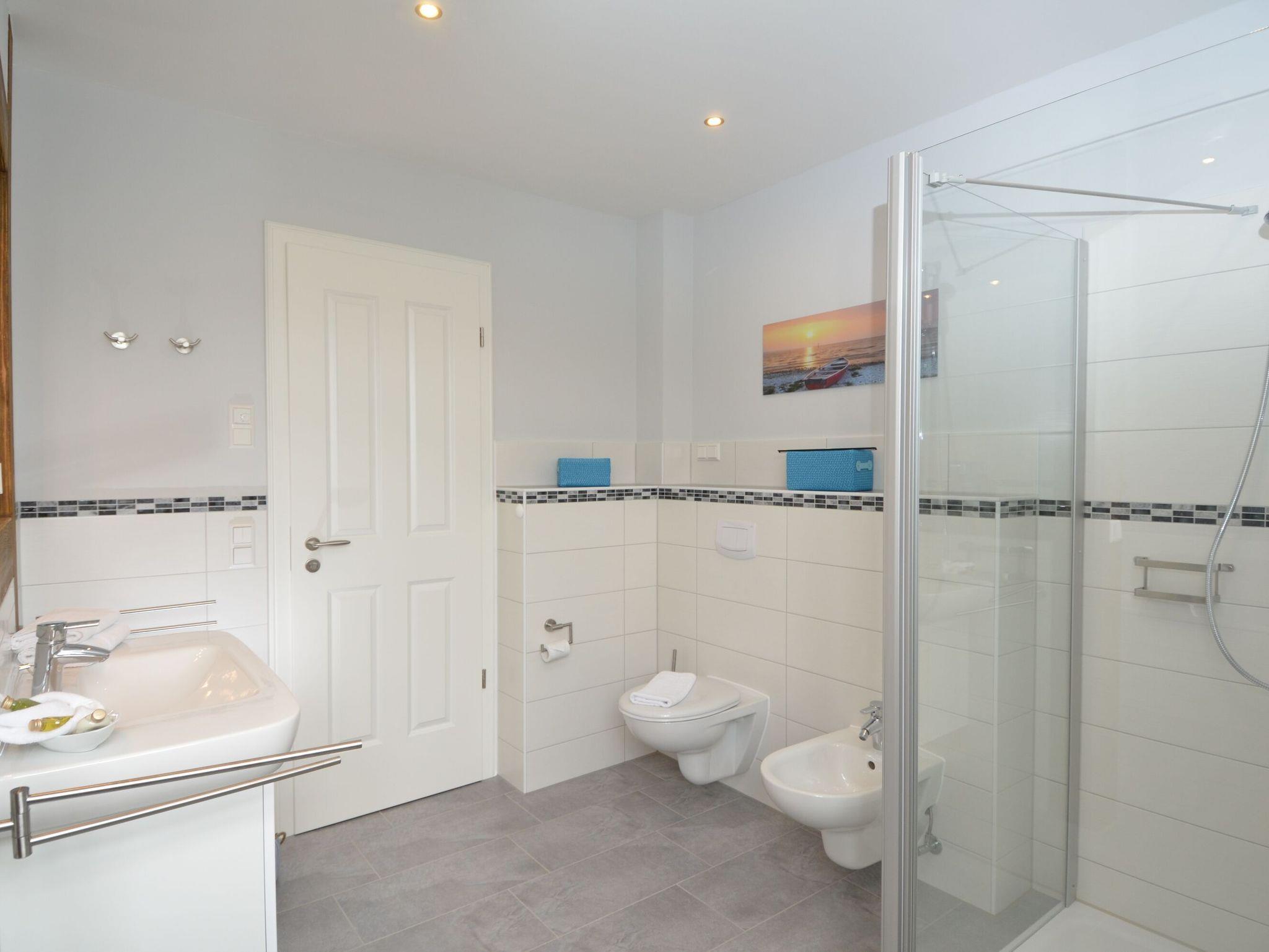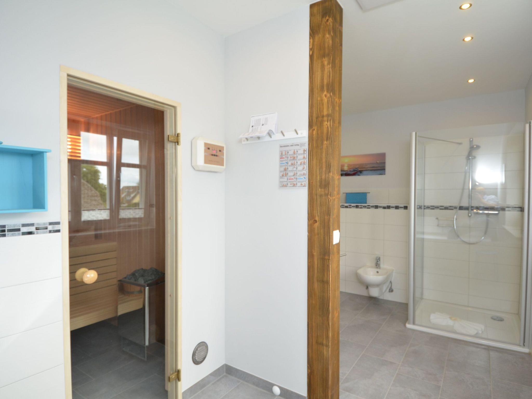 Das geräumige Badezimmer besticht durch eine Dusche mit flacher Duschtasse, eine Badewanne und die hauseigene Sauna. Ein geräumiger Waschplatz mit WC und Bidet sowie Haartrockner gehören ebenfalls zur Ausstattung.