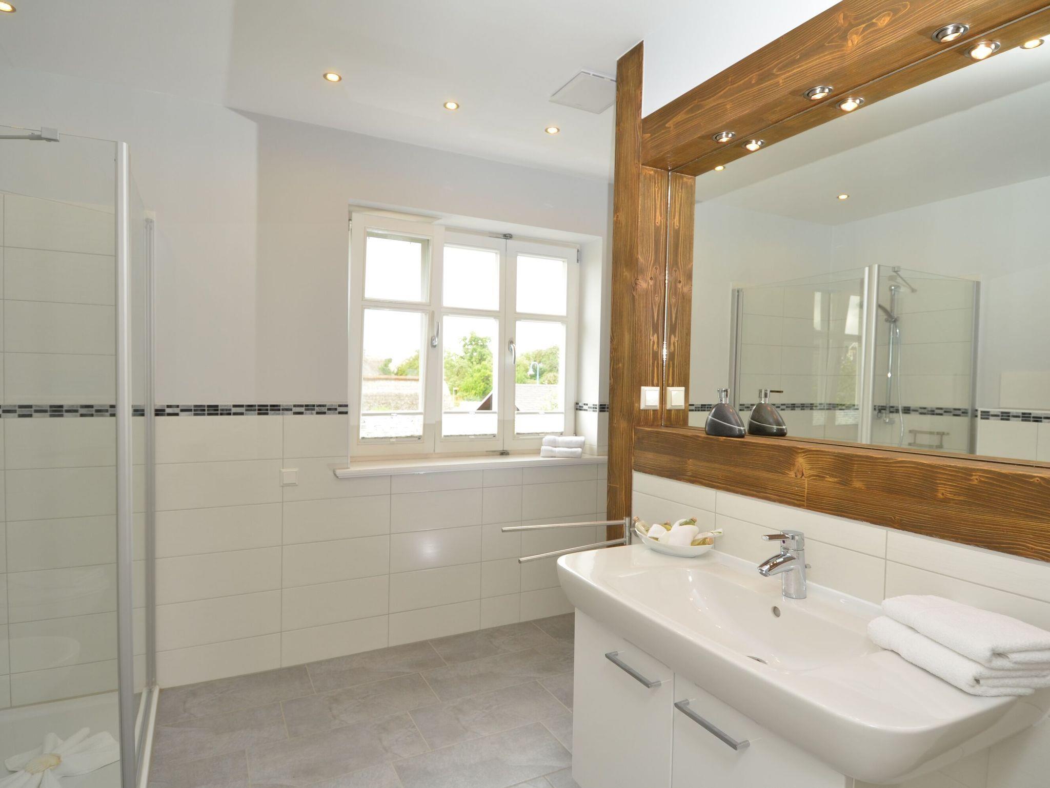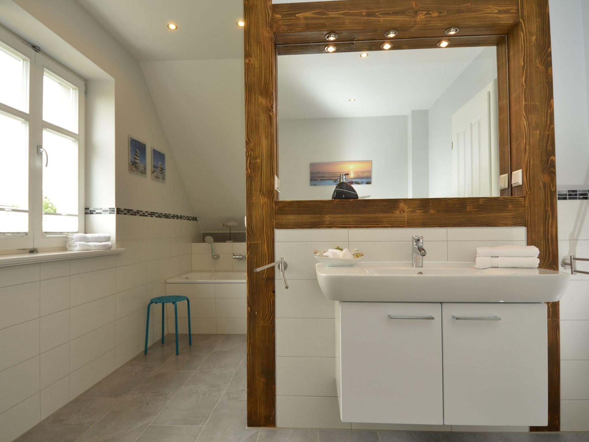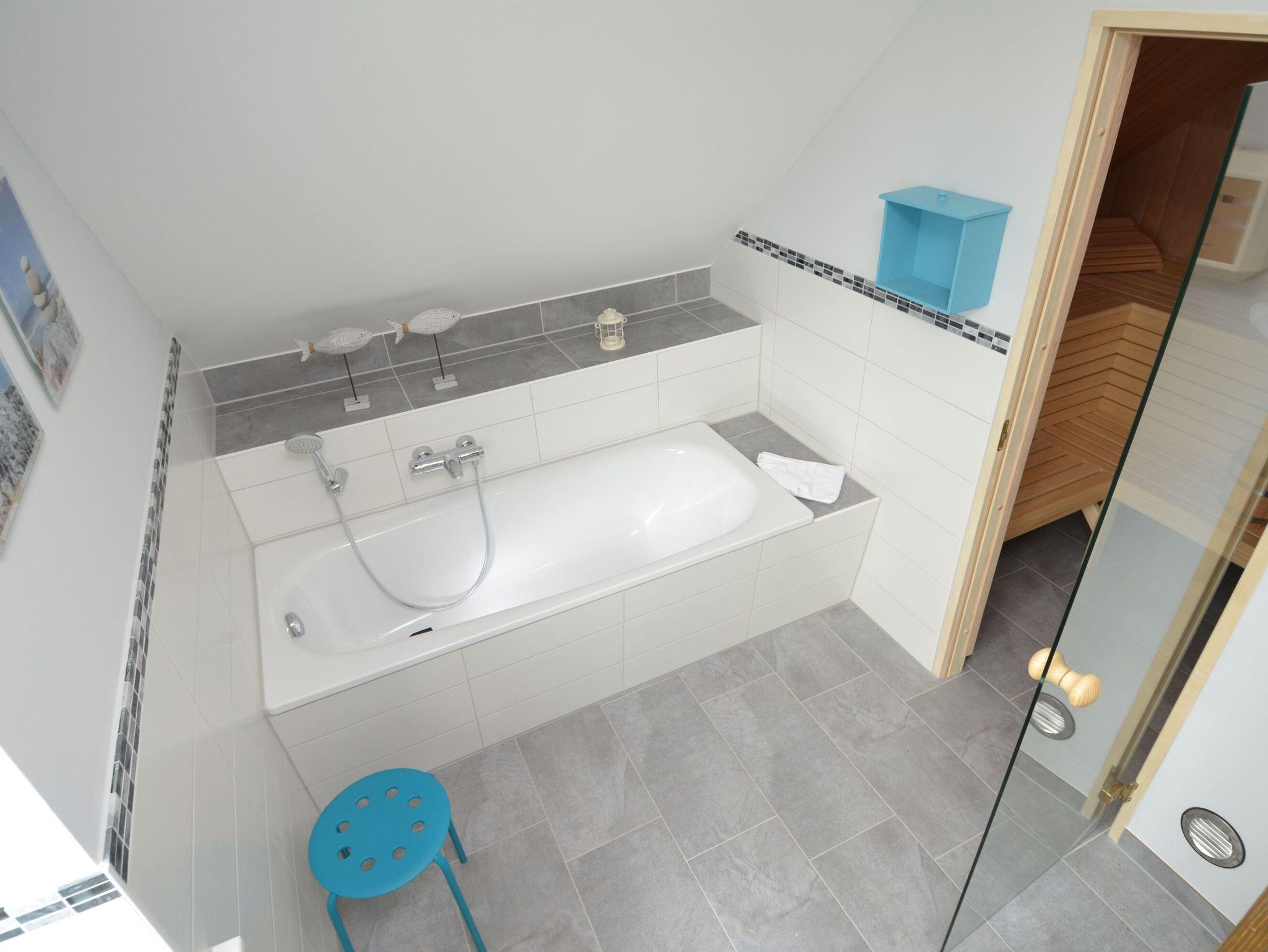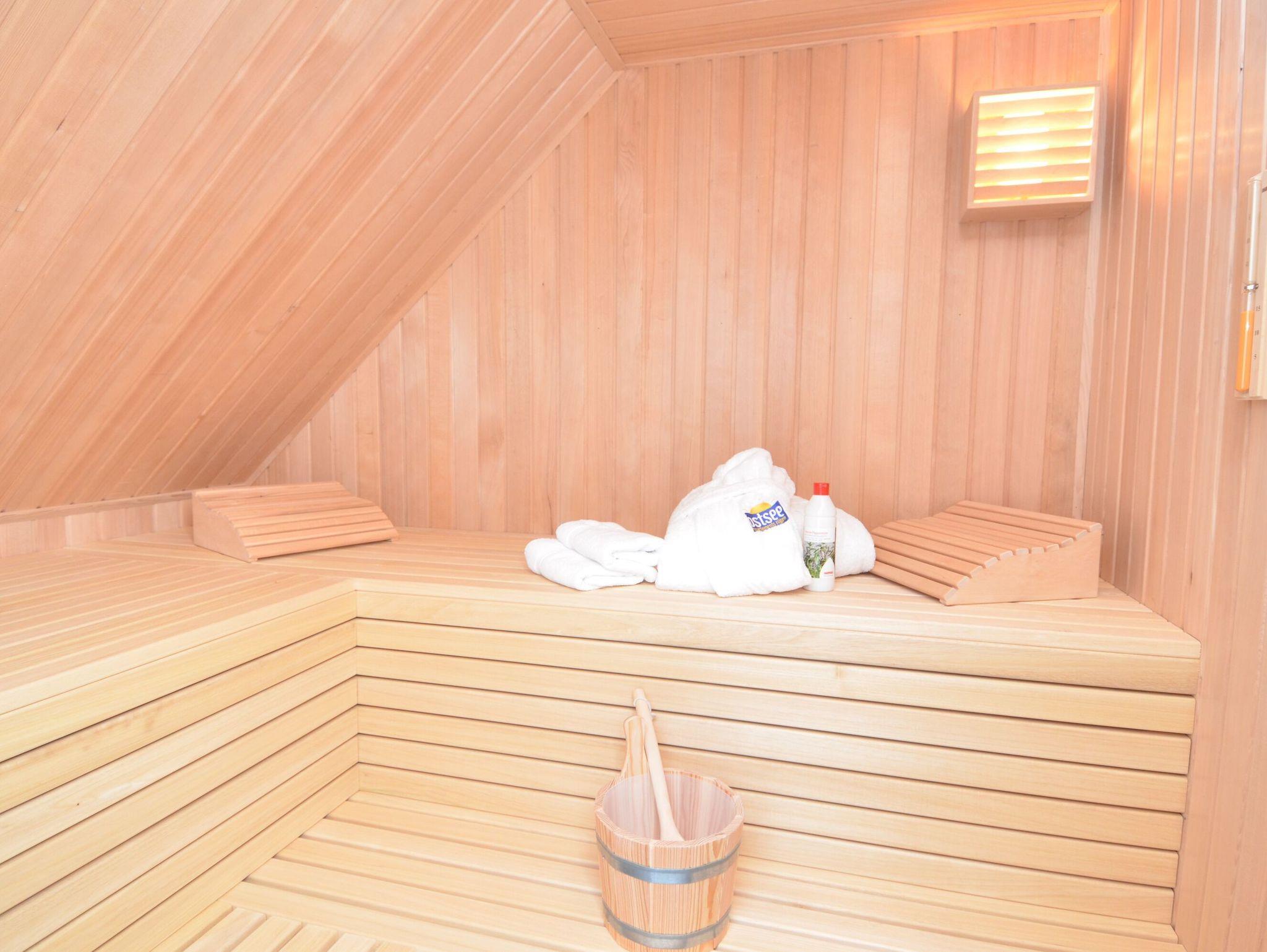 Das geräumige Badezimmer besticht durch eine Dusche mit flacher Duschtasse, eine Badewanne und die hauseigene Sauna. Ein geräumiger Waschplatz mit WC und Bidet sowie Haartrockner gehören ebenfalls zur Ausstattung.