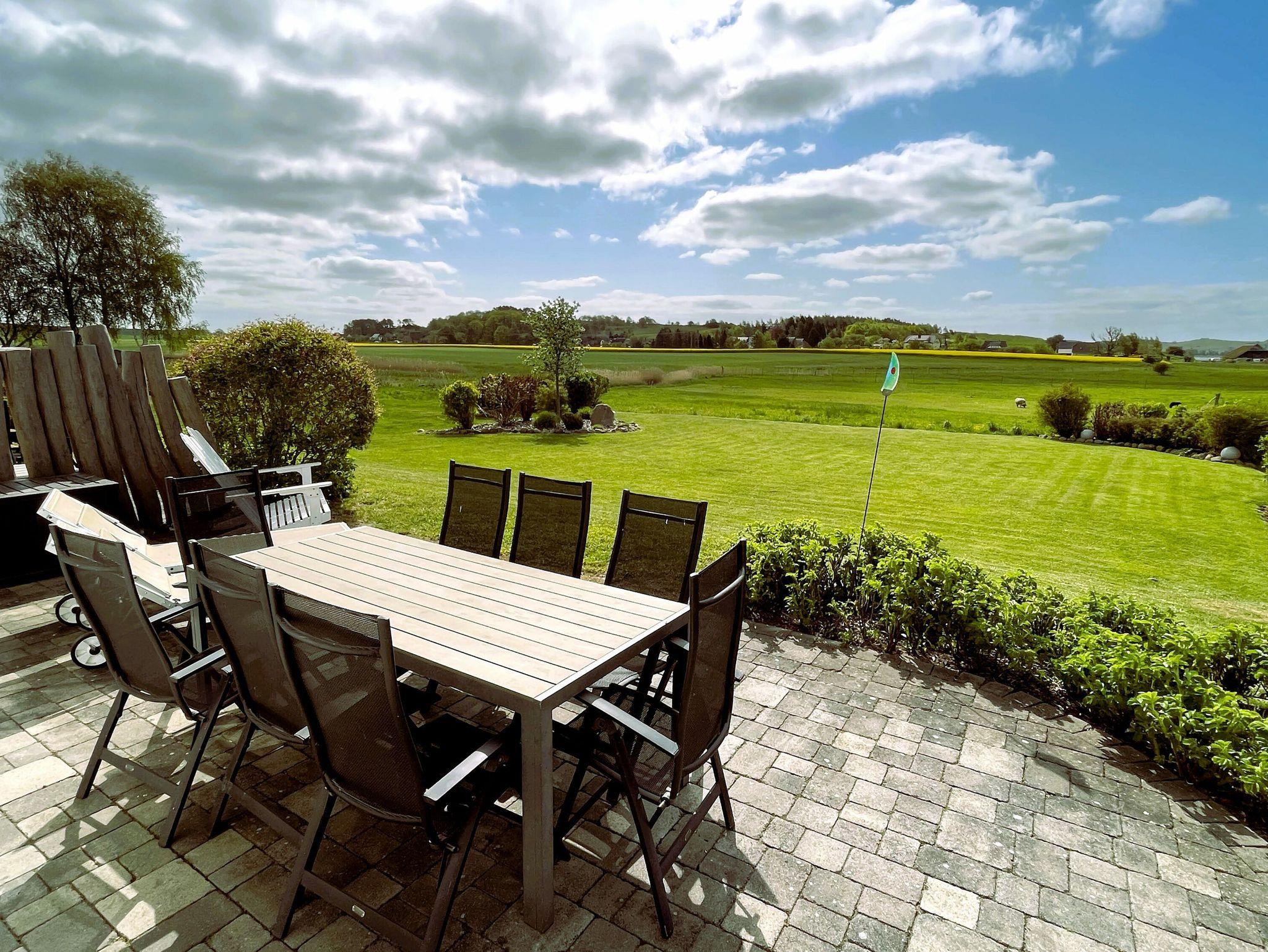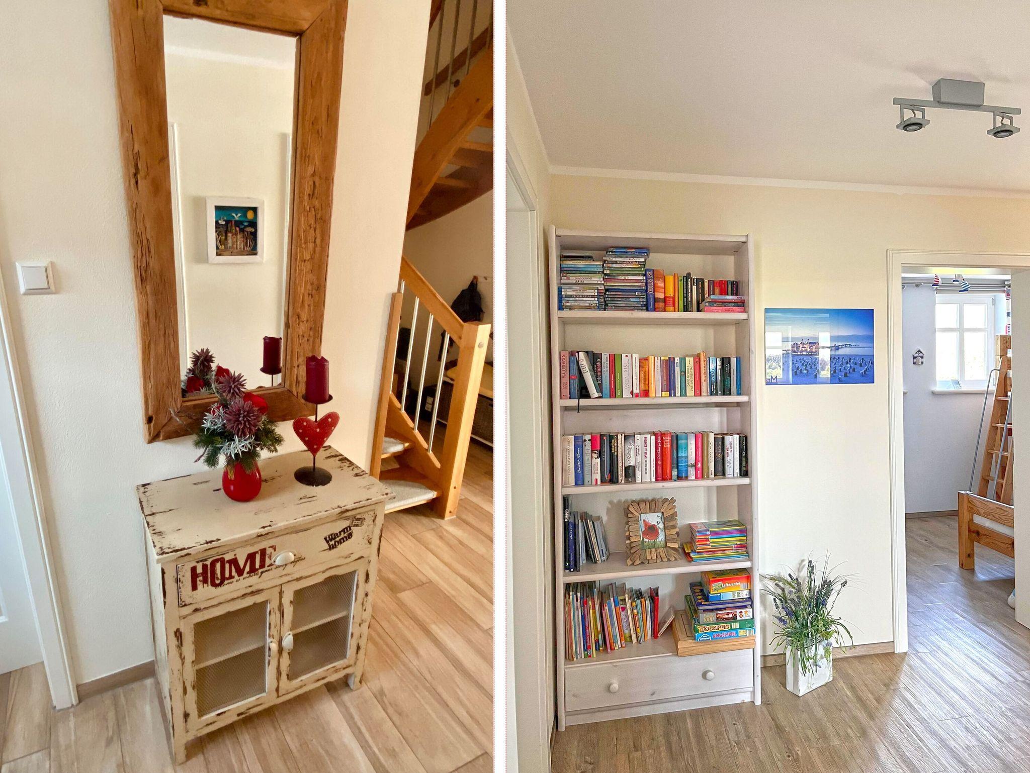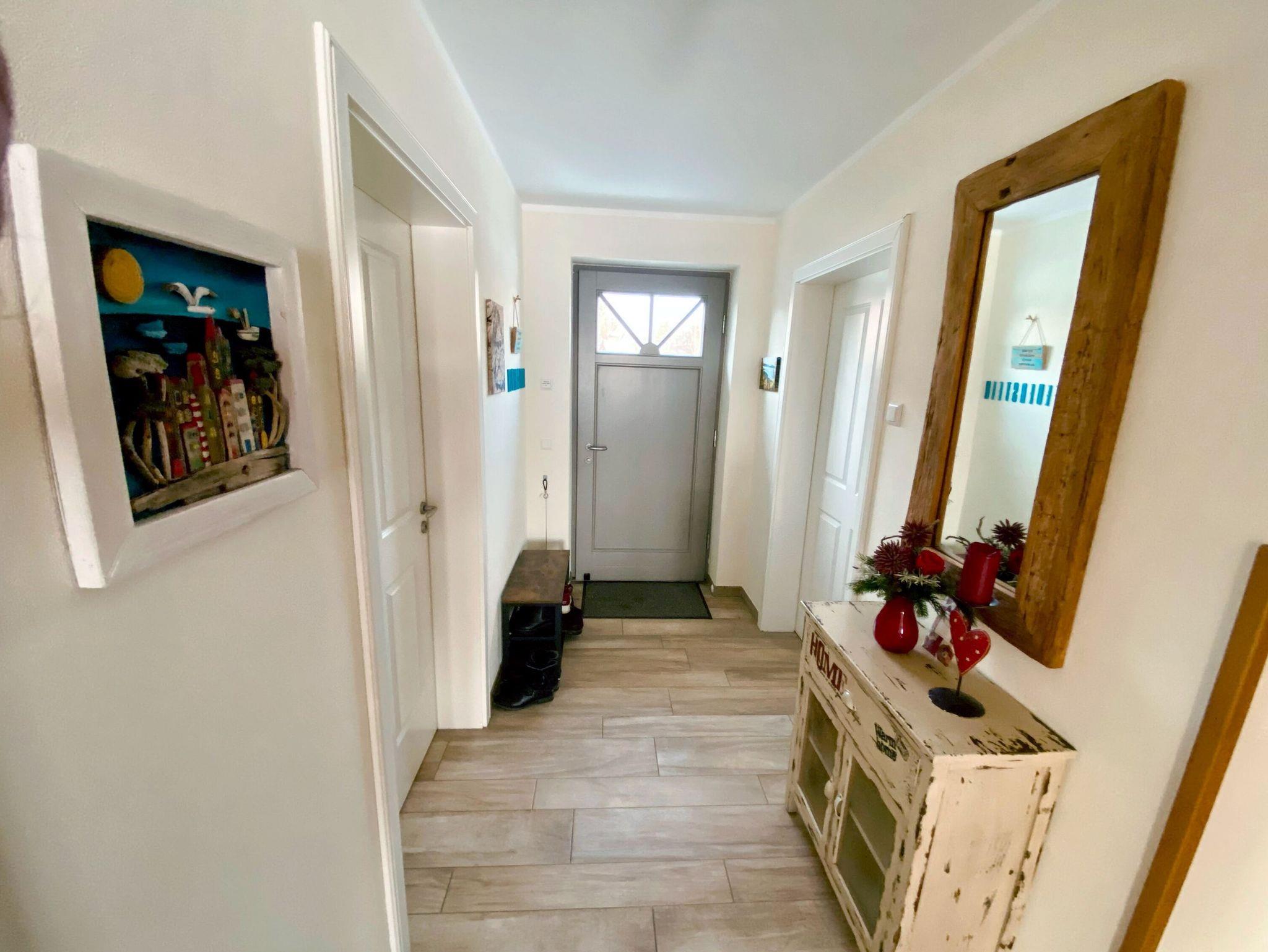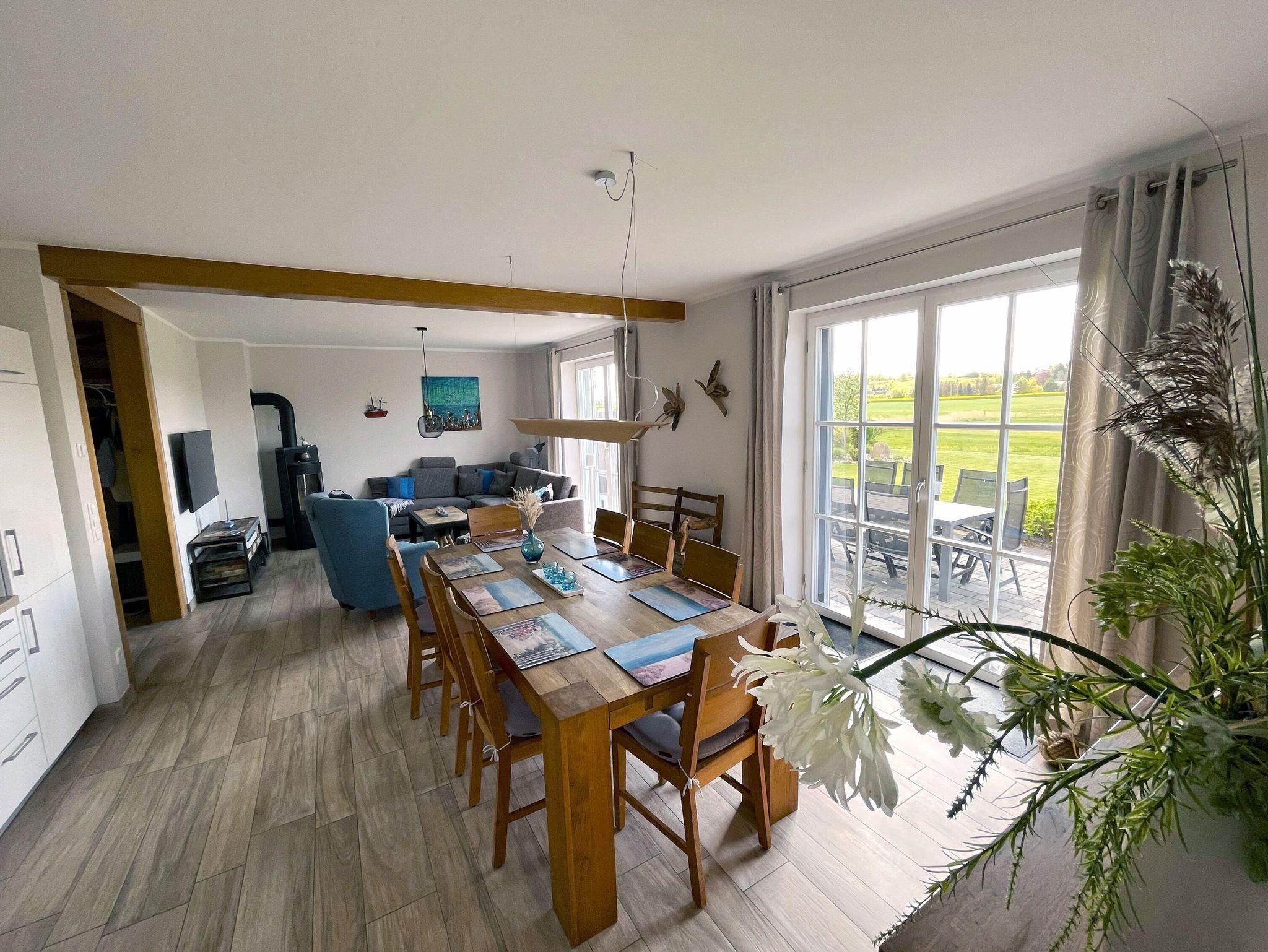 Die rechte Haushälfte über zwei Ebenen bietet mit einer Wohnfläche von 128 m², einer möblierten Terrasse und einem Garten mit Süd-West-Ausrichtung genügend Platz für erholsame Urlaubstage. Im Erdgeschoss befindet sich das sehr geräumige, hochwertig geflieste Wohn- und Esszimmer mit einem großen Eichenesstisch für acht Personen. Der Wohnbereich sorgt mit einer modernen Sitzecke und einem Sessel sowie einem Kamin für Wohlbehagen. Das Kaminholz ist bitte selbst mitzubringen.