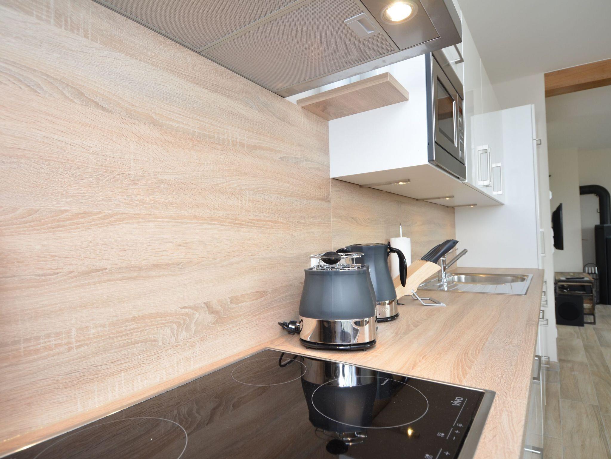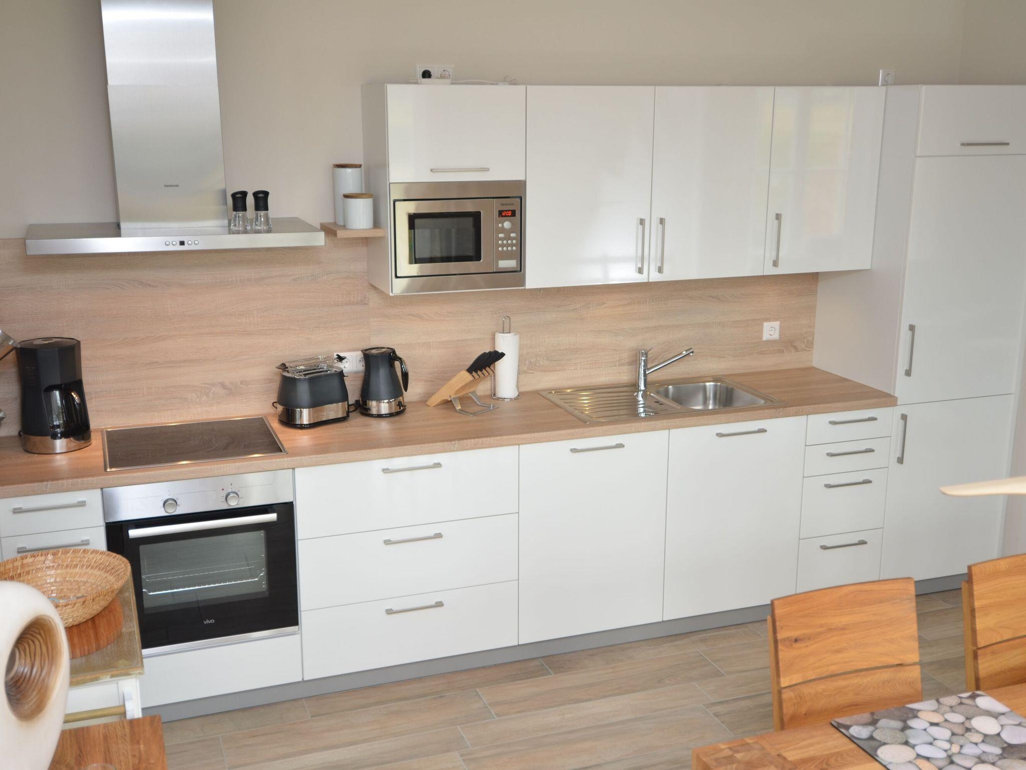 Die harmonisch im Wohnbereich integrierte hochwertig ausgestattete Küchenzeile verfügt über eine Spülmaschine, einen Backofen, ein 4-Zonen-Induktionskochfeld, eine Kühl-/Gefrierkombination, eine Mikrowelle, Kaffeemaschine, Toaster, Wasserkocher, Mixer, Waffeleisen sowie diverses Kleininventar, das die Küchenausstattung komplettiert.