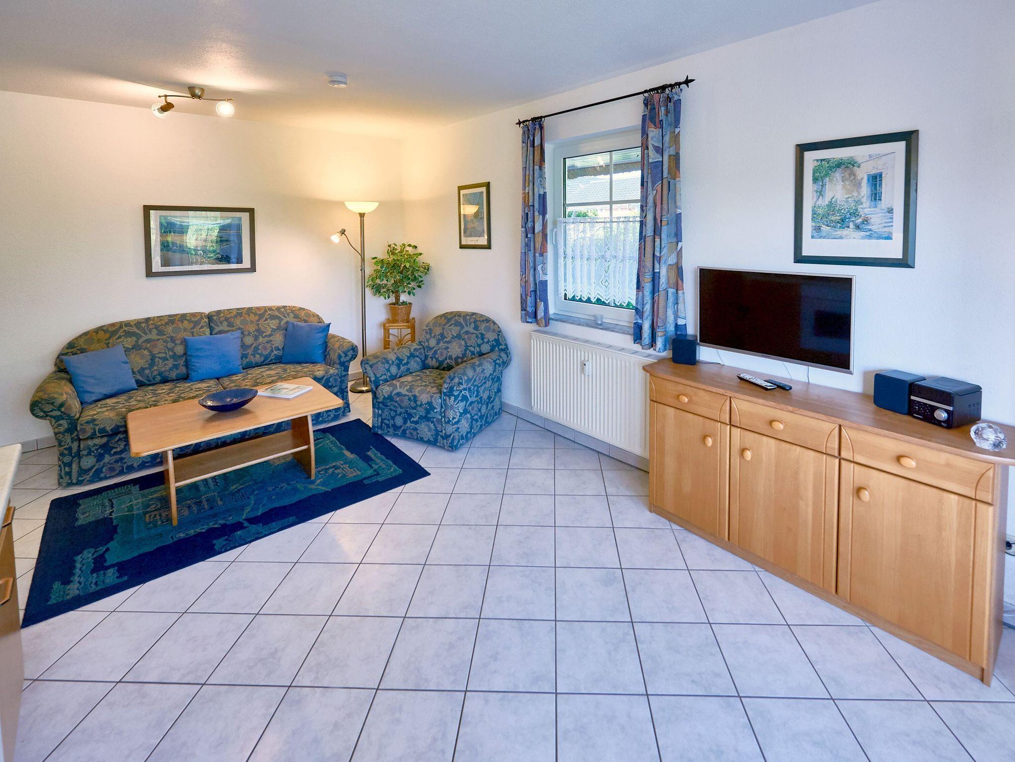 Im gemütlichen Wohnraum befinden sich eine Couchgarnitur (Aufbettung für zwei Personen), ein Fernseher und eine Stereoanlage mit CD-Player, ein Esstisch im hellen Erker und die im Wohnraum integrierte Küchenzeile. Dort stehen Ihnen u.a. ein Kühlschrank, ein 4-Platten-Herd, eine Kaffeemaschine, ein Toaster und diverses Kleininventar zur Verfügung, das die Küchenausstattung komplettiert.
