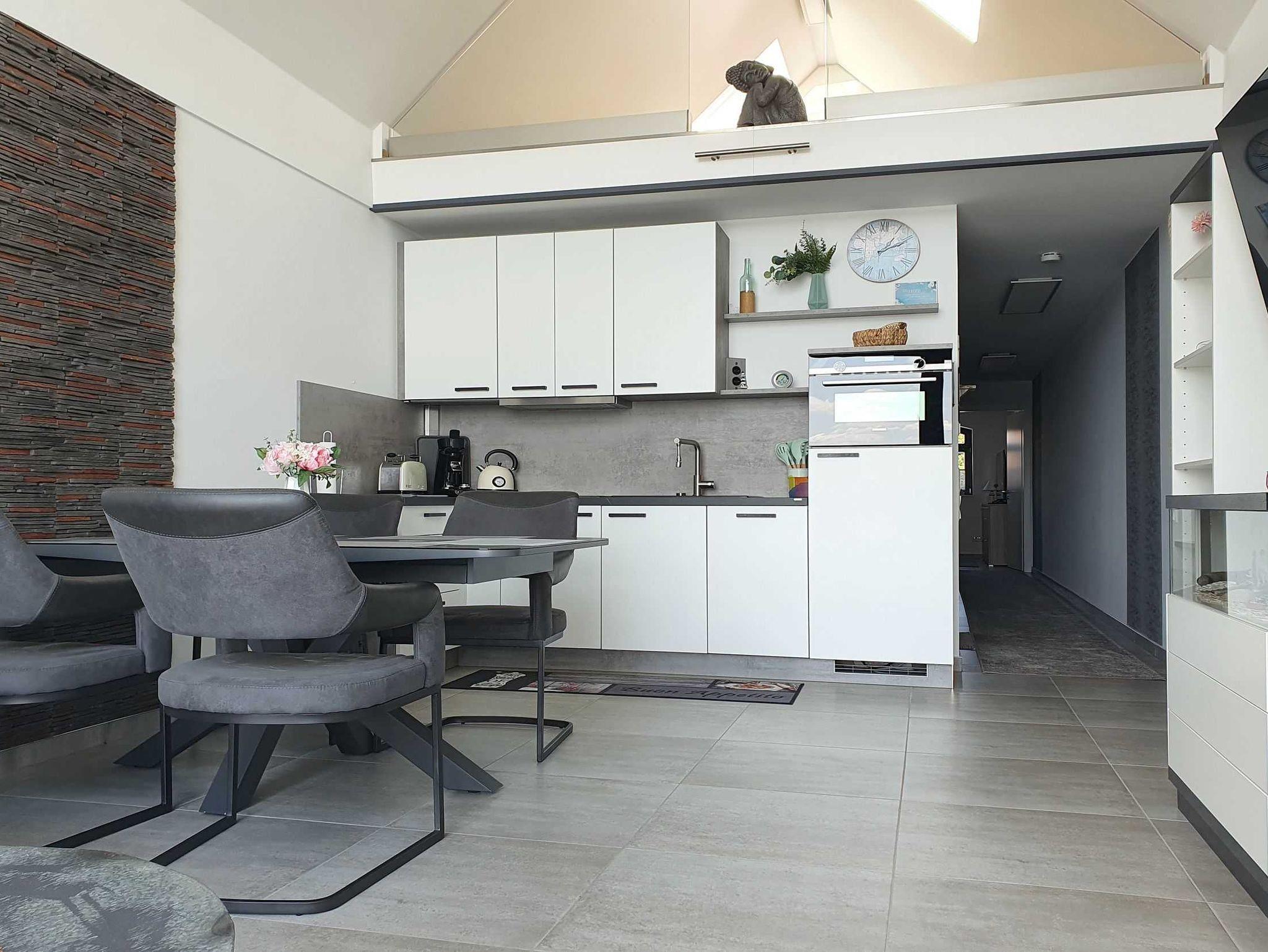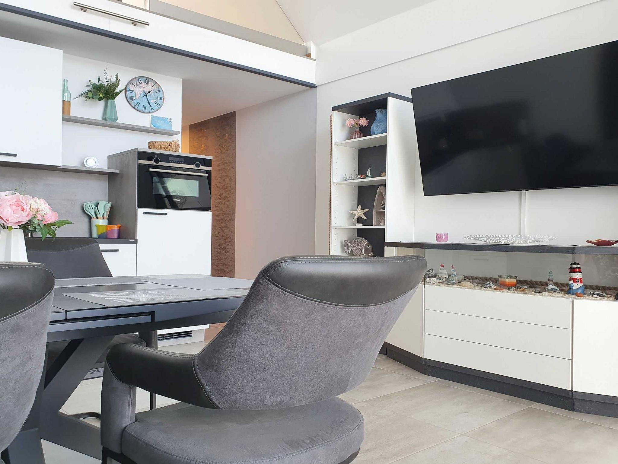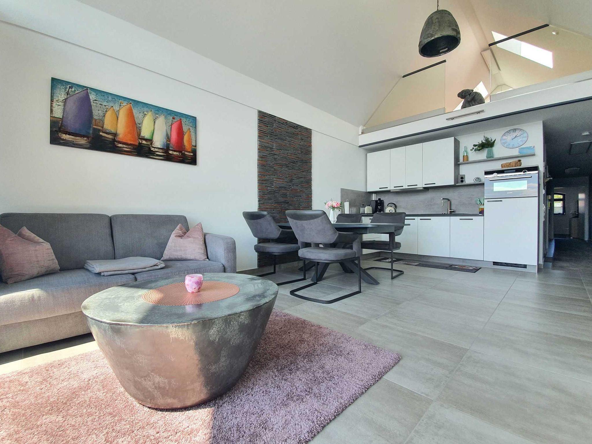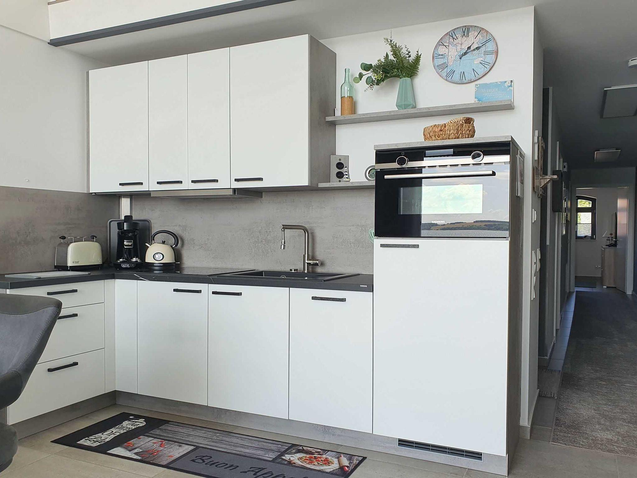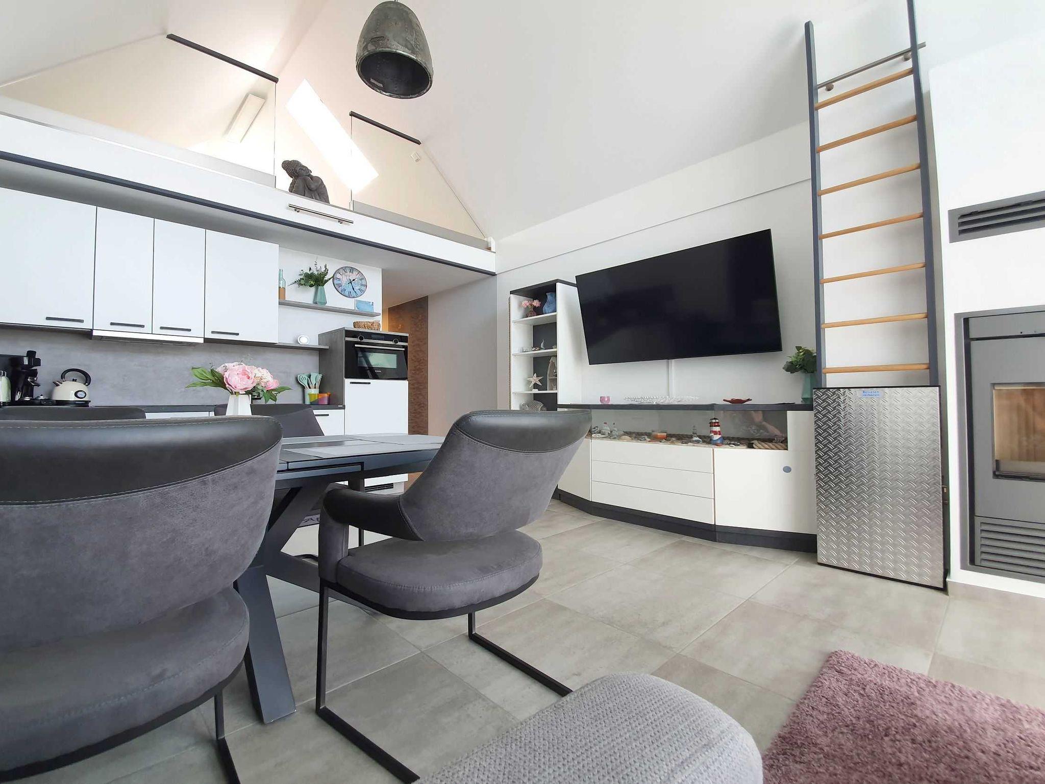 Der modern und hochwertig eingerichtete Wohnbereich bietet eine gemütliche Couchgarnitur und Smart TV (kostenlos Sky, Netflix & Disney). Die offene Wohnküche mit Essbereich ist mit einem 4-Felder Induktionsherd, Backofen, Kühlschrank, Spülmaschine, Kaffeemaschine und reichlich Küchenutenslilien bestens ausgestattet.