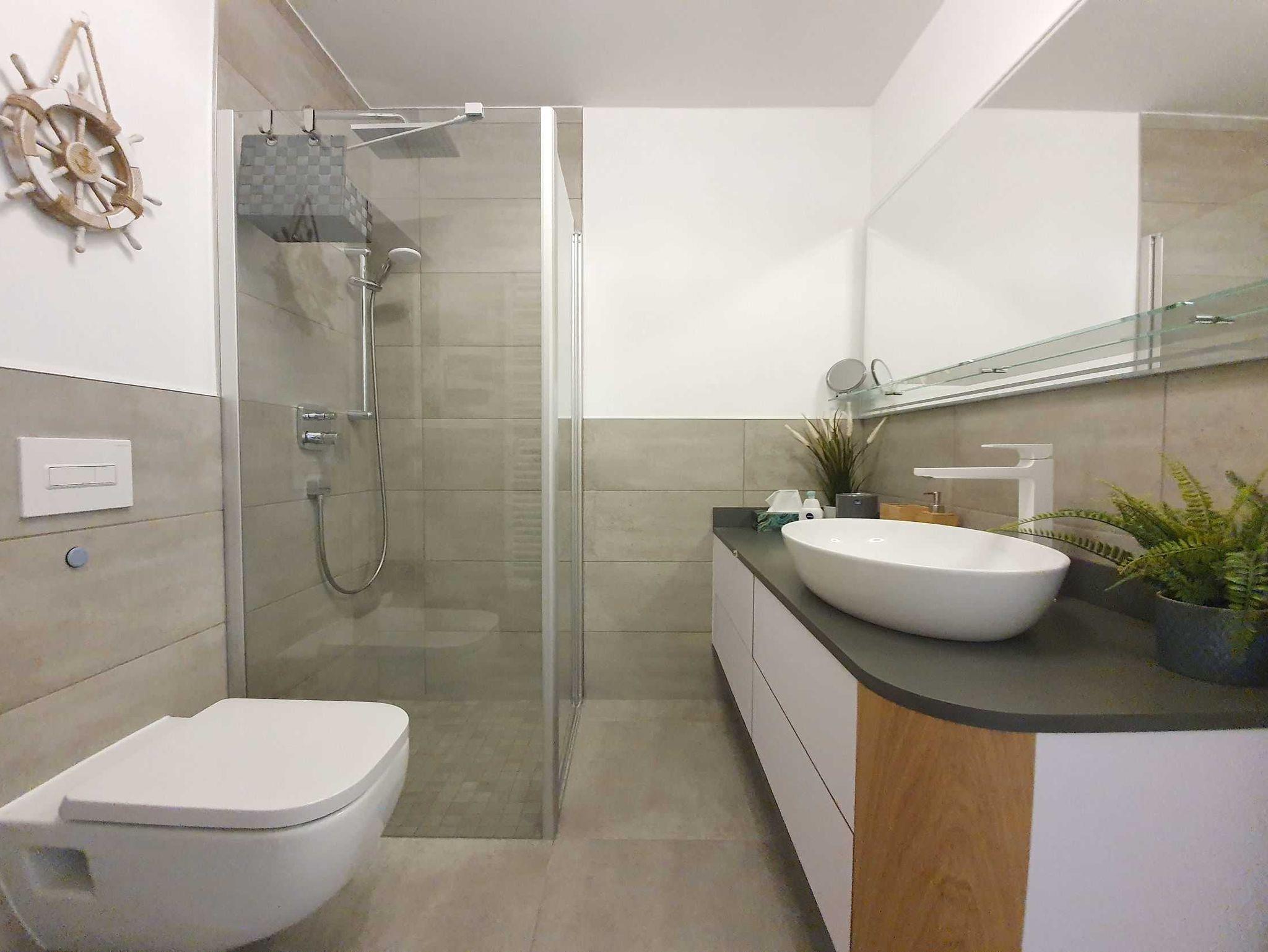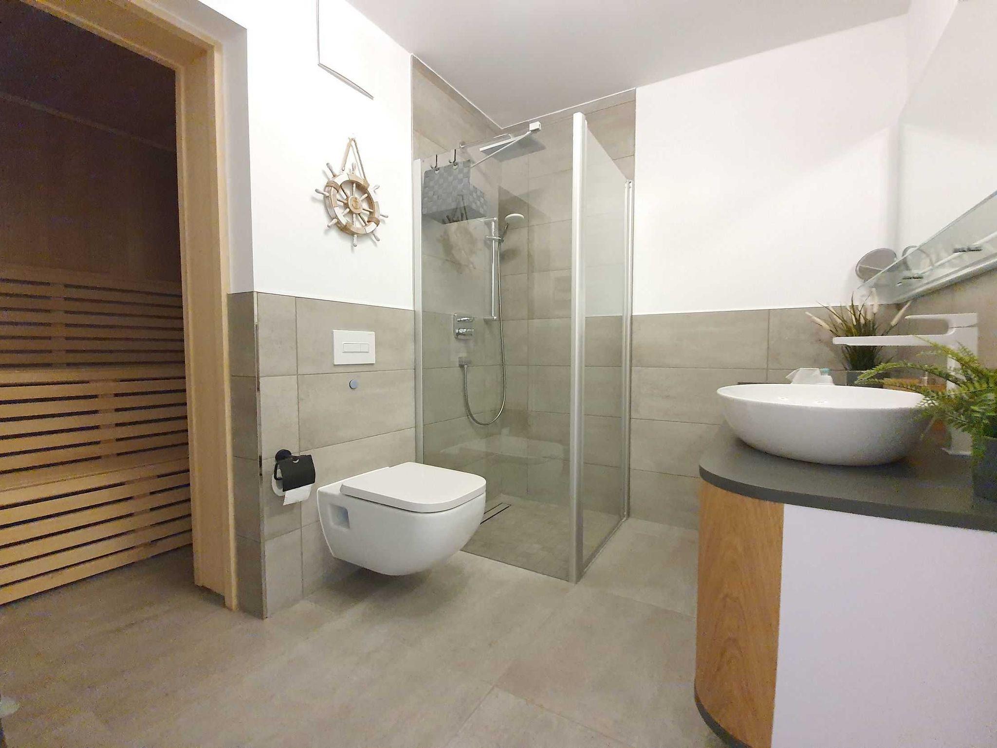 Das Bad ist mit einer ebenerdigen Dusche, Haartrockner und WC ausgestattet. Die Sauna und Fußbodenheizung komplettieren das Apartment.