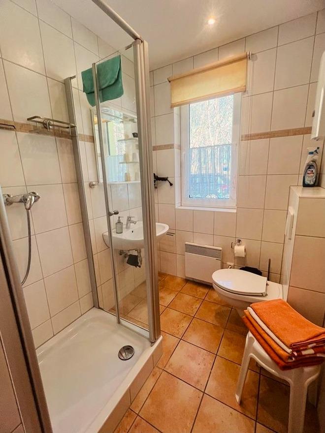 - Ein modernes Badezimmer mit Dusche und WC