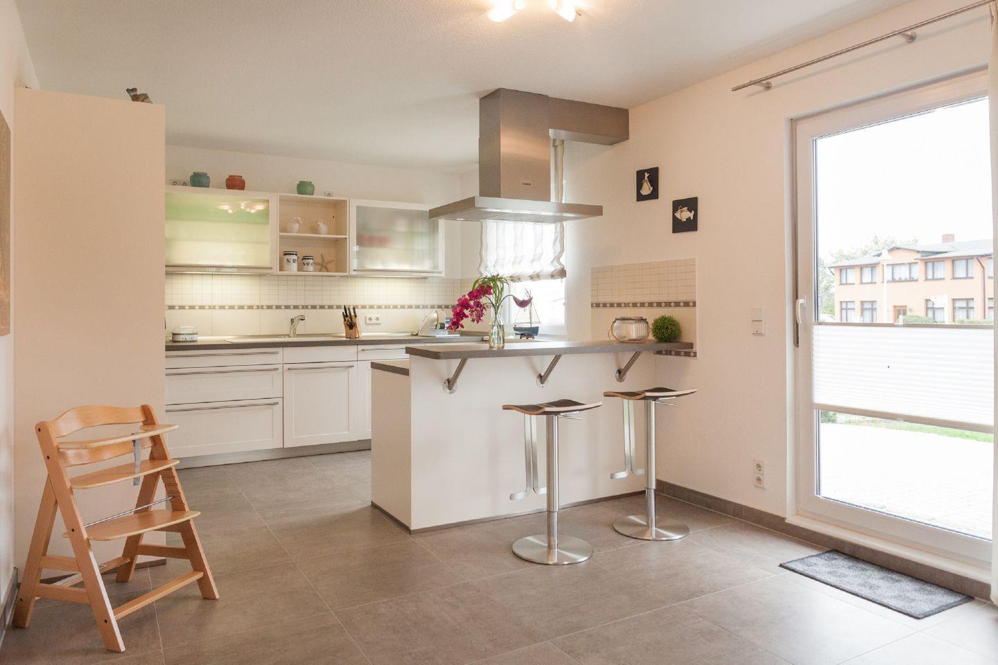 KÜCHE // offene Küche mit Kochinsel und Sitztresen, Induktionsherd, Mikrowelle, Spülmaschine, Kühlschrank, Backofen, Toaster, Wasserkocher, Kaffeemaschine, reichlich Besteck, Geschirr und Küchenutensilien ++
