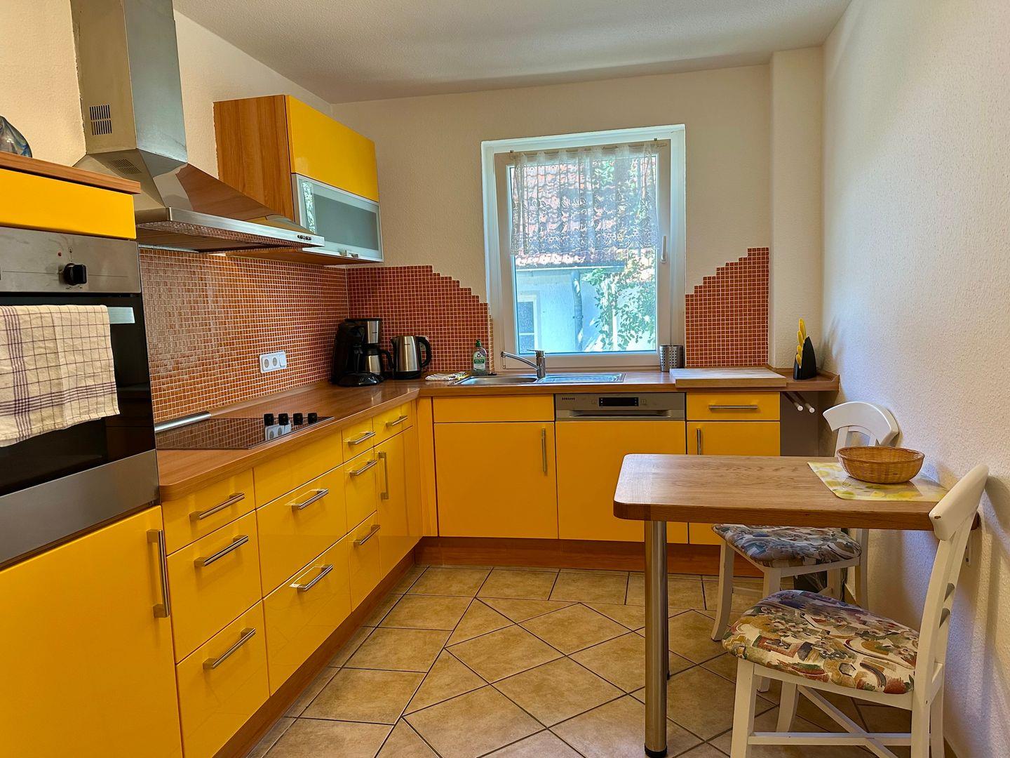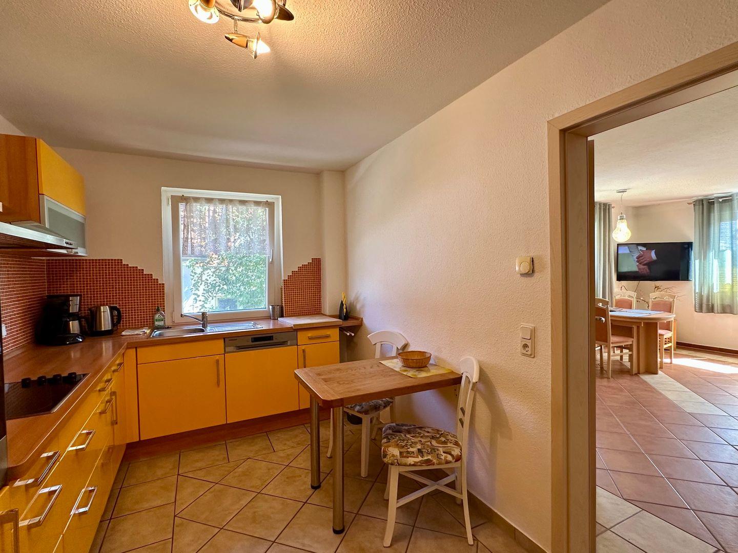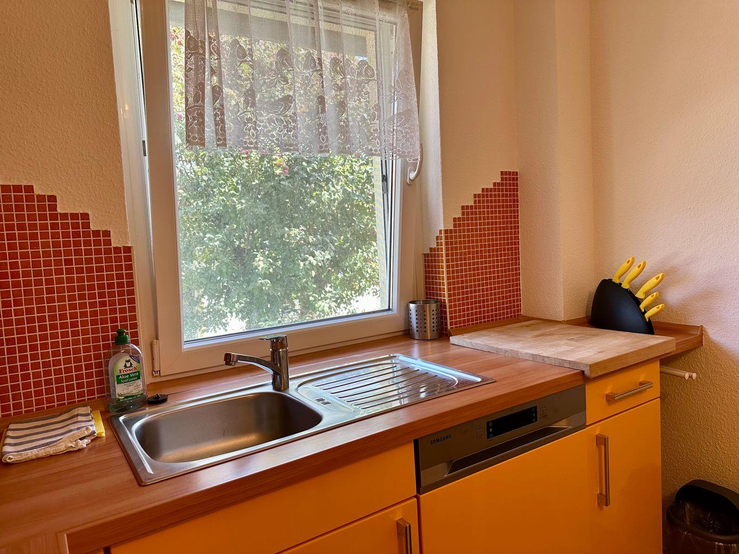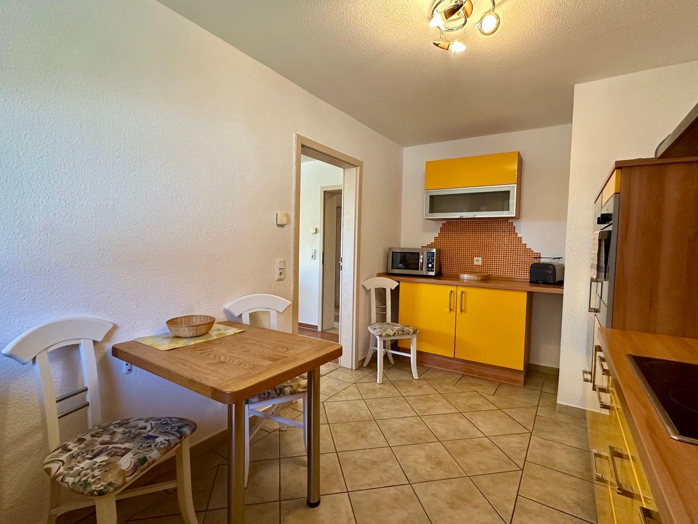Sie verfügt über ein großes, helles Wohnzimmer, eine voll ausgestattete Küche mit Geschirrspüler, Cerankochfeld, Kühlschrank, Mikrowelle, Kaffeemaschine, Toaster und Wasserkocher sowie ein modernes Bad mit WC.
