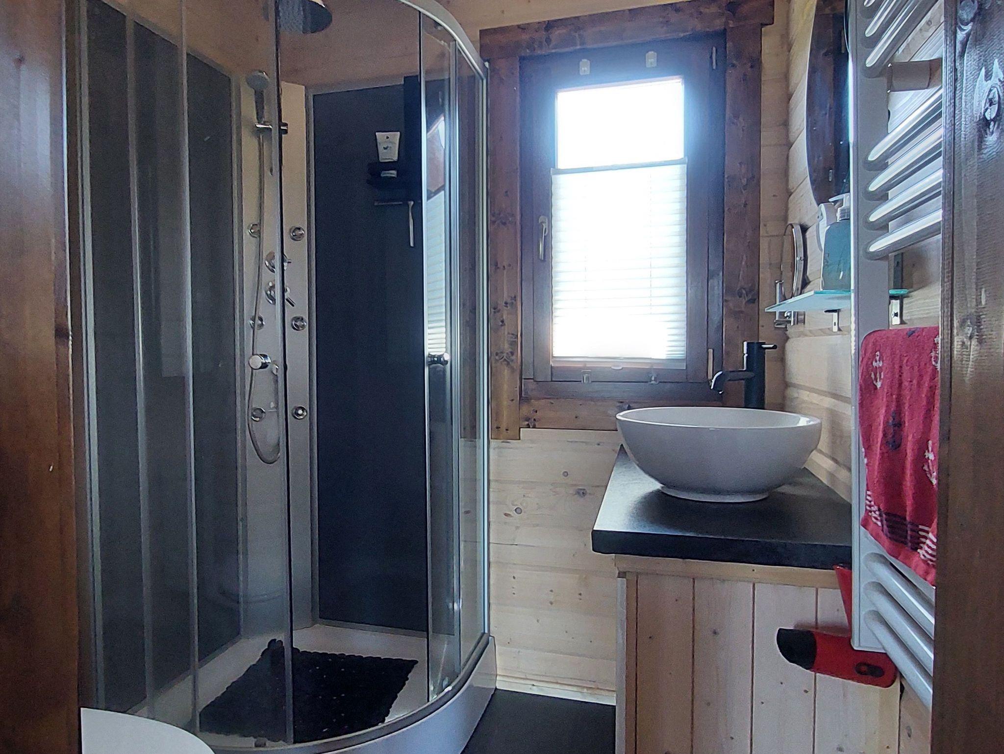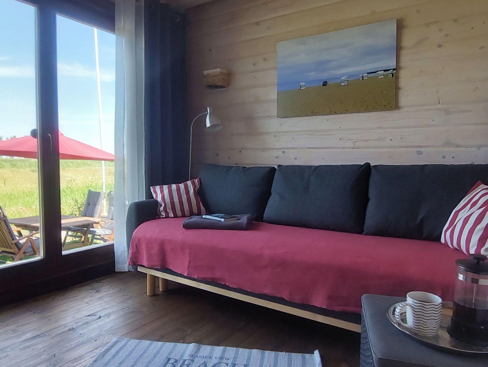 Das lichtdurchflutetet Blockhaus hat einen großzügigen Wohnbereich mit Küchenecke. Das Schlafzimmer ist mit einer französische Liege ausgestattet. Das zweite Zimmer mit Blick zum Deich verfügt über ein Schlafsofa ebenfalls für 2 Personen. Das Badezimmer mit Fenster ist mit WC, Waschbecken und Dusche, sowie einem elektr. Handtuchwärmer & Fön ausgestattet.