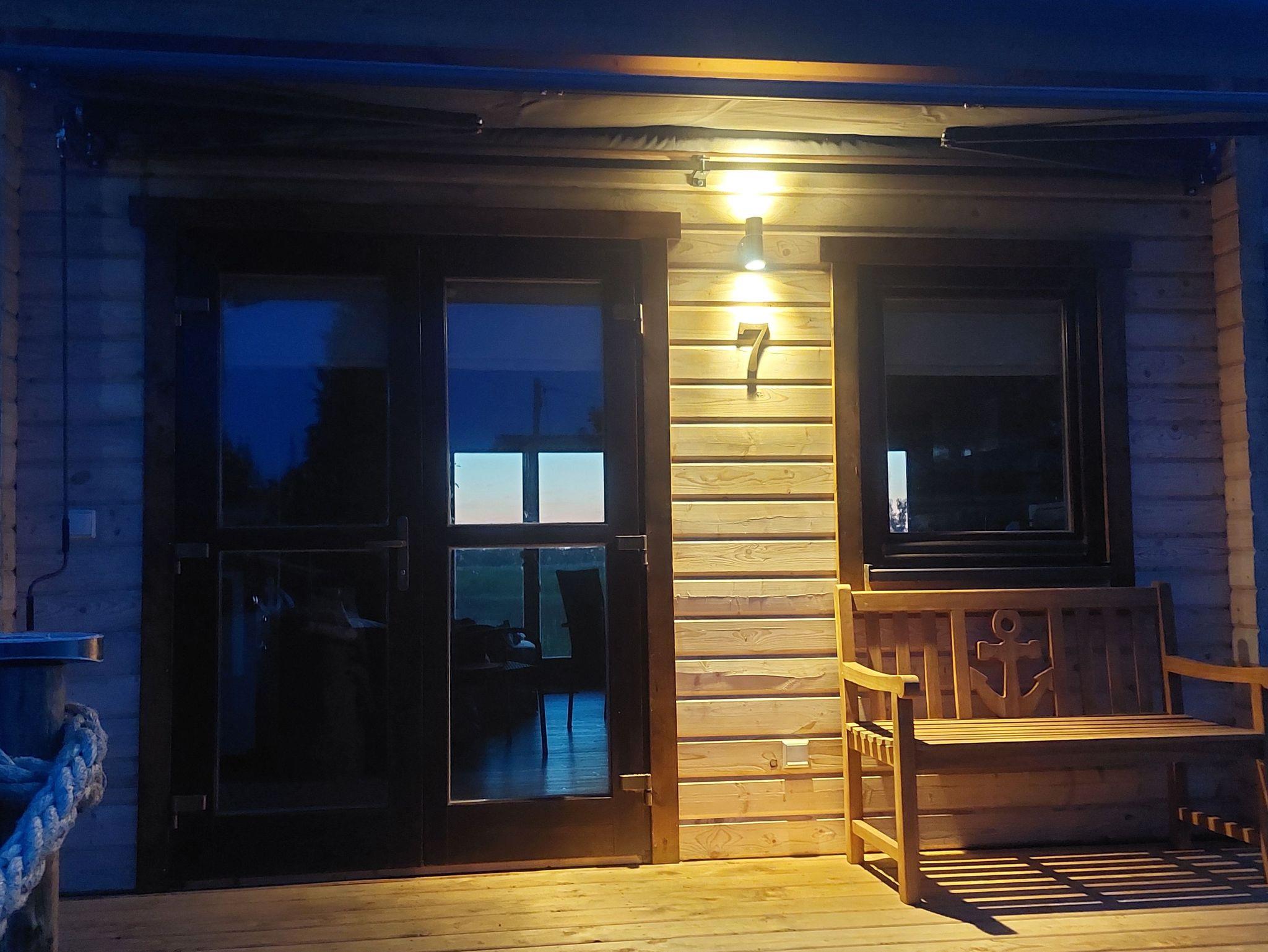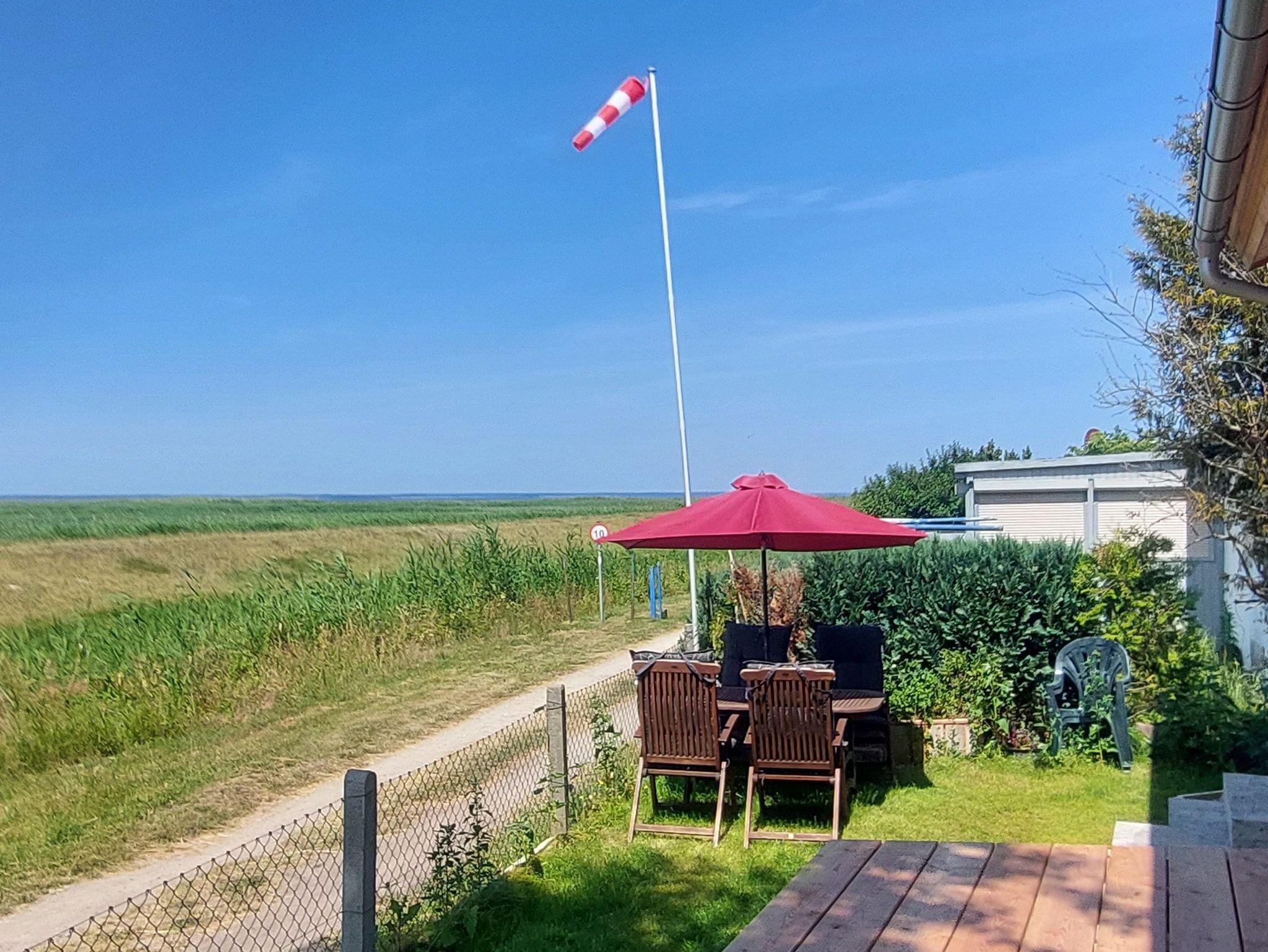 Man betritt das Haus über eine Terrasse mit einer hübsche Bank, hinter dem Haus ist zu Deich eine große Terrasse mit einem 3sitzer Strandkorb von dem aus man die Segel über das Haff gleiten sieht.