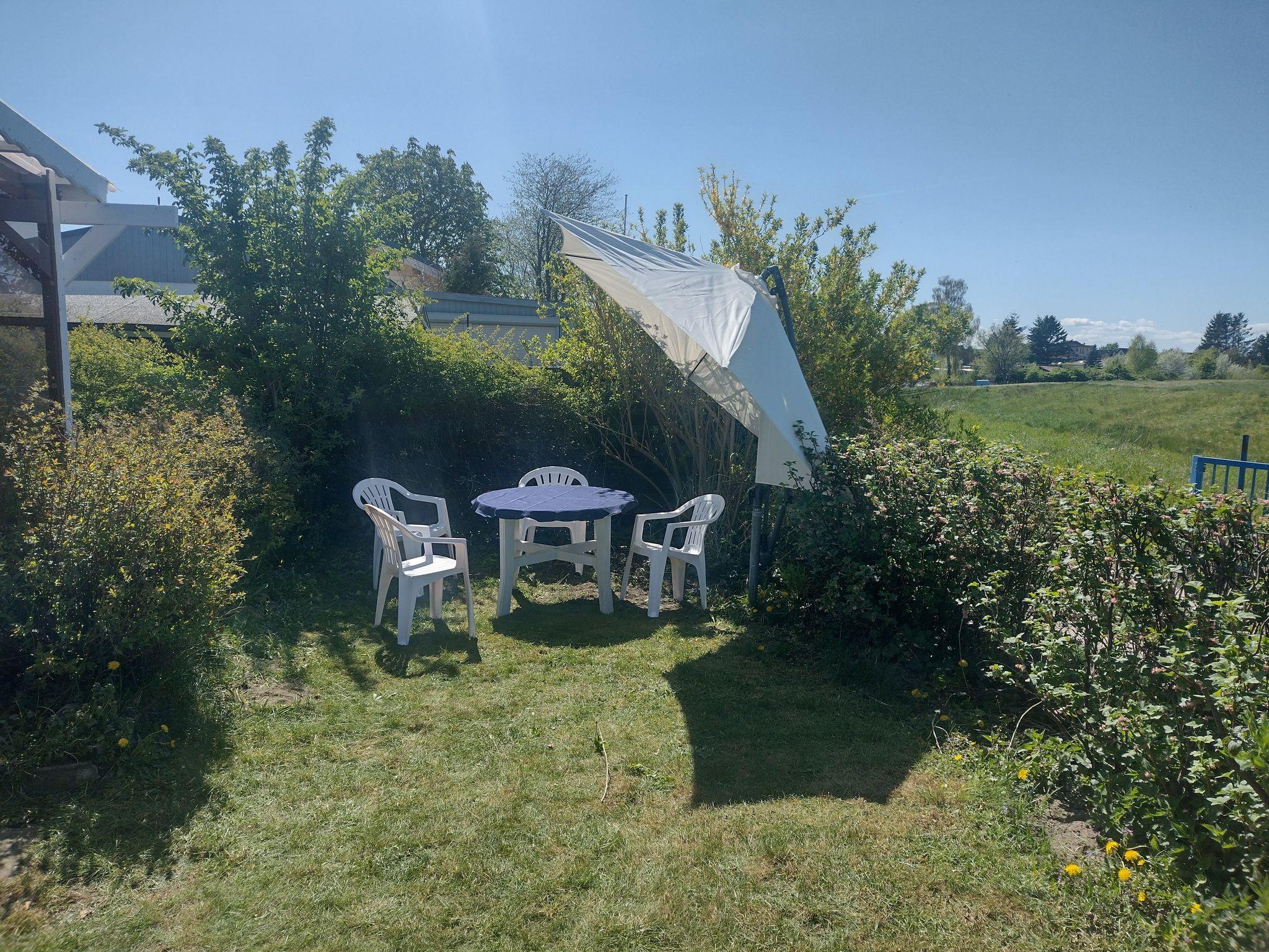 Vor dem Bungalow befindet sich eine großzügige überdachte Terrasse mit 2 Tischen und Stühlen sowie ein klimafreundlicher Naturgarten. Sonnenschirm und ein Grill sind vorhanden.