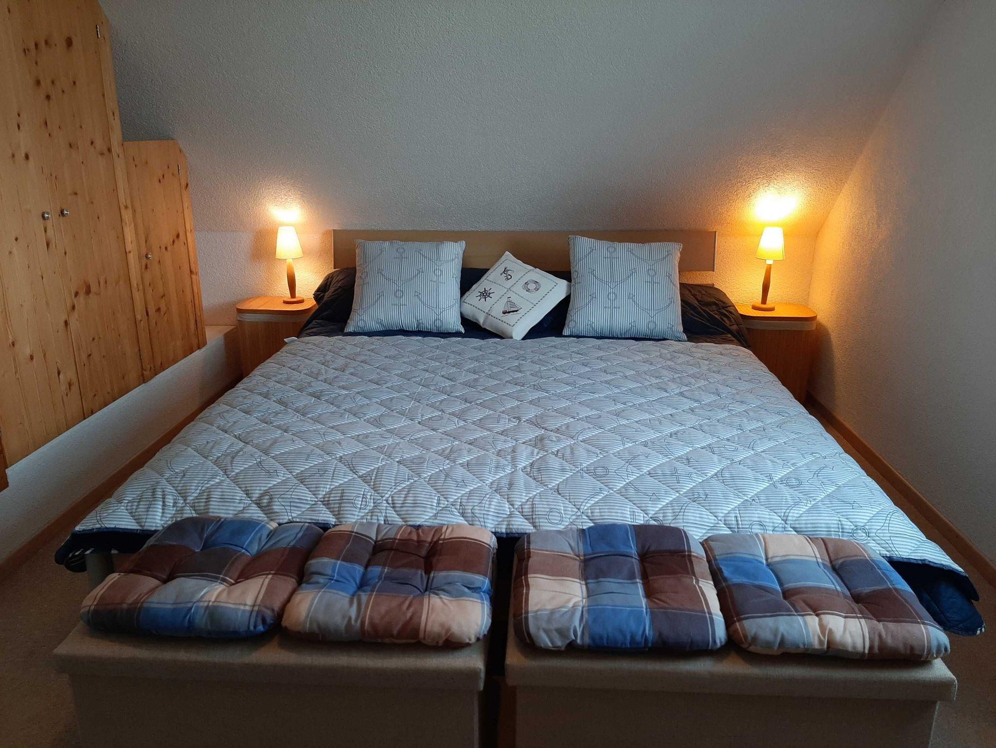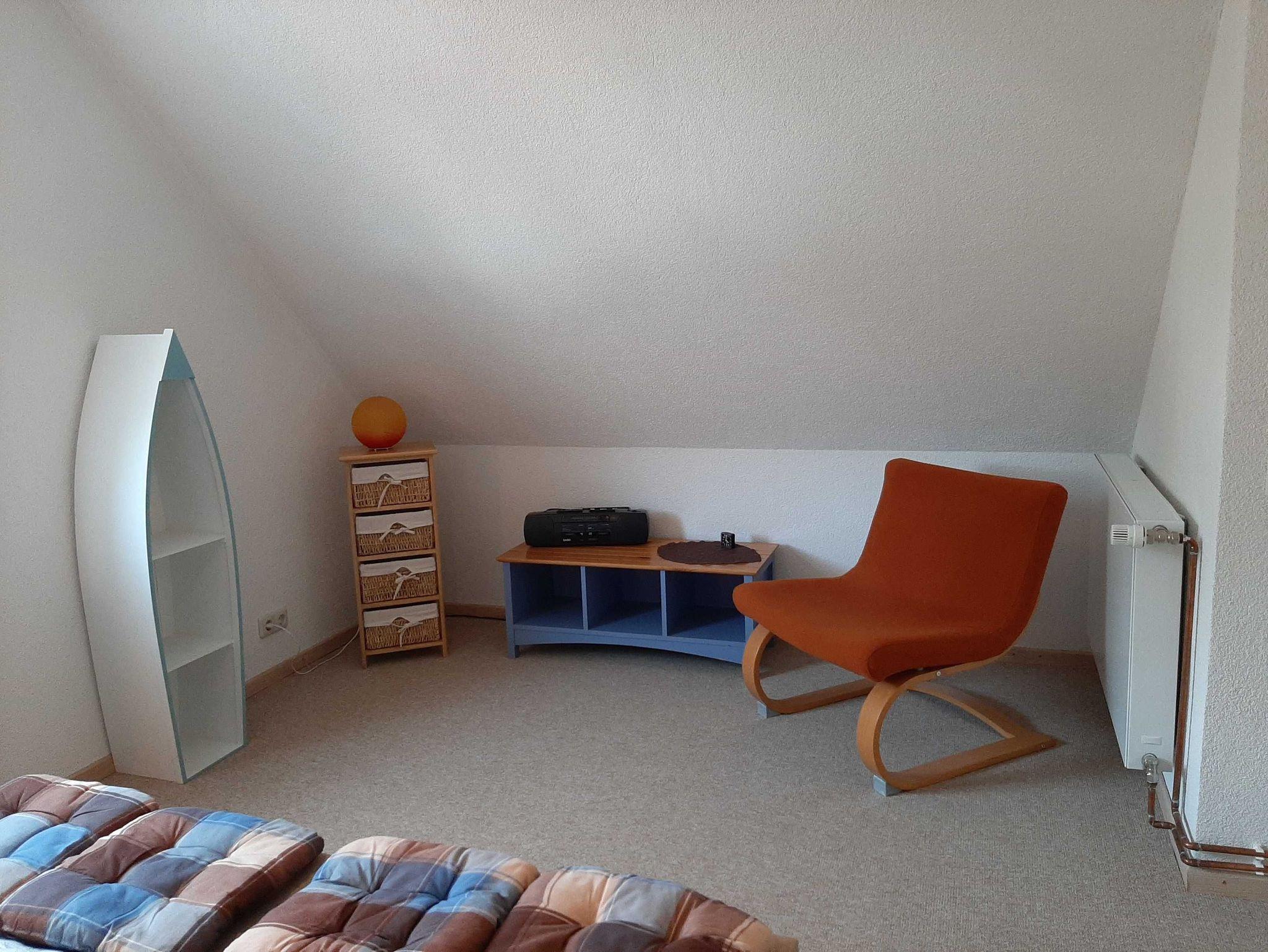 Im Dachgeschoß befindet sich das Schlafzimmer mit Doppelbett und Sitzmöglichkeit.