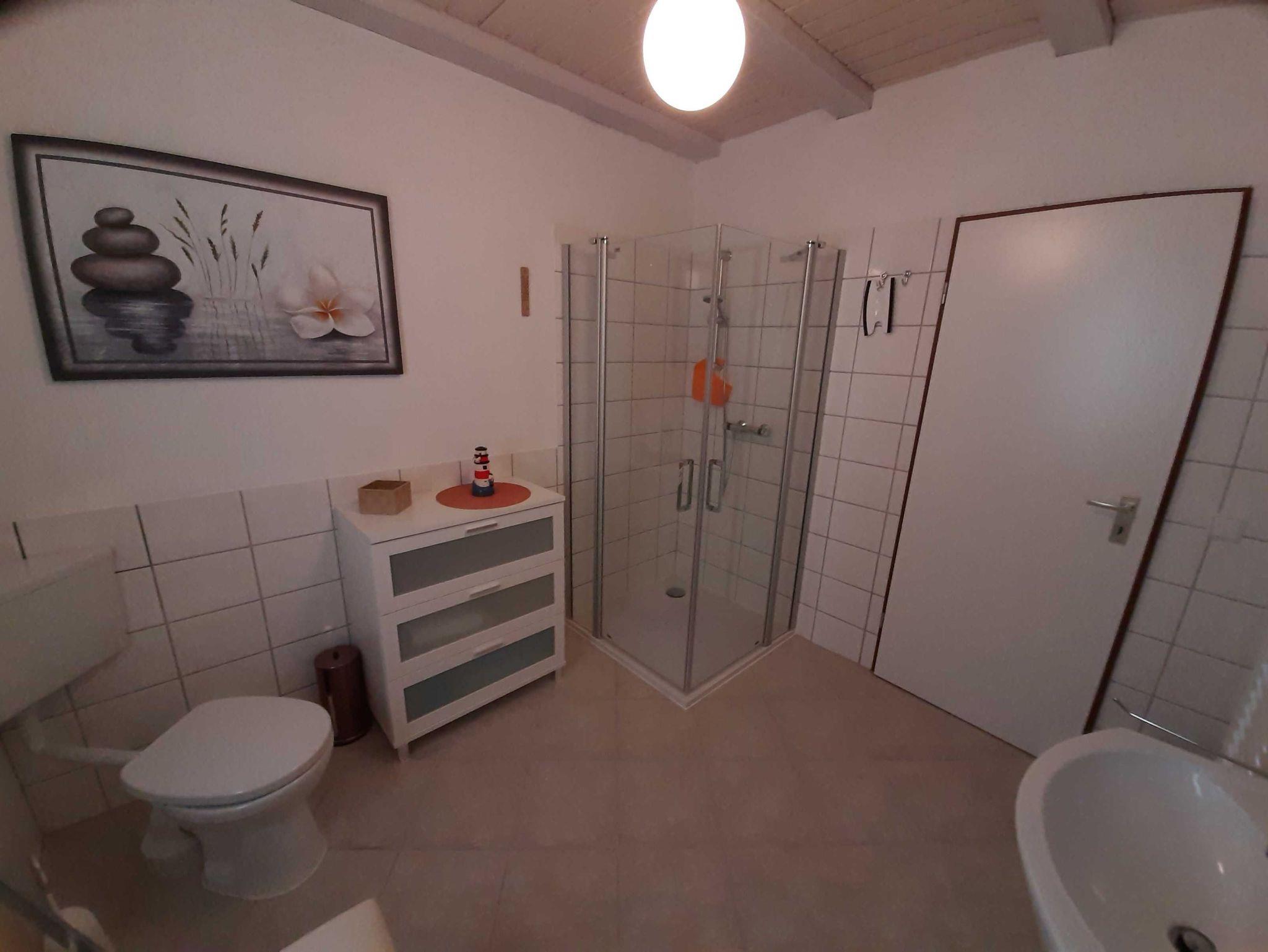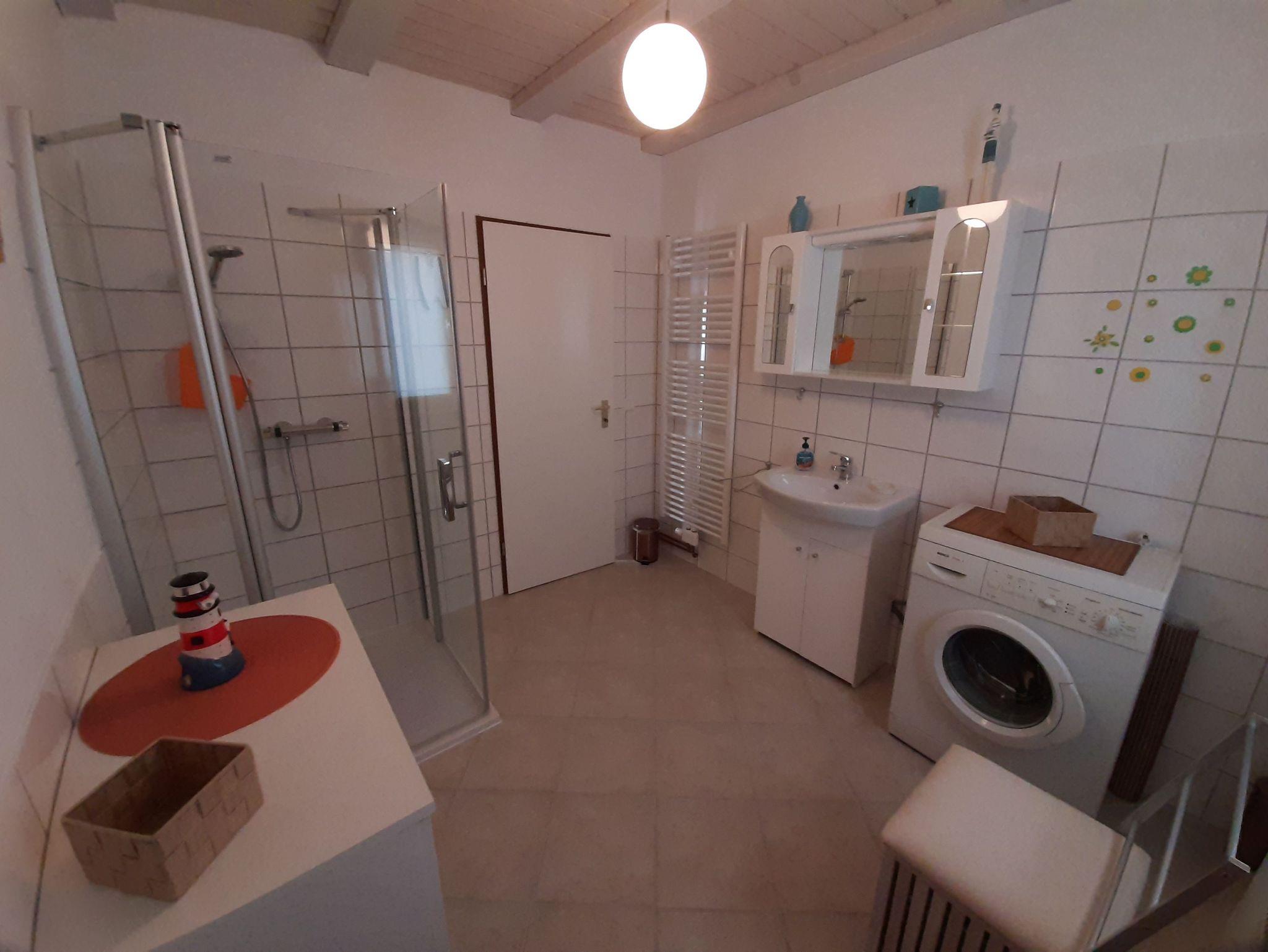 Das Bad ist mit einer ebenerdigen Dusche, Waschplatz, WC und Wachmaschine ausgestattet.