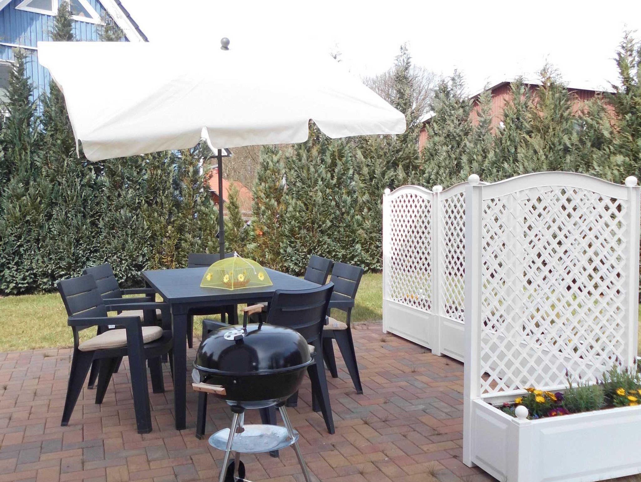 Auf der großen Terrasse laden Gartenmöbel in Form eines Tisches mit sechs Stühlen zum Verweilen ein. Ein kleiner Gartengrill, eine Wiesenfläche und ein eigener PKW-Stellplatz sowie eine Fahrradabstellmöglichkeit (Fahrradständer) stehen den Gästen zur freien Verfügung. Allerdings sind Liegestühle und Strandlaken selbst mitzubringen. Tiere sind im Haus nicht erlaubt. Das Rauchen ist zwar auf dem Gelände, nicht aber im Haus gestattet.