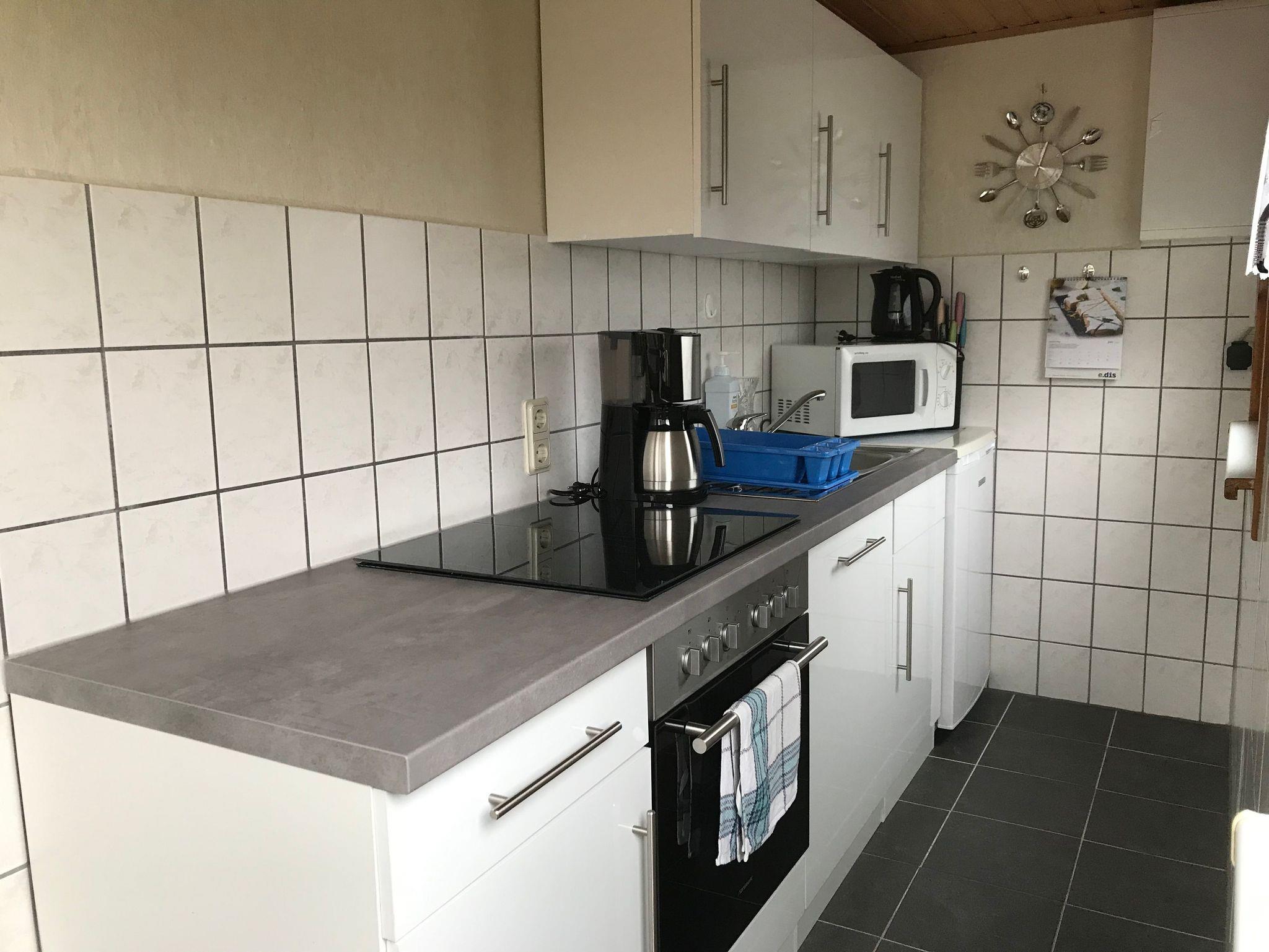 1 sep. Küche mit Geschirrspüler, Herd mit Backofen, Kaffeemaschiene, Mikrowelle, Geschirr, Töpfe u.s.w.