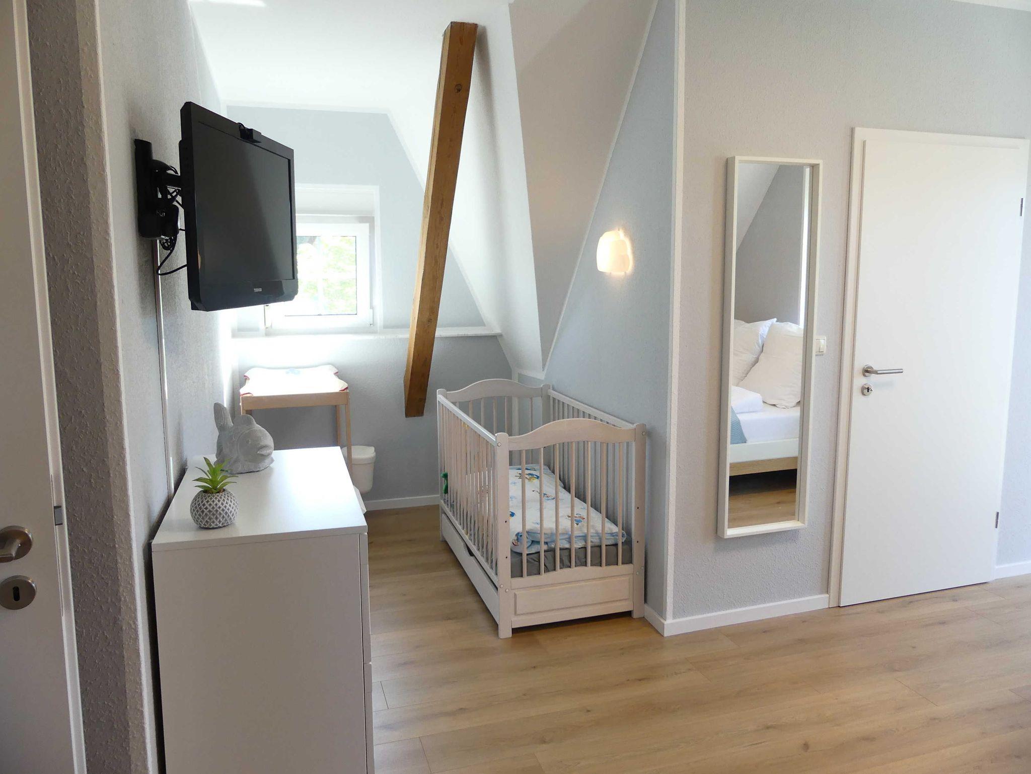 • In der oberen Etage befinden sich die Schlafräume. Ein Schlafraum ist mit einem Kinderbett und Wickeltisch ausgestattet.