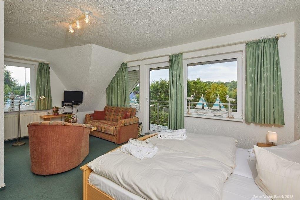 Gemütliches Doppelzimmer mit Balkon und Zugang zu Restaurant und Freizeitangeboten in Mühbrook.