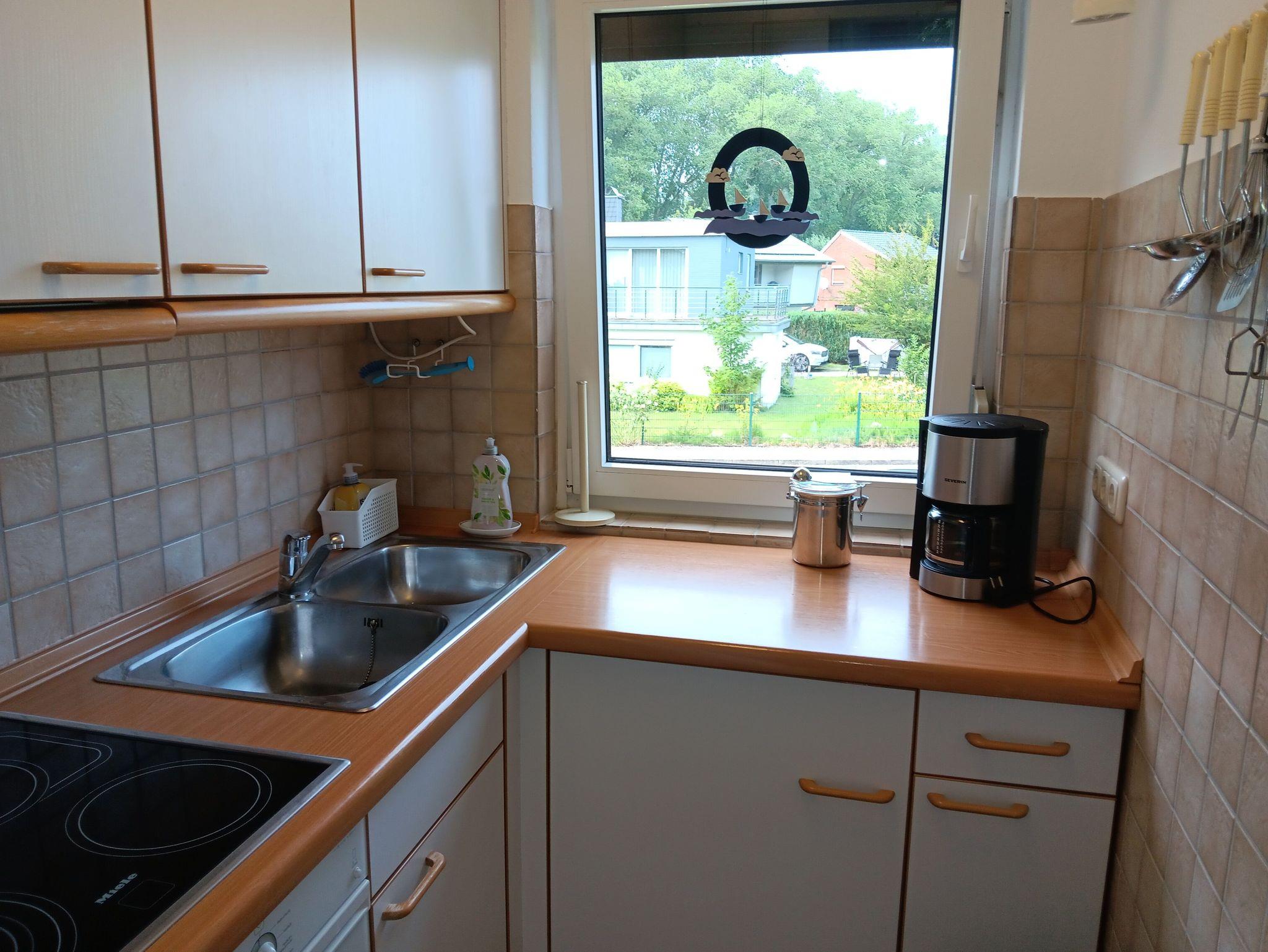Im Ferienhaus Haus Noorblick befindet sich ebenerdig ein Schlafzimmer mit 2 Betten und der Zugang zur Terrasse und dem Garten, sowie ein Gästebad und ein Hauswirtschaftsraum mit Wach- und Trockenmaschine, sowie einer Tiefkühltruhe.
