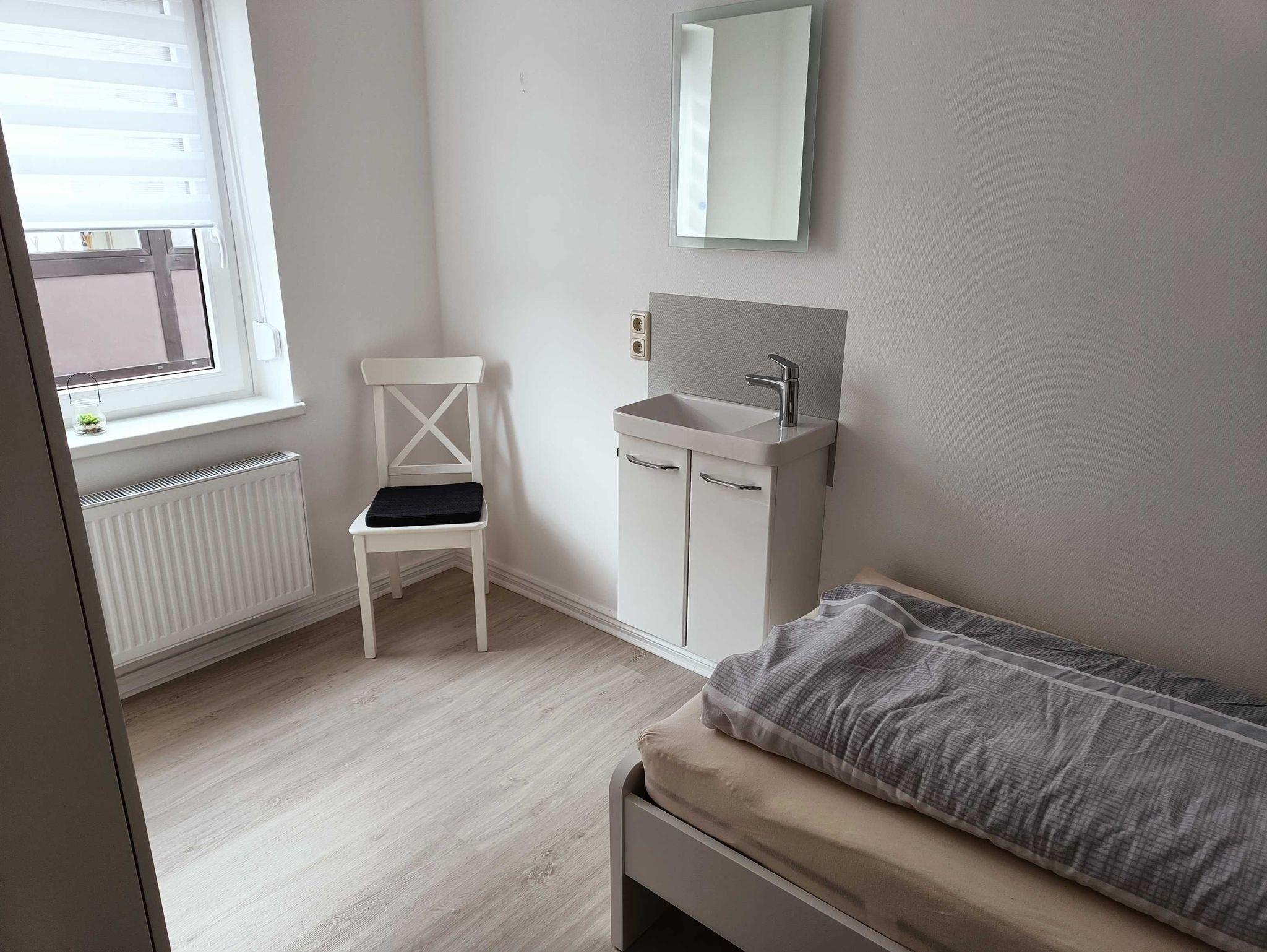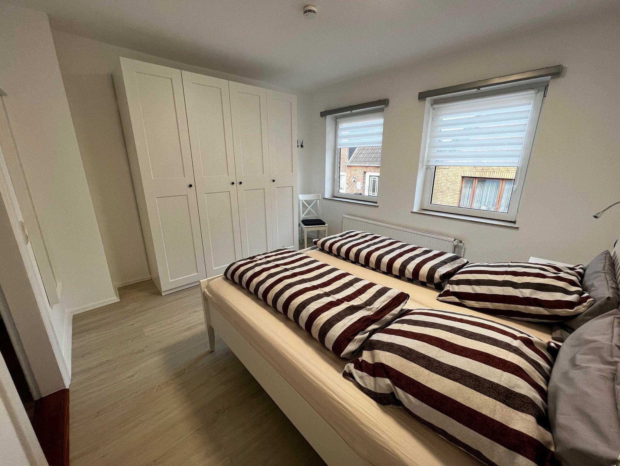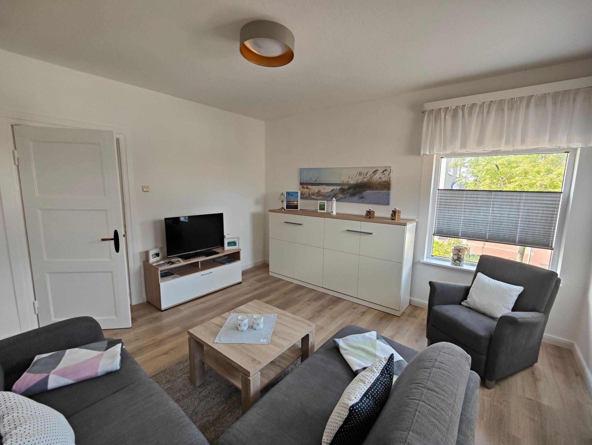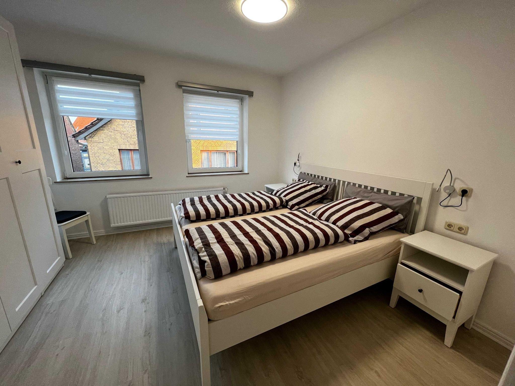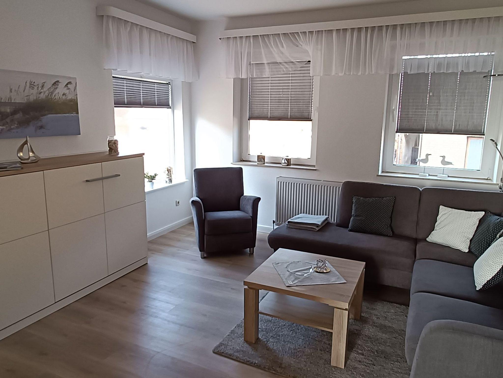 Ferienwohnung EG (70 m²), 1 Wohnraum, 1 Schlafzimmer mit Doppelbett, 1 Schlafzimmer mit Einzelbett, 1 Schlafmöglichkeit im Wohnbereich (Schrankbett), Küche mit Geschirrspüler, Dusche und WC (getrennt).