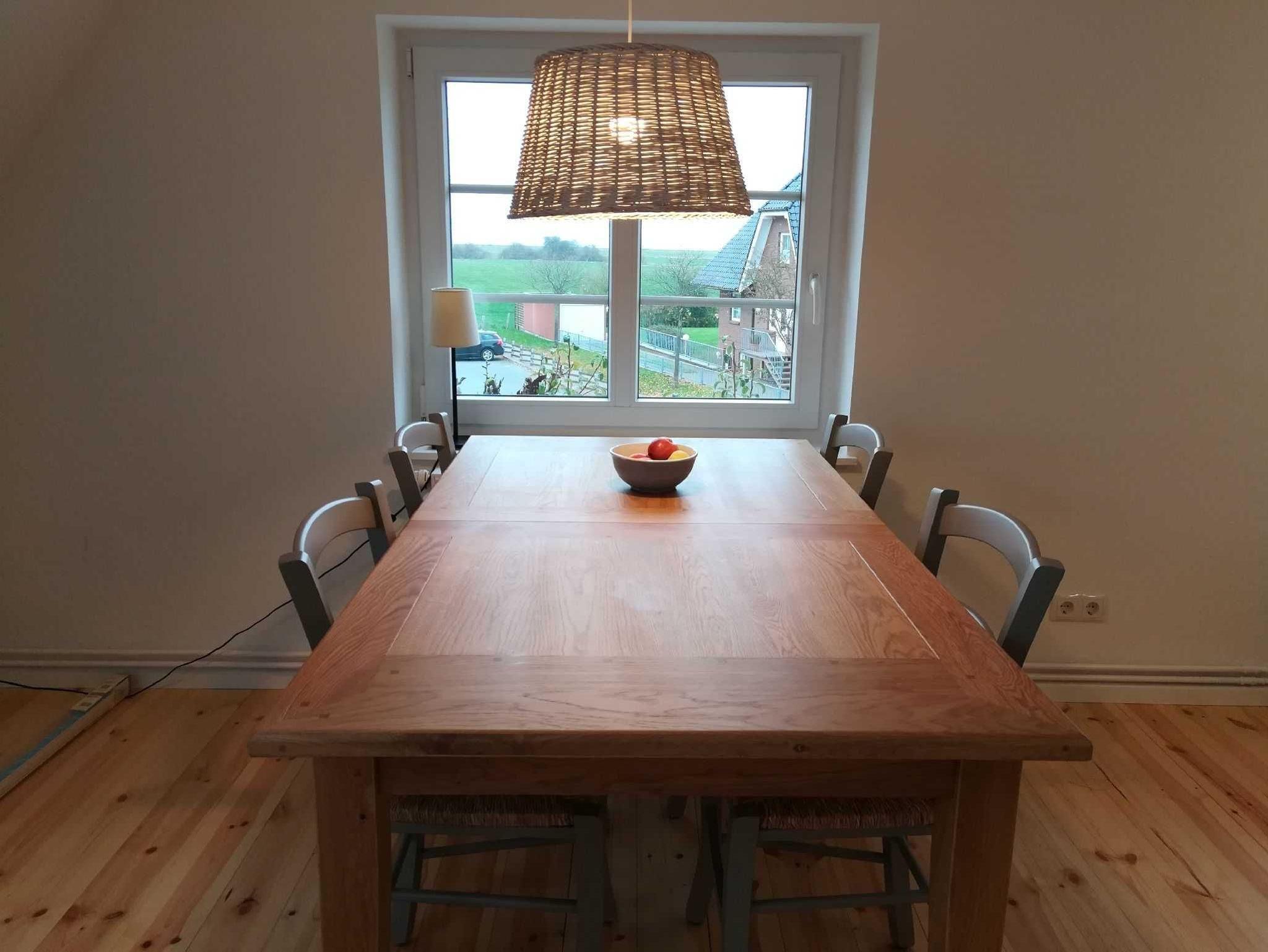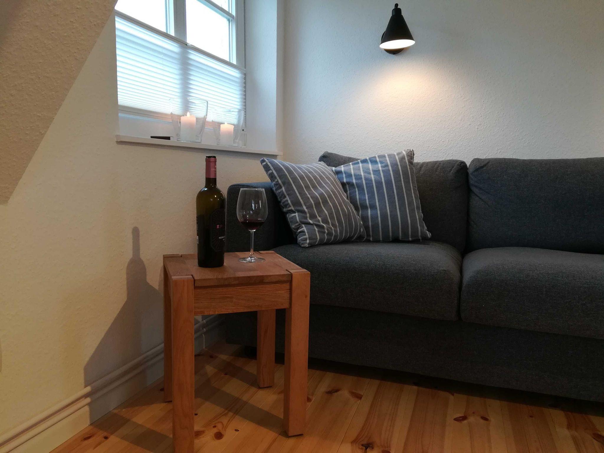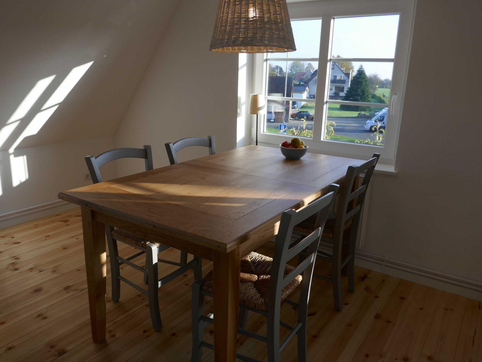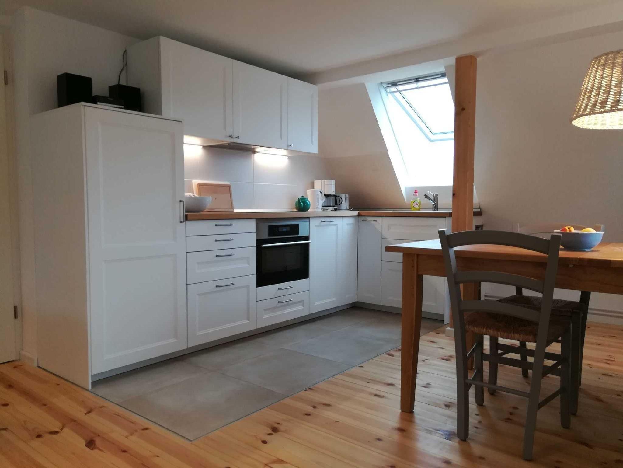 Durch einen ruhigen, umzäunten, mit Rosen bewachsenen Garten vorbei an der Terrasse betreten Sie den unteren Flur mit der Garderobe. Wohnküche, Bad und ein Schlafzimmer liegen im ersten Stock, ein zweites Schlafzimmer im Spitzboden. In beiden Schlafzimmern stehen Doppelbetten (1,80 m bzw. 1,60 m mit jeweils 2 Einzelmatratzen). Die Holztreppe vom Erdgeschoß in die Wohnetage ist etwas steil. Küche und Bad sind komfortabel ausgestattet. Unsere Wohnung ist maritim eingerichtet und in beruhigenden Naturfarben und -Materialien gehalten. In der Wohnetage verbreiten Holzböden und Fliesen Wohnlichkeit. Das Schlafzimmer im Spitzboden ist mit einem Bioboden ausgelegt. Die Deckenhöhe beträgt wie bei alten Häusern häufig etwa 2,10 m. Die Wohnung ist durch viele Fenster lichtdurchflutet. Sie ist eine Nichtraucherwohnung und für Haustiere nicht geeignet. Da die Erdgeschosswohnung vermietet ist, überlegen Sie bitte, ob sie bei mehr als zwei kleinen Kindern passend ist. Treppenschutzgitter für kleine Kinder und ein Kinderbett stehen zur Verfügung.