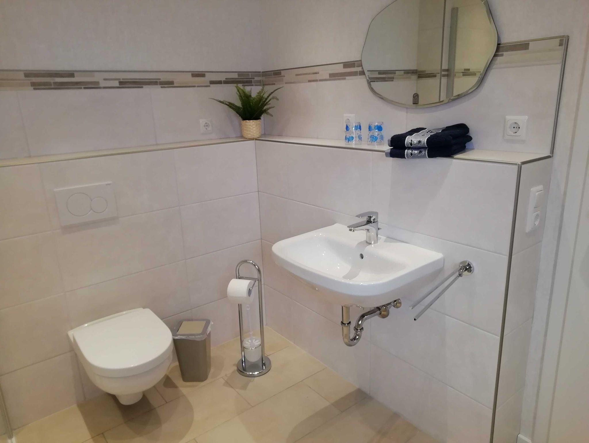 - zwei Treppenstufen führen in das Duschbad mit ebenerdigem Duscheinstieg, Fußbodenheizung und Haartrockner; Handtücher inklusive