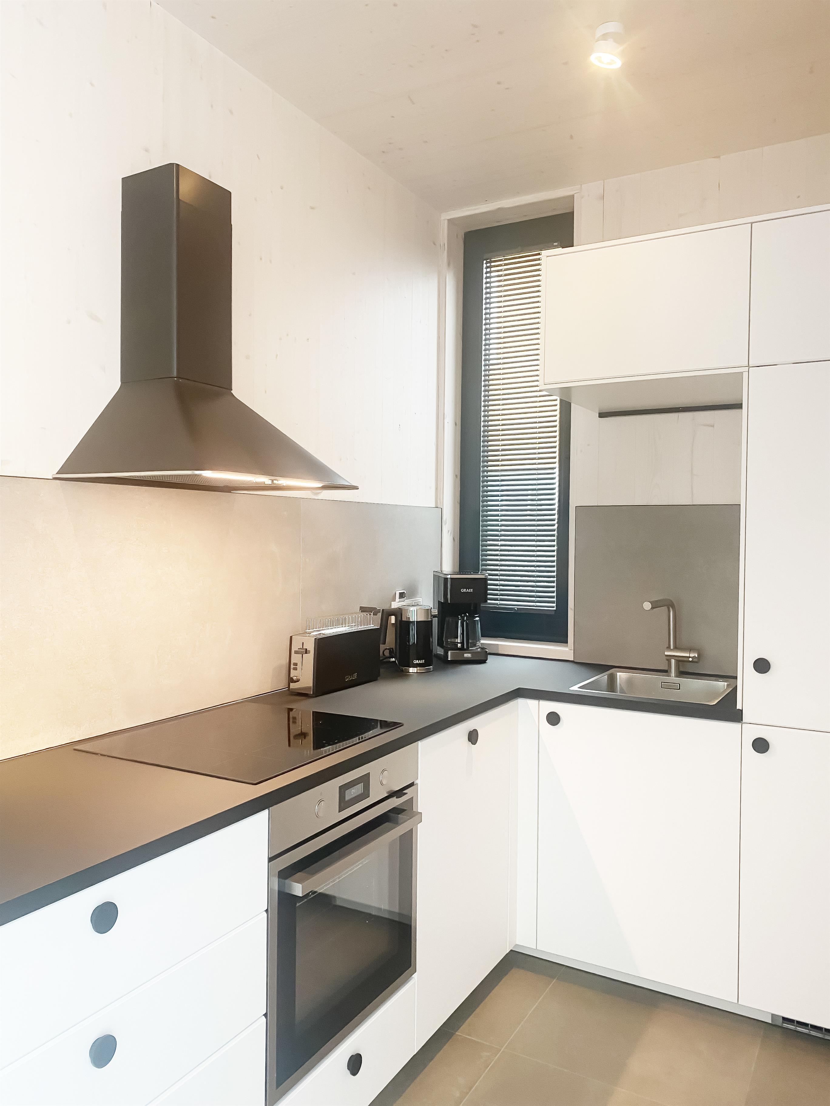 Der Esstisch lädt zu ausgiebigen Frühstücken mit Blick in den Garten oder zu geselligem Essen und Zusammensein ein. Die offene, moderne Küche, komplett ausgestattet, schließt sich direkt an den Wohn- und Essbereich an und unterstreicht den Loft-Charakter der Ferienwohnung.