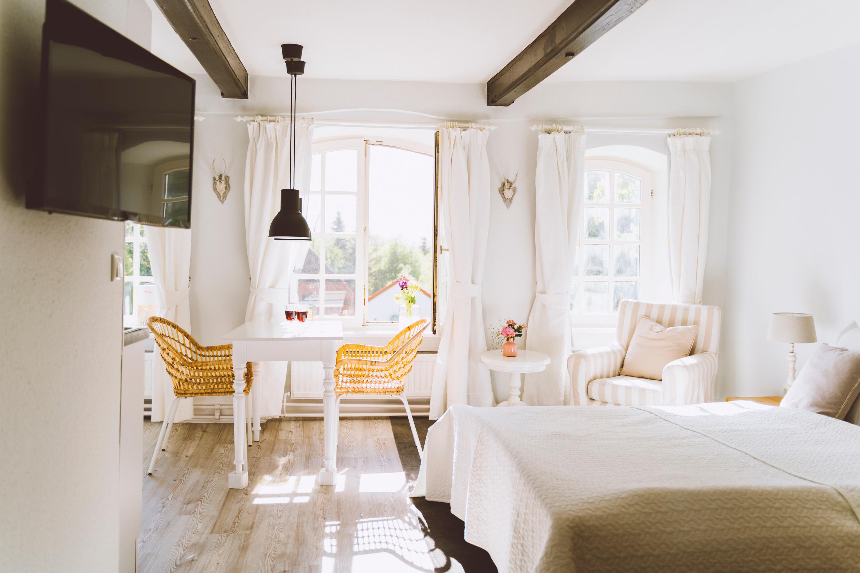 Genießen Sie Ihr kleines Urlaubsreich für zwei. Beim Ausschlafen im gemütlichen Boxspringbett. Beim Frühstücken mit Blick auf den Gutshof. Beim gemeinsamen Kochen. Beim Essen bei einem Glas Wein. Einfach wohlfühlen.
