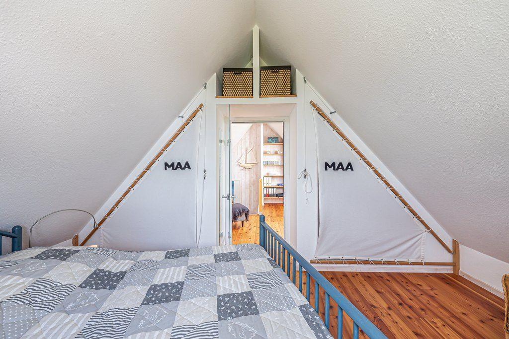 Das Bett im Dachgeschoss hat die Maße 2x 80x200 cm und verfügt über ein verstellbares Lattenrost - der Kleiderschrank ist hinter den Segeln versteckt.