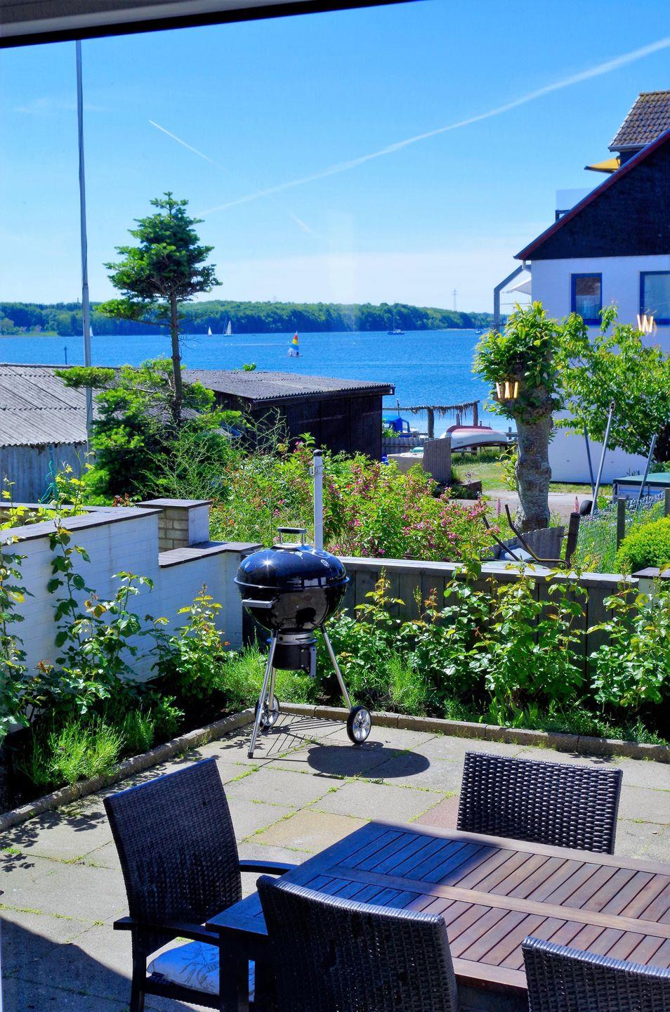 Im großen eingezäunten Garten mit Terrasse und Schleiblick lässt es sich wunderbar toben und spielen oder einfach nur entspannen.