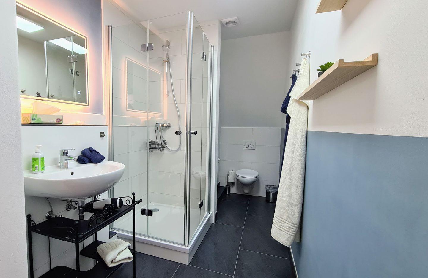 Das großzügige, neue Bad mit Dusche lässt Sie morgens frisch und gut gelaunt in den Tag starten.