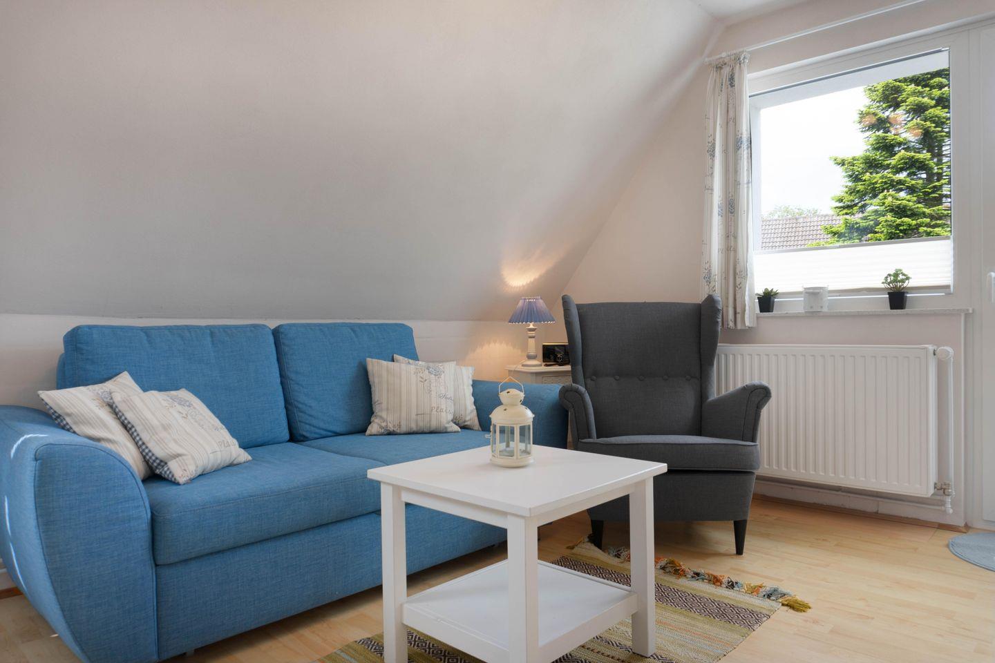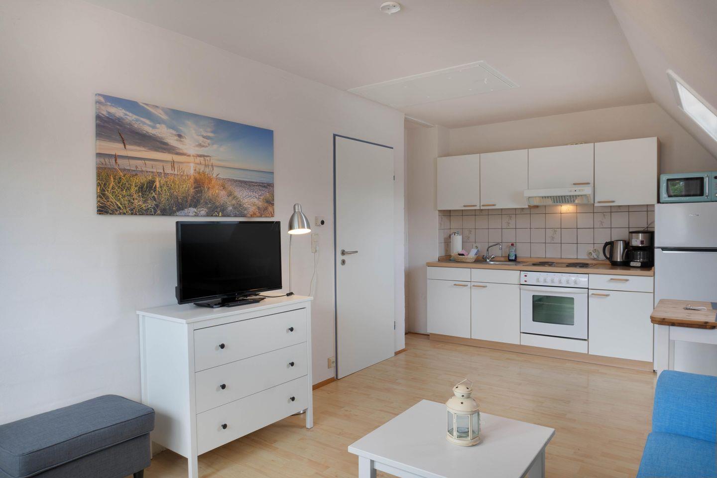 Ausserdem verfügt die Wohnung über ein Duschbad und ein Schlafzimmer mit zwei Einzelbetten, einen PKW Stellplatz und die Möglichkeit, Fahrräder oder mitgebrachte Wassersportgeräte unterzustellen.