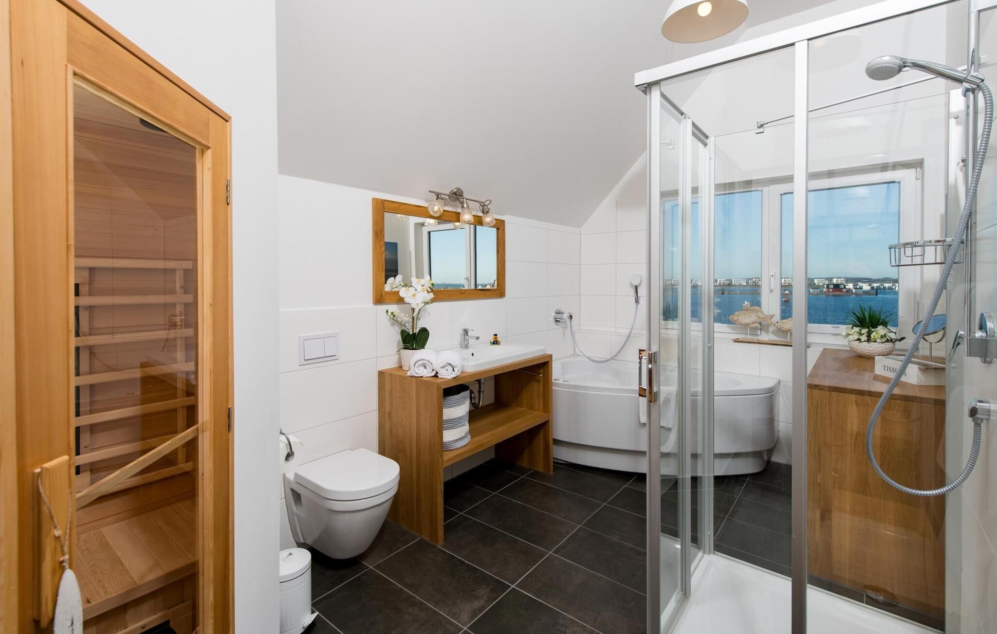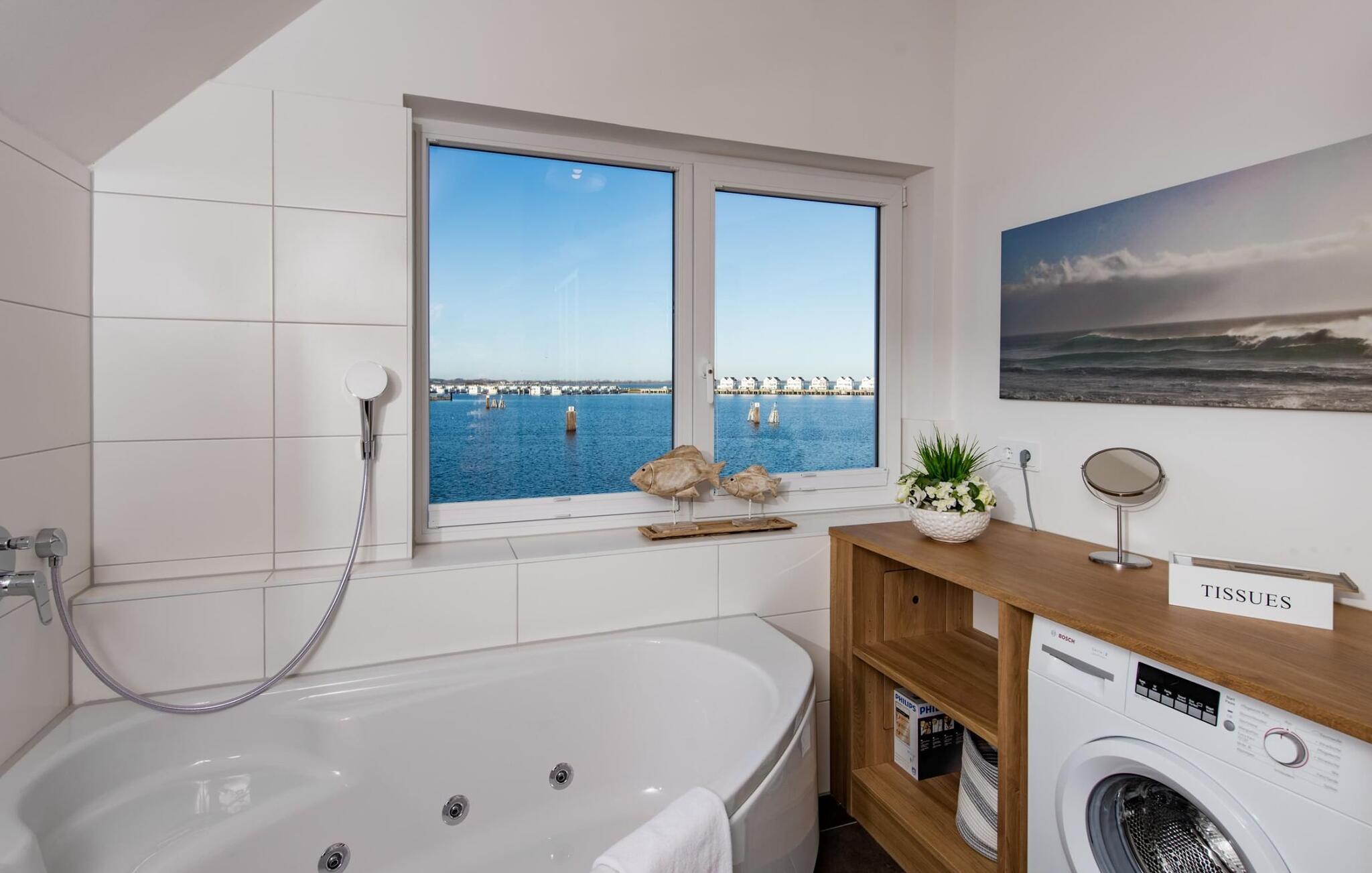 Der private Wellnessbereich lädt zum Entspannen ein: Eine Infrarot Wärmekabine mit Hifi-Sound-System und LED-Farblichttherapie sowie eine große Relax-Whirlpool-Badewanne mit Wasserblick stehen nach dem Strandspaziergang bereit.