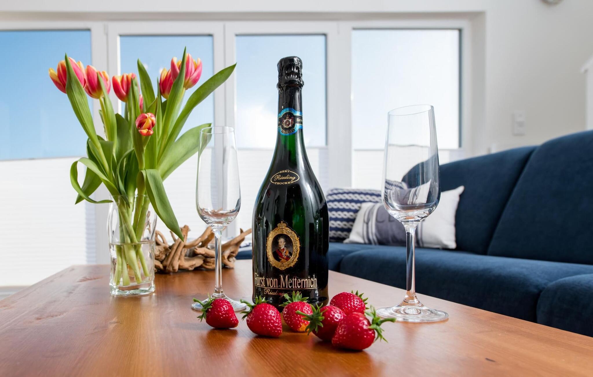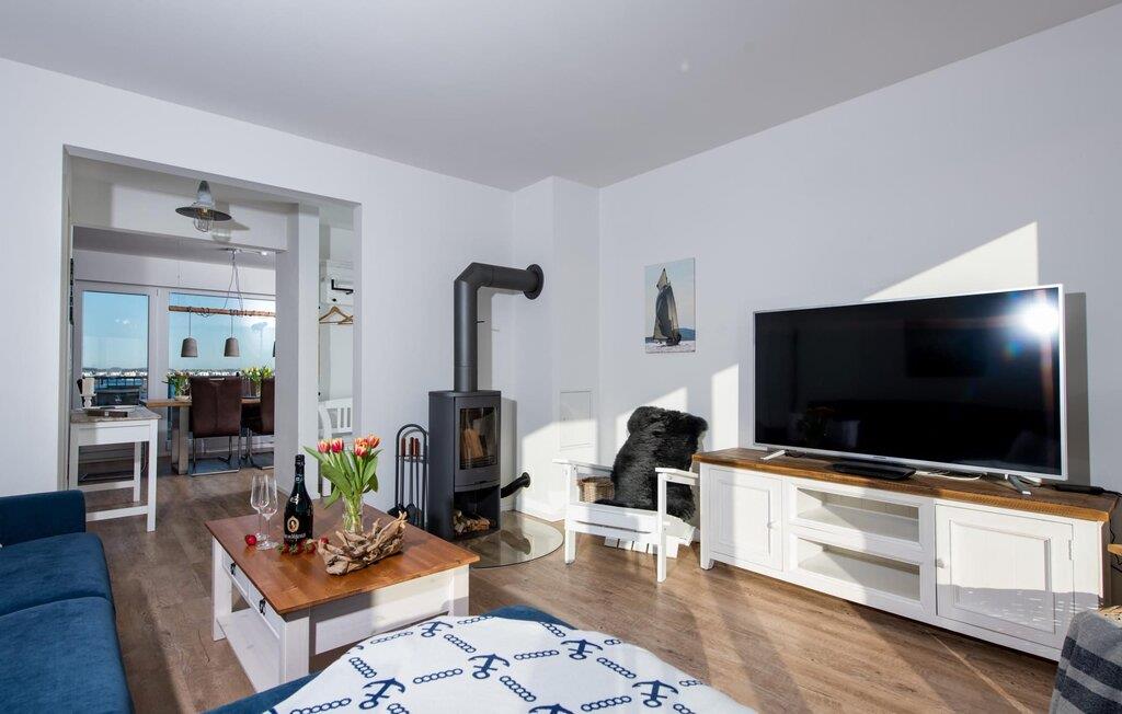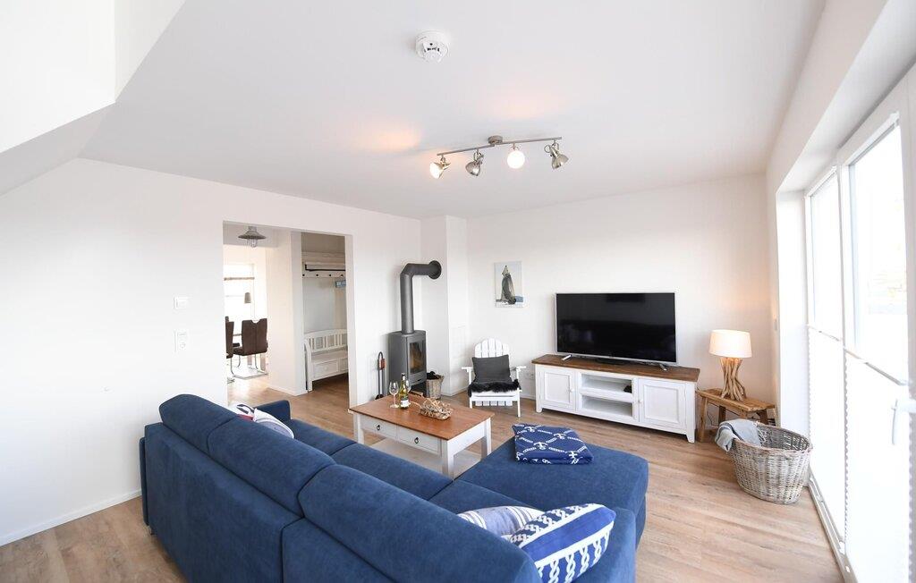 Kuschelig wird es im Wohnzimmer, denn hier lädt eine gemütliche Sitzlandschaft an Schietwettertagen zu einem Kaminabend ein. Für Indoor Entertainment sorgt außerdem der Smart TV mit Telekom Home Entertainment Programm.