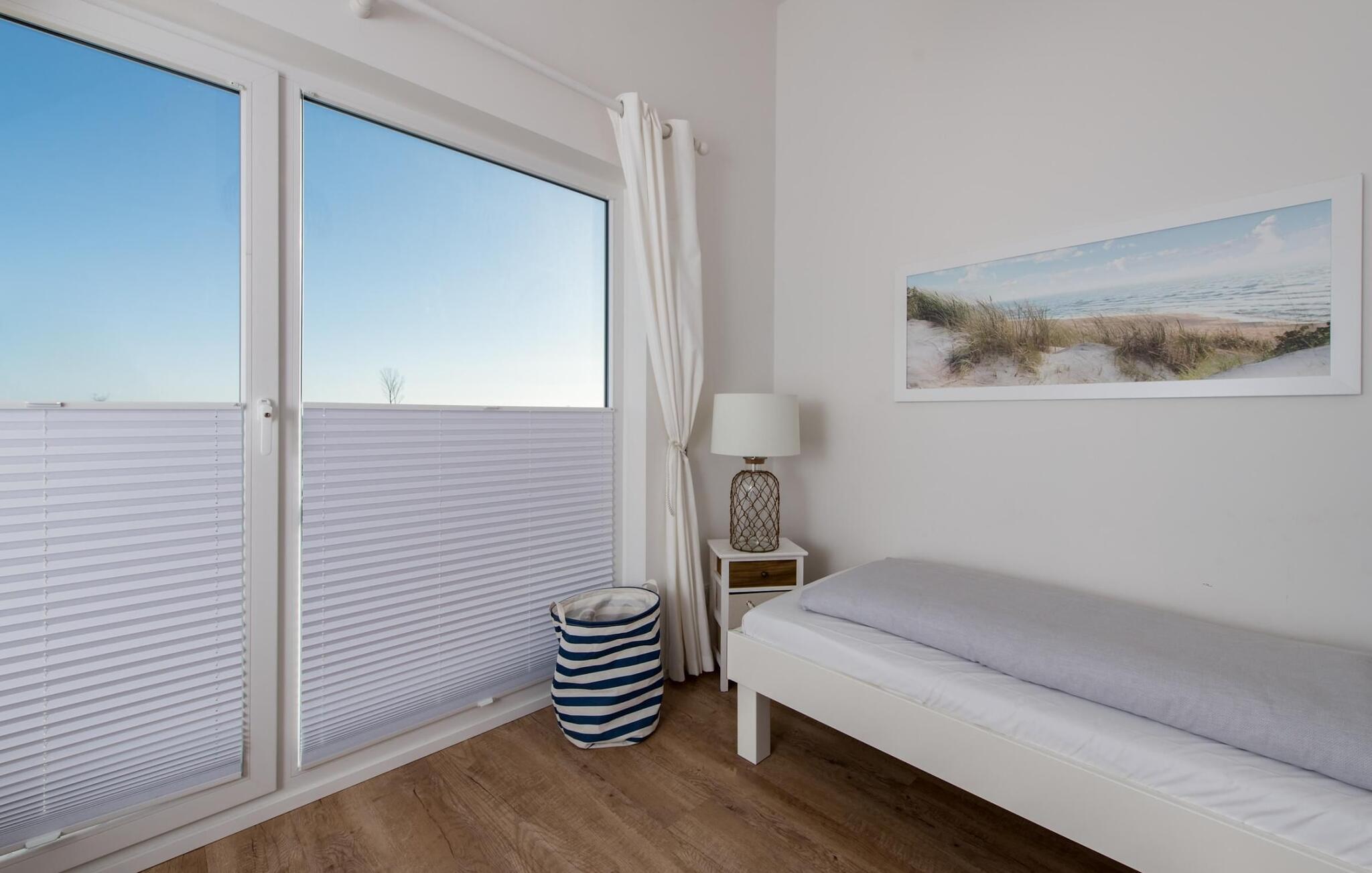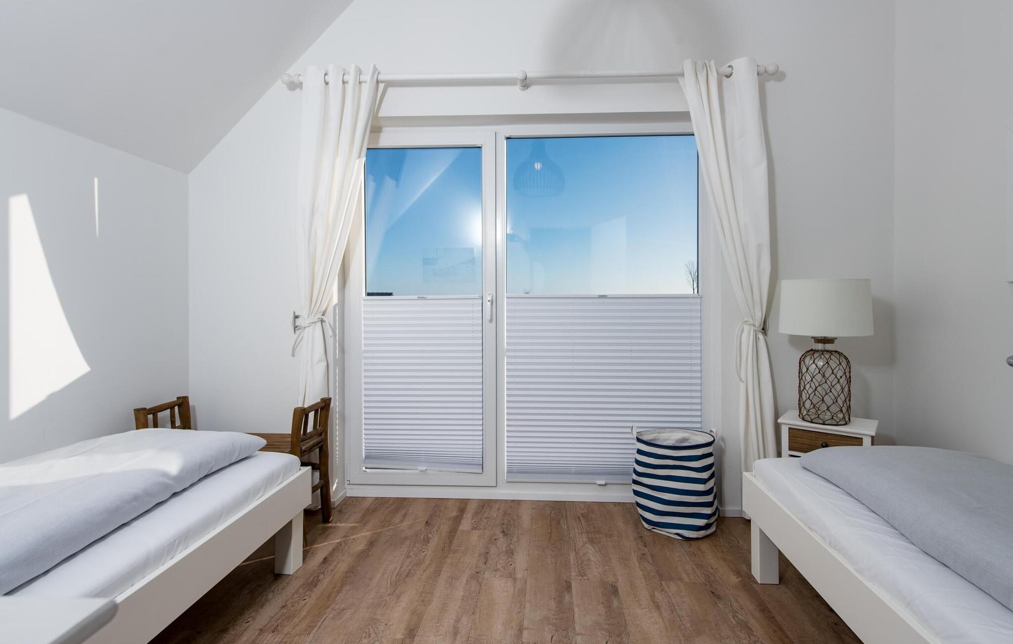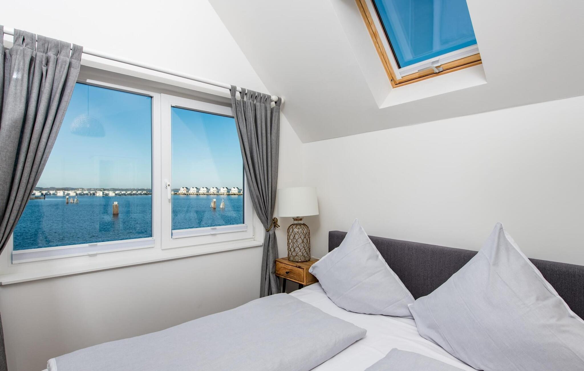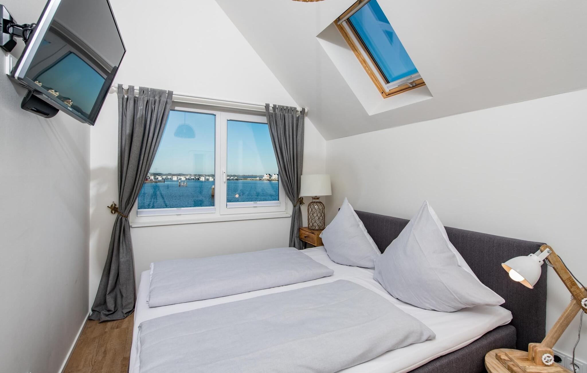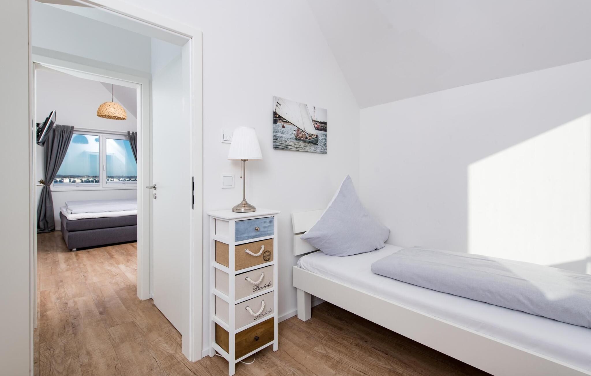 Auf der zweiten Ebene befindet sich der Ruhebereich des Ferienobjekts. Das Hauptschlafzimmer verfügt über einen traumhaften Hafenblick. Einschlafen unter Sternen, ein Dachfenster erlaubt nicht nur den Blick in den Sternenhimmel, sondern auch in traumhafte Wolkenformationen, die so charakteristisch sind für den Norden. Im zweiten Schlafzimmer laden zwei Einzelbetten zum Träumen ein.