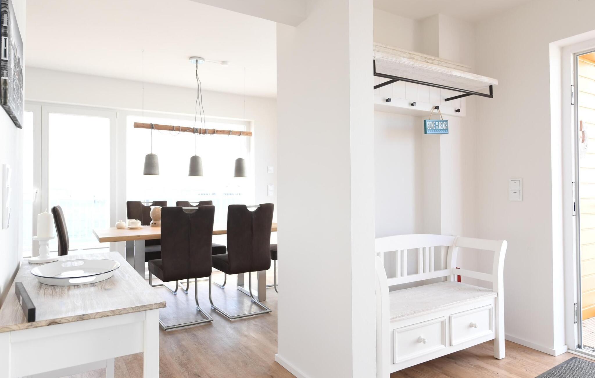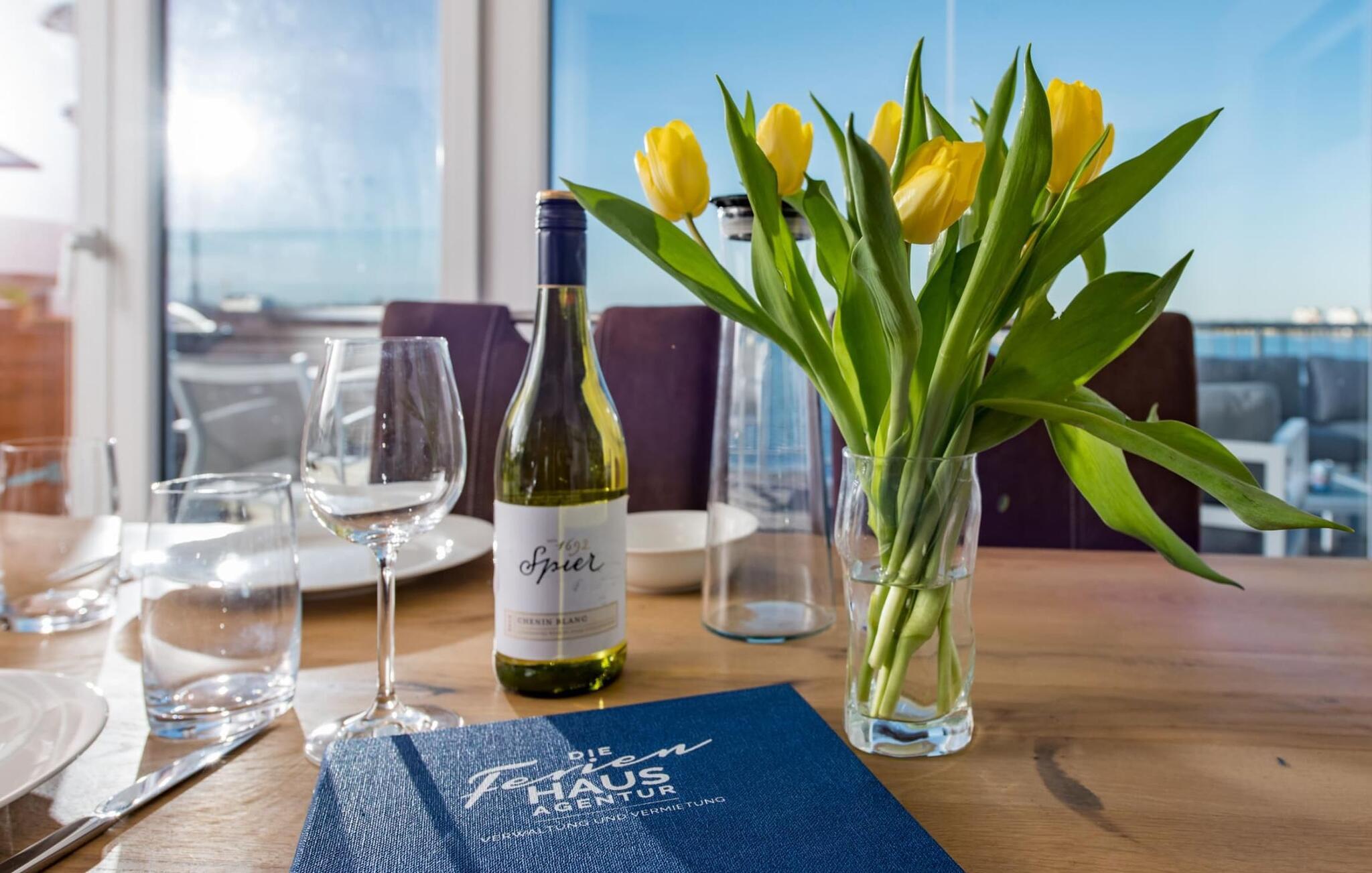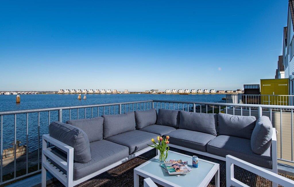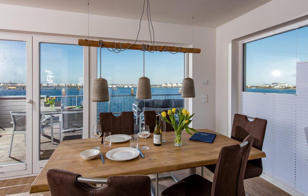 Lichtdurchflutet gestaltet sich der Wohn- /Essbereich des Ferienobjekts mit bodentiefen Panorama-Fensterfronten zu den anliegenden Terrassen auf beiden Seiten. Traumhafte Aussichten eröffnen sich auf der an den Essbereich angrenzenden Terrasse mit Blick über den Segel- und Sportboothafen des