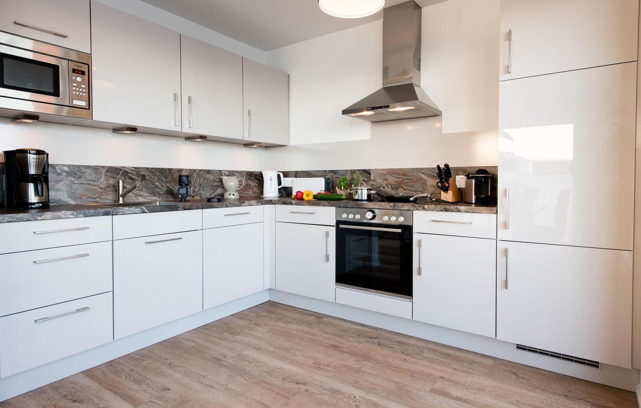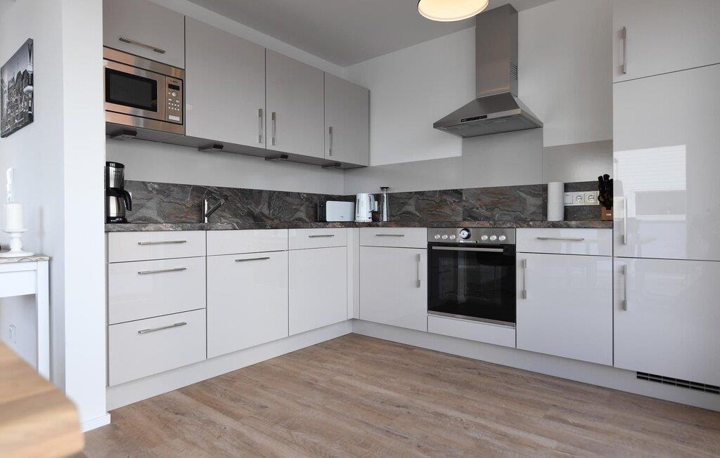 Im Urlaub ist Zeit für kreatives Kochen, die rundum ausgestattete Wohnküche lässt hierbei keine Wünsche offen. Frühstücken bei Morgensonne auf der Ostterrasse, Urlaubsfeeling pur.
