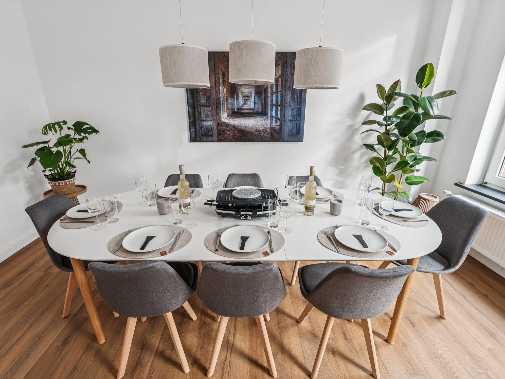 Die voll ausgestattete Küche bietet alles, was Sie für gemütliche Kochabende oder schnelle Mahlzeiten benötigen. Ein Esstisch in der Küche bietet Platz für 4 Personen. Im Wohnzimmer befindet sich ein größerer Esstisch für 8 Personen.