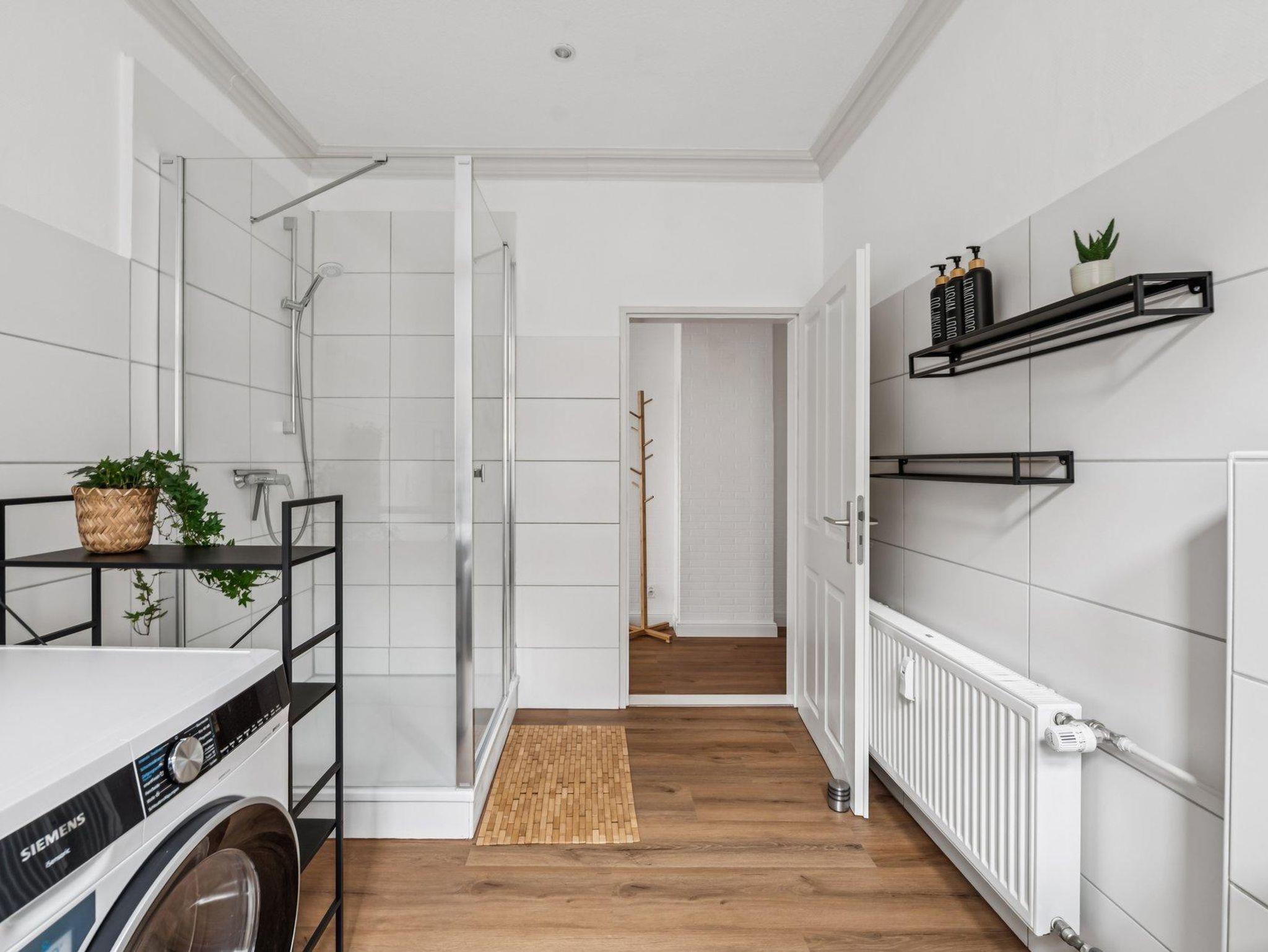 Es sind 2 Bäder mit Dusche und WC vorhanden sowie Waschmaschine und Trockner – Komfort und Funktionalität in einer stilvollen Umgebung.