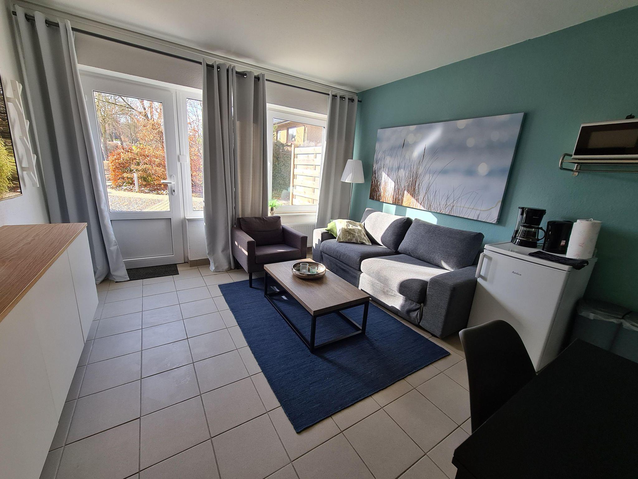 Diese 2-Zimmer-Wohnung (40m²) im Erdgeschoss verfügt über ein Wohn- und Esszimmer inkl. Pantryküche sowie ein separates Schlafzimmer mit Doppelbett (1,80 x 2,00 m.). Im Wohnbereich befindet sich ein Schlafsofa für weitere zwei Personen. Zusätzlich steht eine eigene Terrasse zur Verfügung. Haustiere können nach Absprache gegen eine zusätzliche Gebühr von 8,- € pro Nacht und Tier mitgebracht werden.