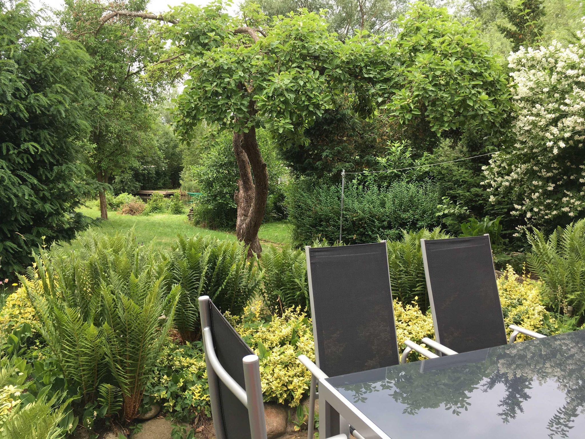 Wohnzimmer, 1 Schlafraum mit Doppelbett 1 x 1,90 m breit und 1 Schlafraum mit 2 Einzelbetten zusammen gestellt 1,80 m breit , Duschbad, sonnige Terrasse direkt am Haus, Gartenteil