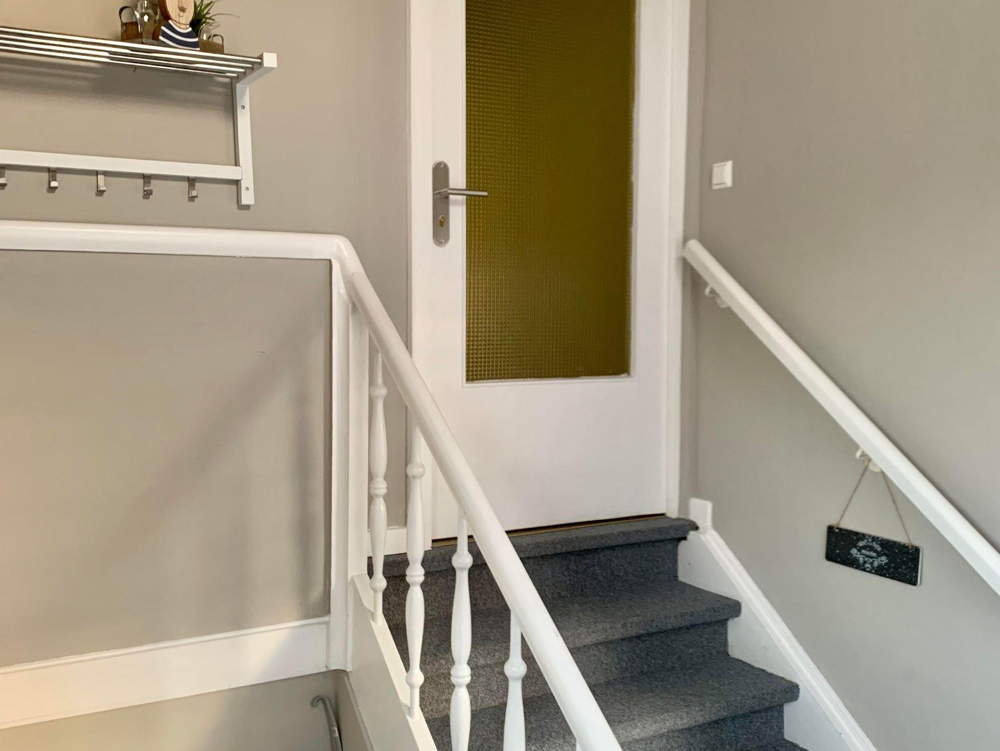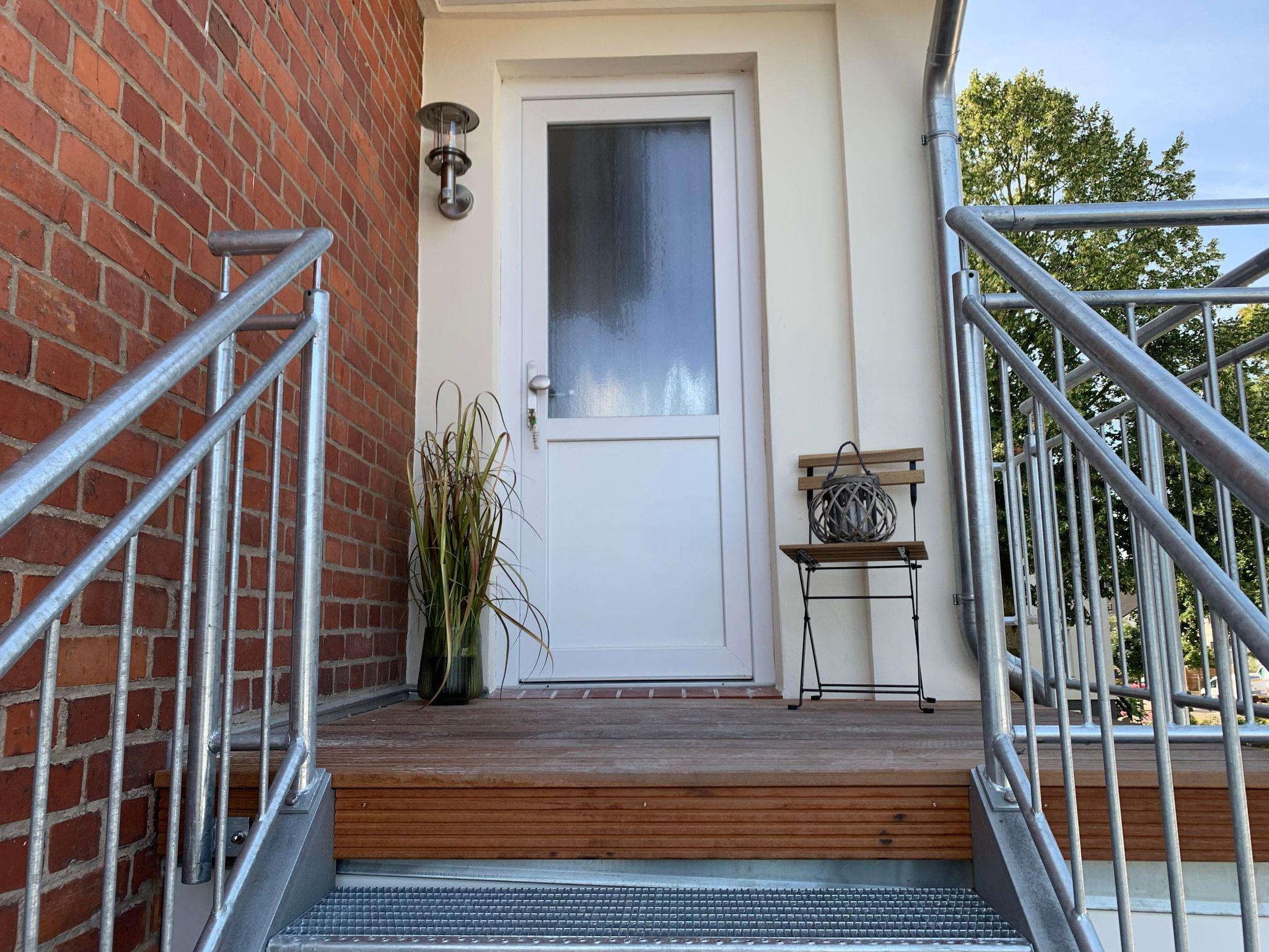 Der separate Eingang ist über eine bequeme Stahltreppe zu erreichen und führt in den Vorflur, in dem sich die Garderobe befindet.