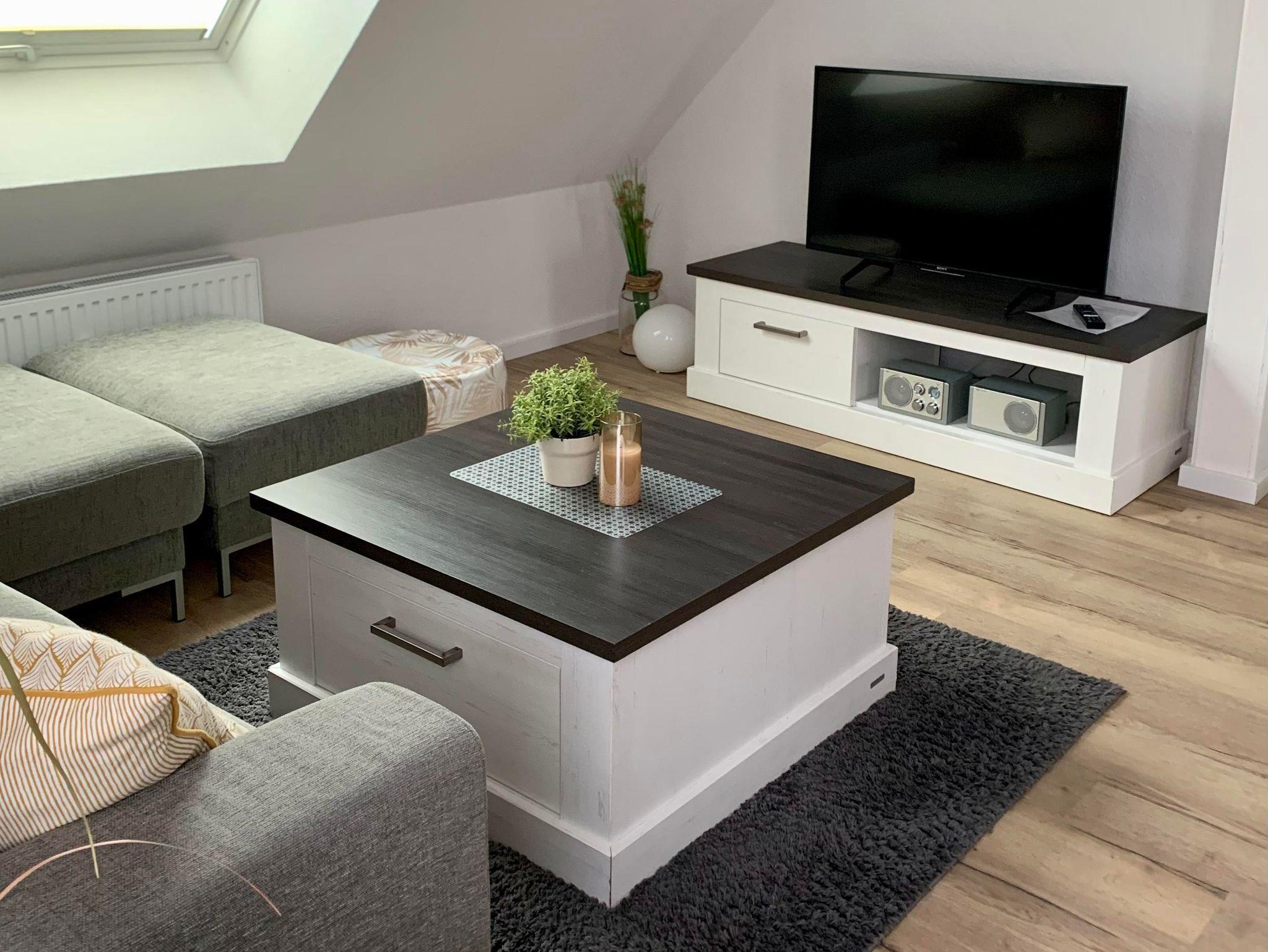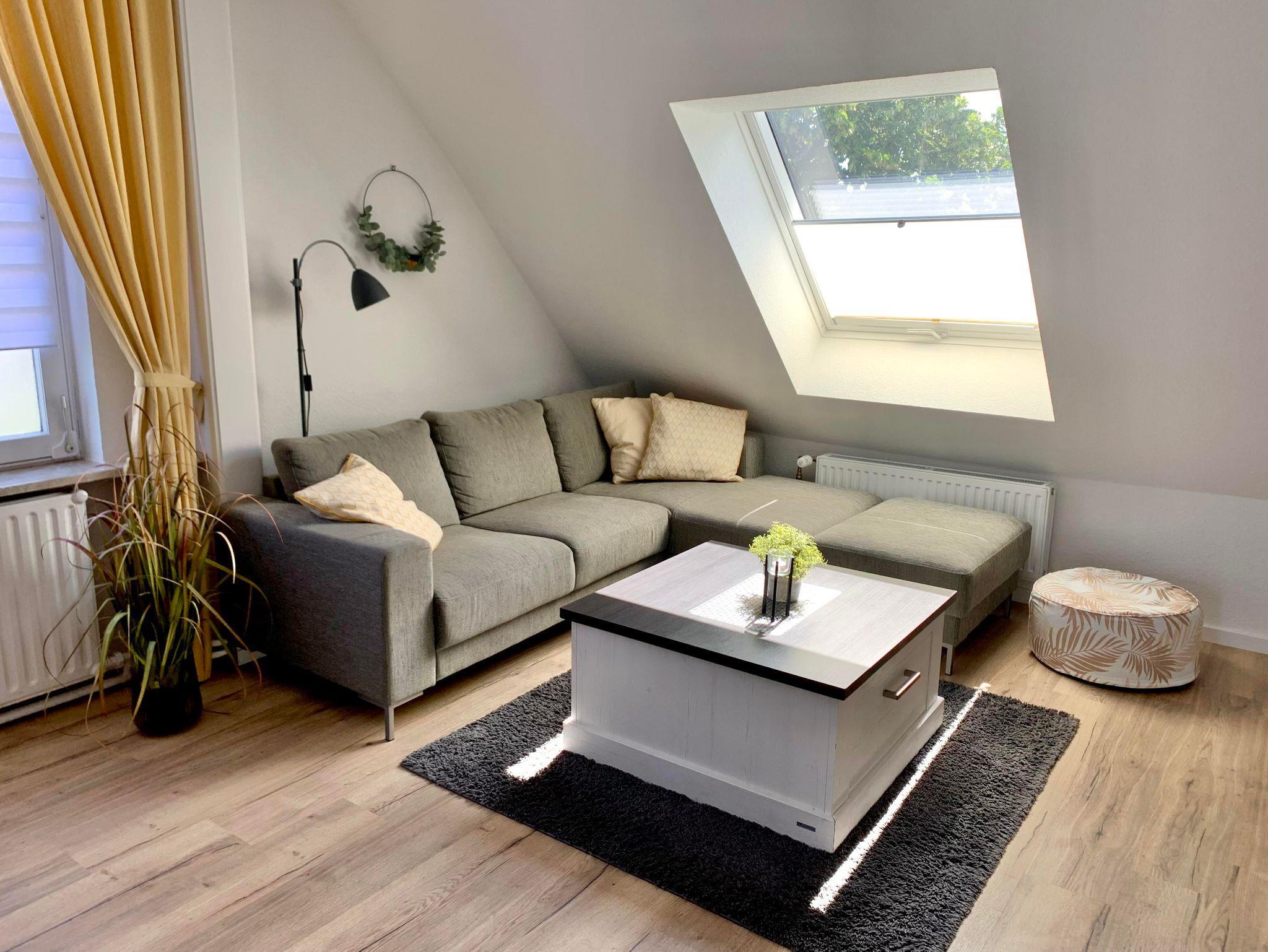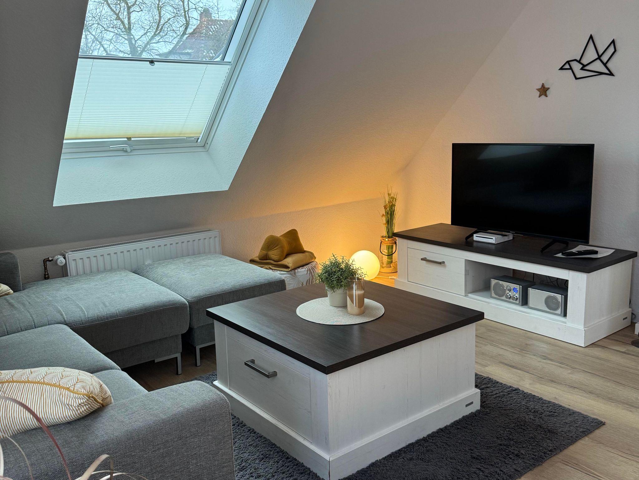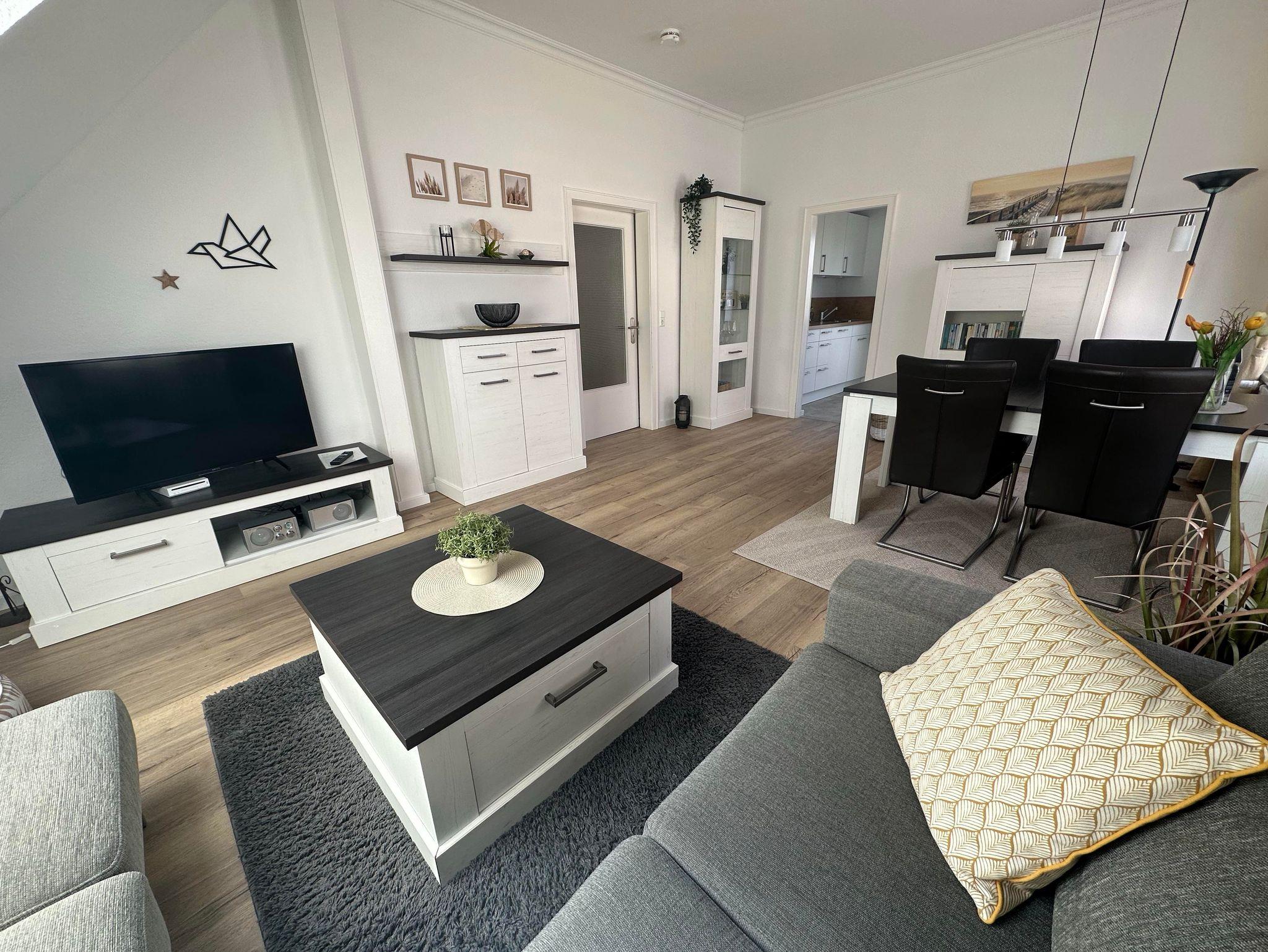 Die gemütliche und moderne Ferienwohnung verfügt über ein Wohn-/ Esszimmer, ein Schlafzimmer mit einem 1,80m x 2m große Bett und eigenem TV, ein Schlafzimmer mit 2 Einzelbetten, ein neues Bad mit großzügiger Dusche und eine neue Küche. Über die Küche gelangt man auf die wunderschöne Dachterrasse (18 m²), auf der man herrlich frühstücken oder mit dem vorhandenen Holzkohlegrill grillen und den Abend bei einem Glas Wein entspannt ausklingen lassen kann.