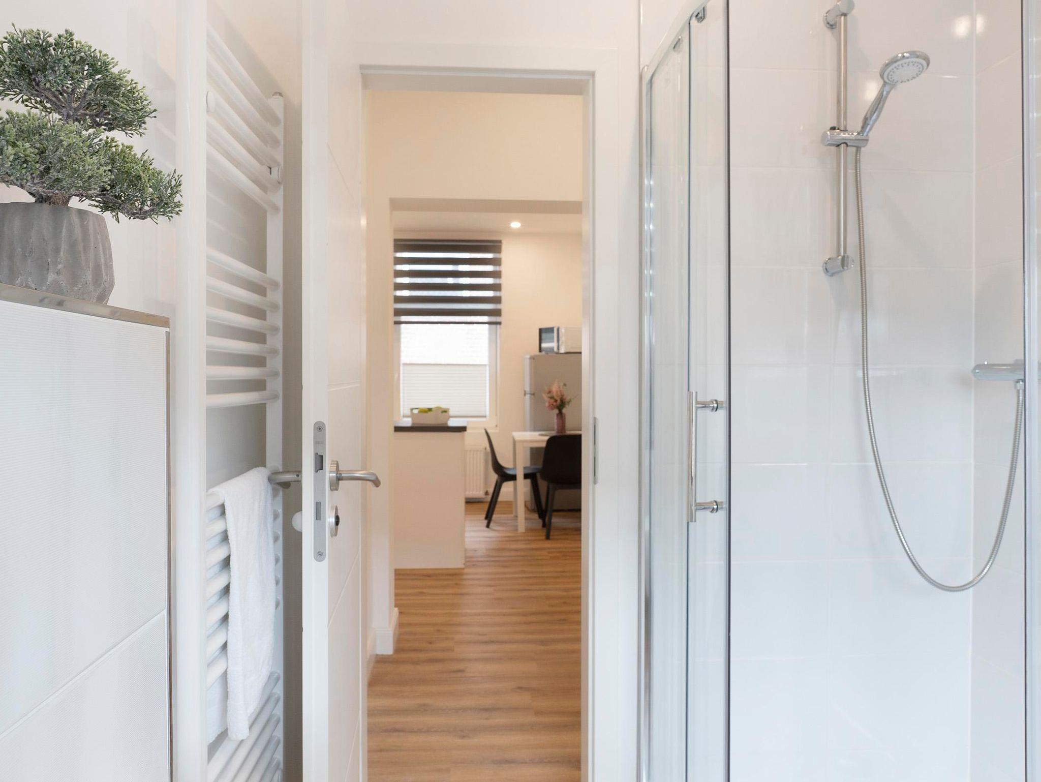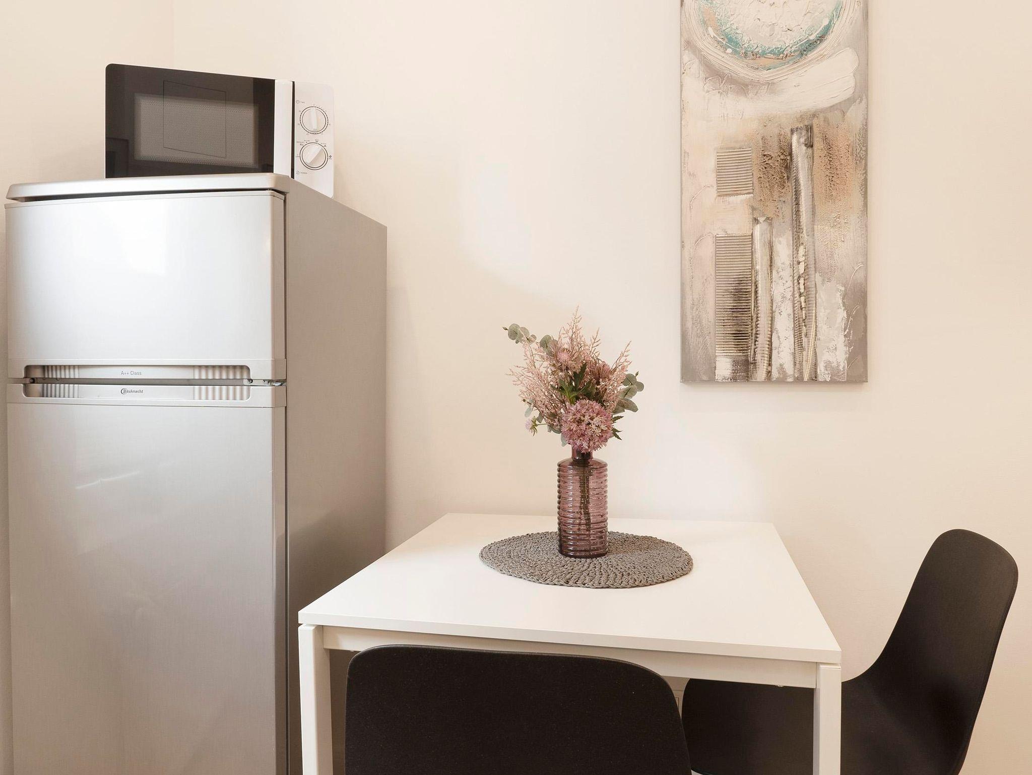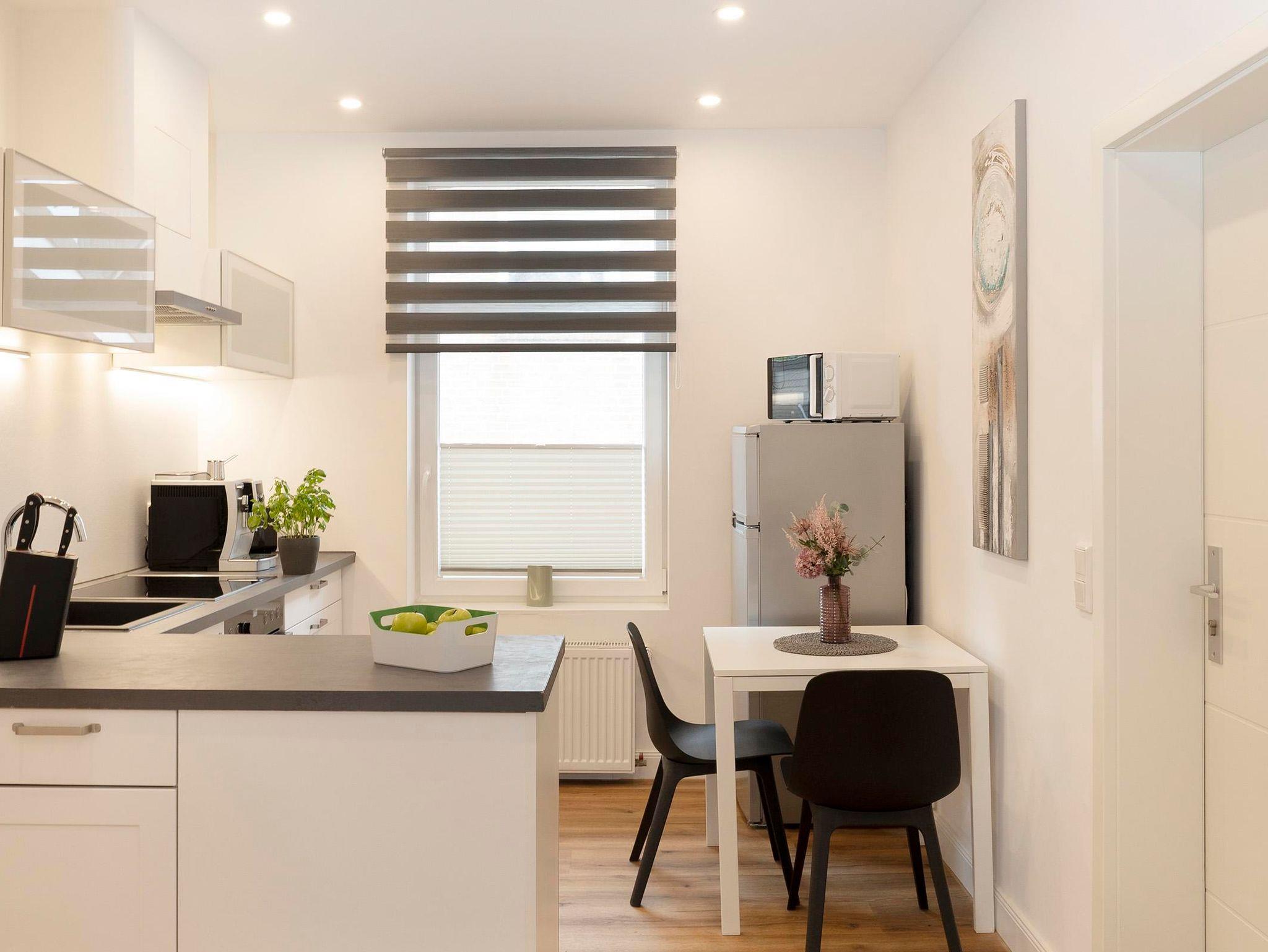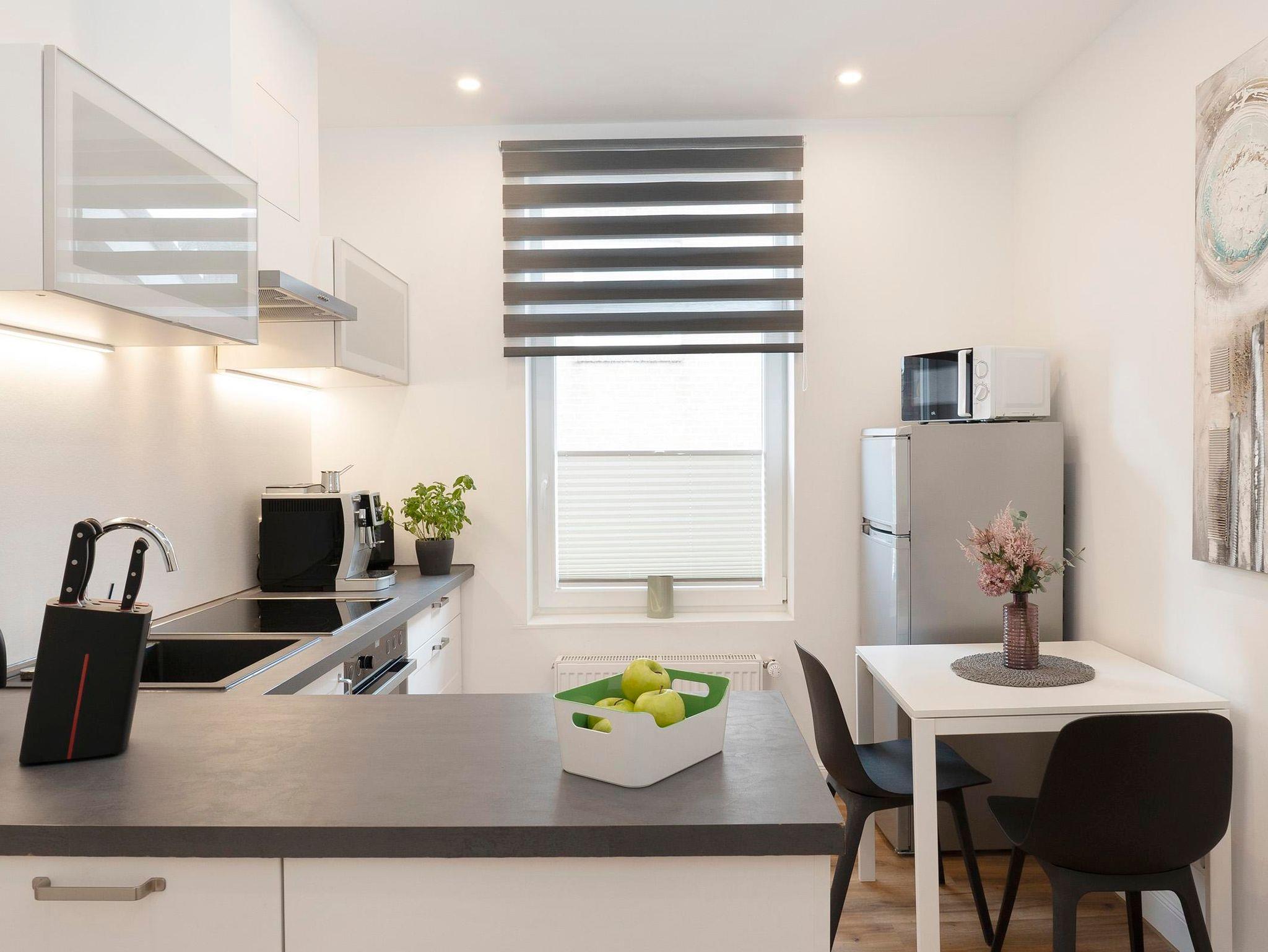 Die Küche ist modern ausgestattet und verfügt über einen Induktionsherd sowie einen Essplatz. Neben einer Filterkaffeemaschine steht auch ein Kaffeevollautomat zur Verfügung. Das helle Duschbad verfügt über ein Waschbecken, WC und Dusche.