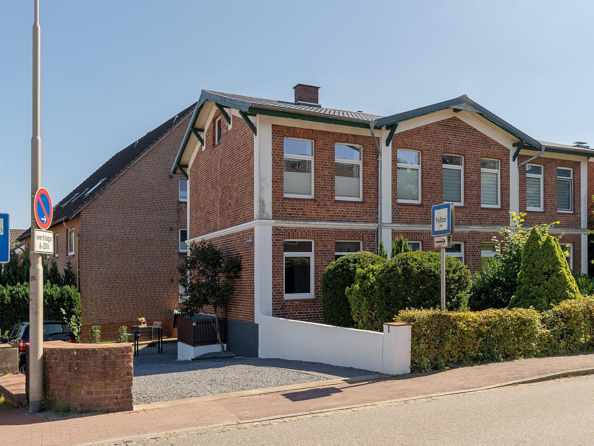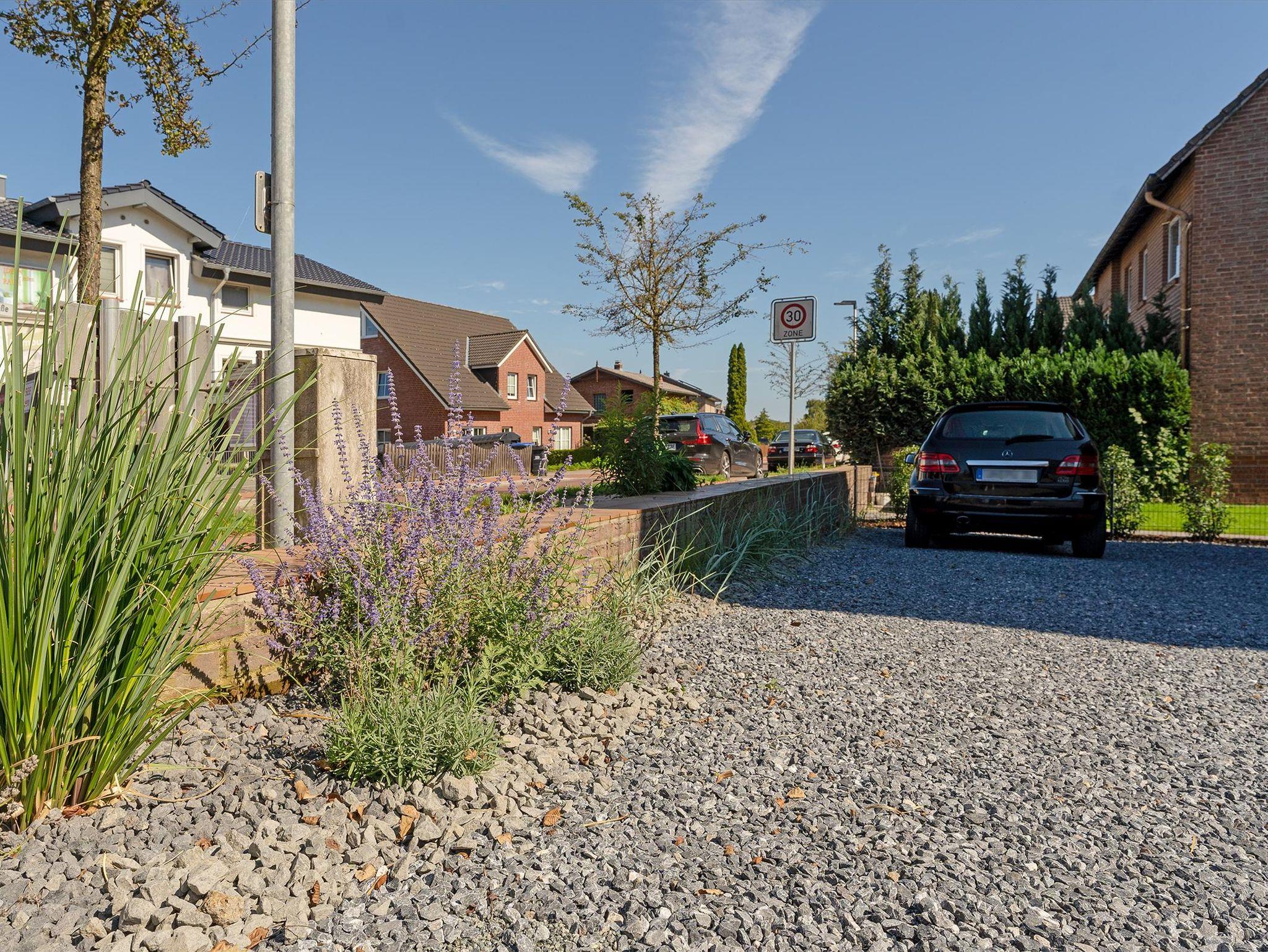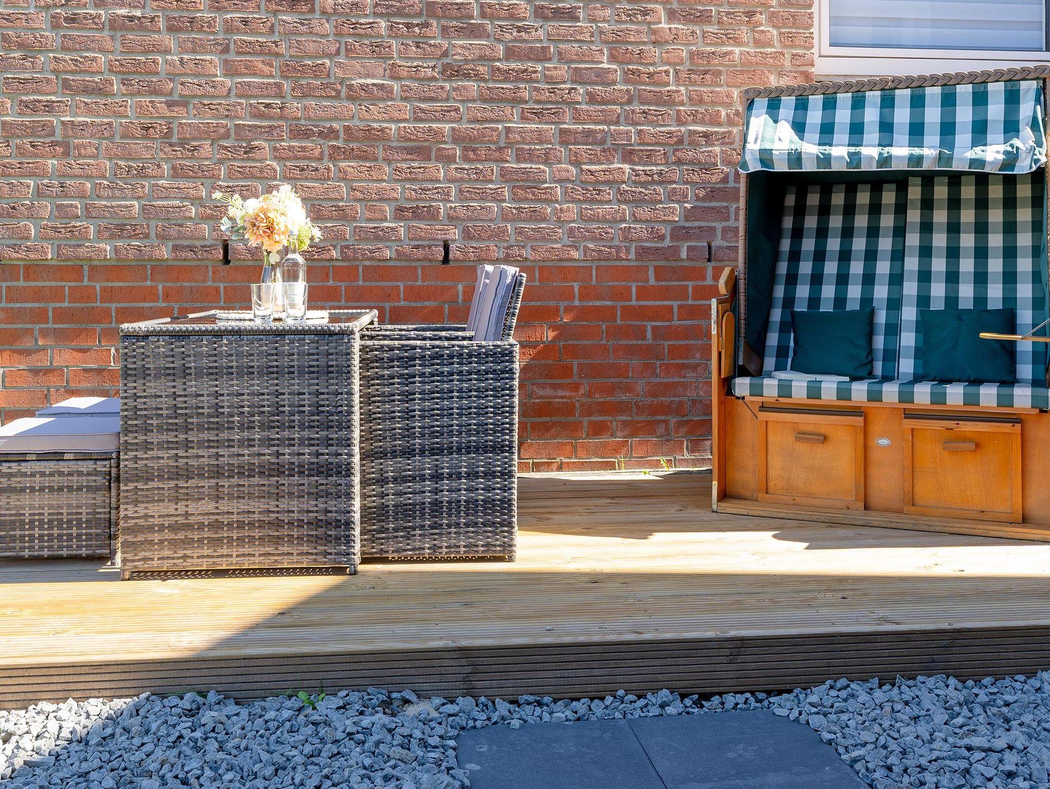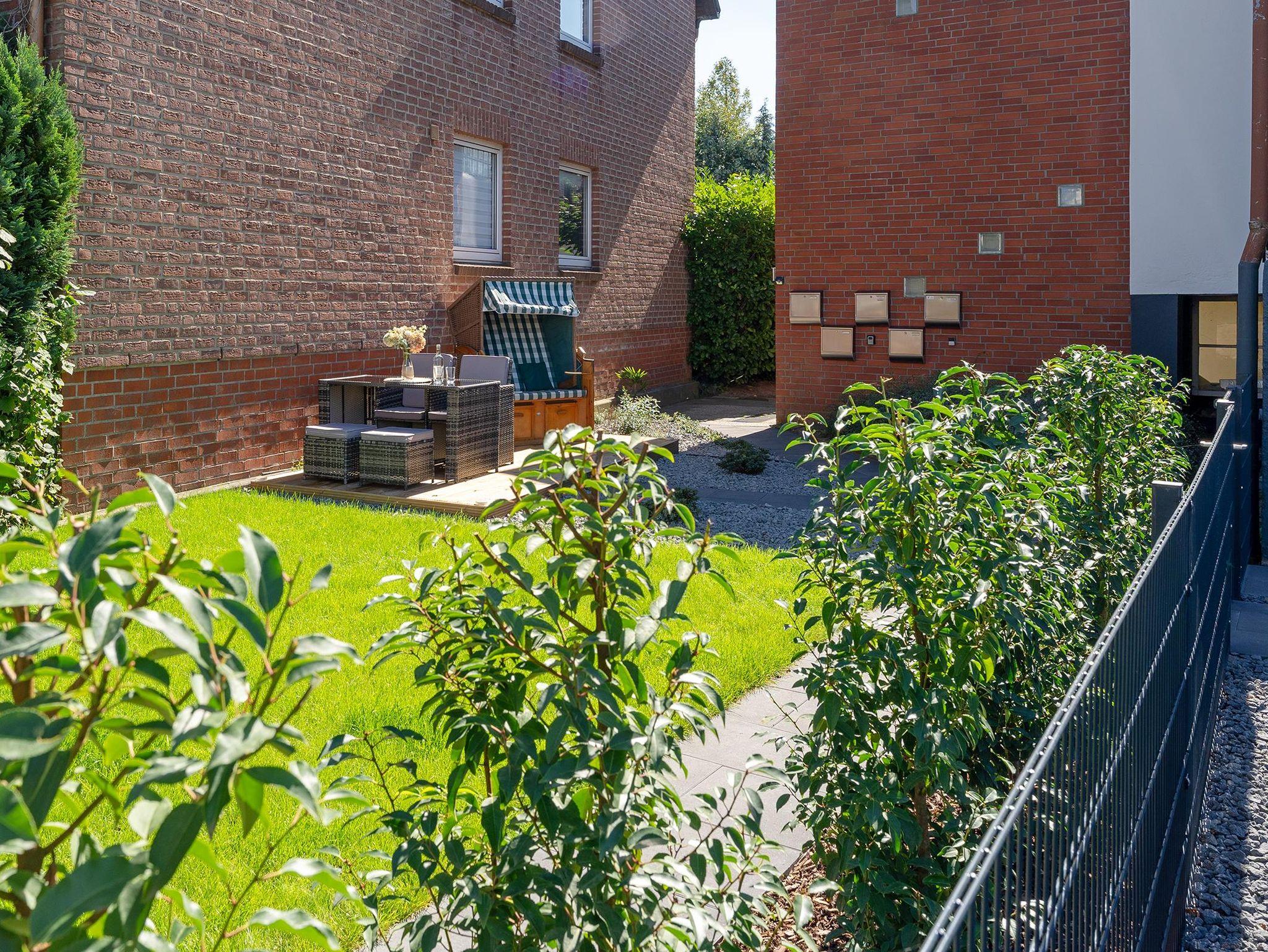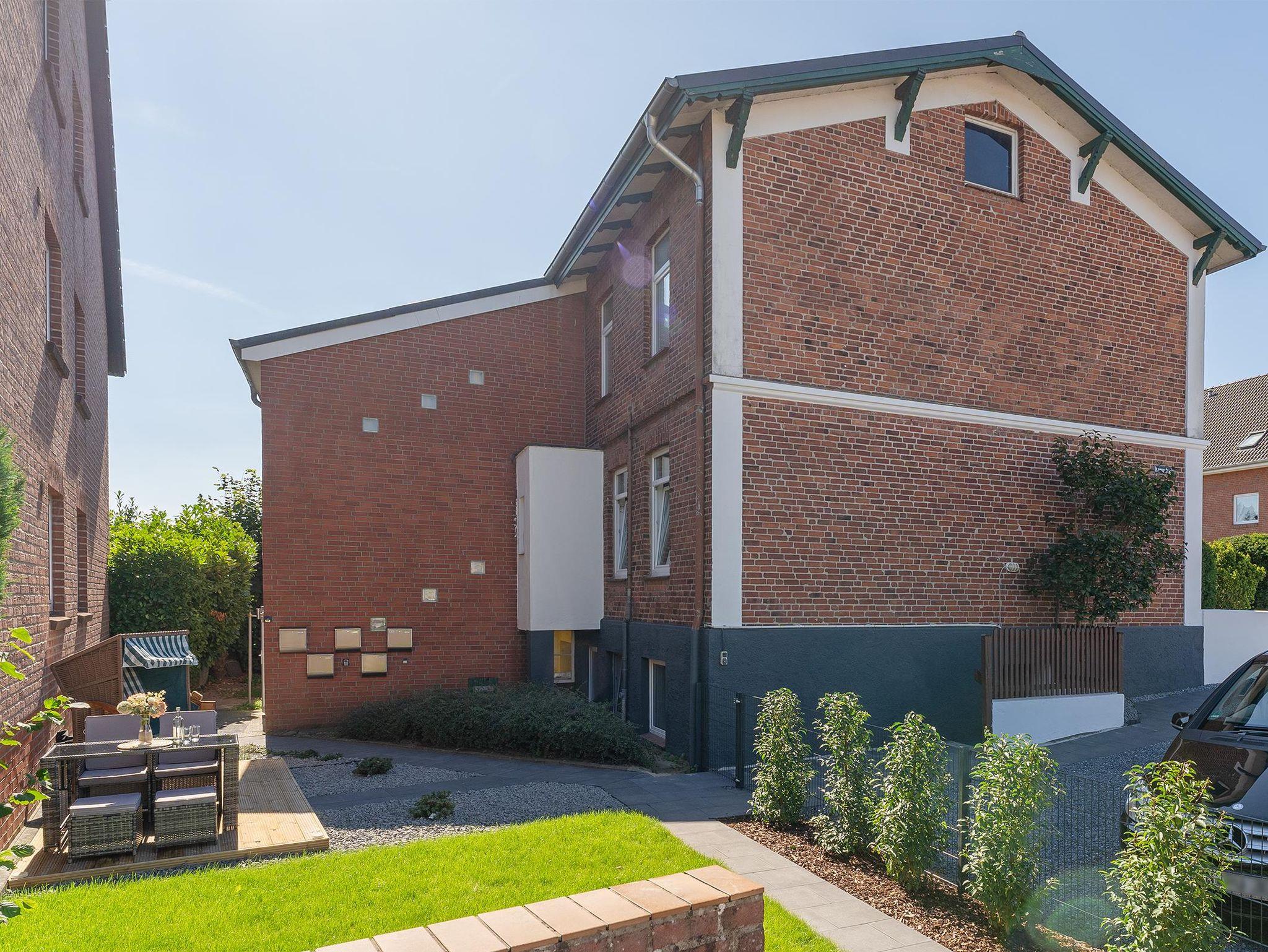 Im gemeinschaftlichen Garten lädt eine Terrasse mit Strandkorb und weiteren Sitzmöglichkeiten mit Tisch zum Verweilen ein. Direkt an den Garten grenzt der Parkplatz des Hauses.