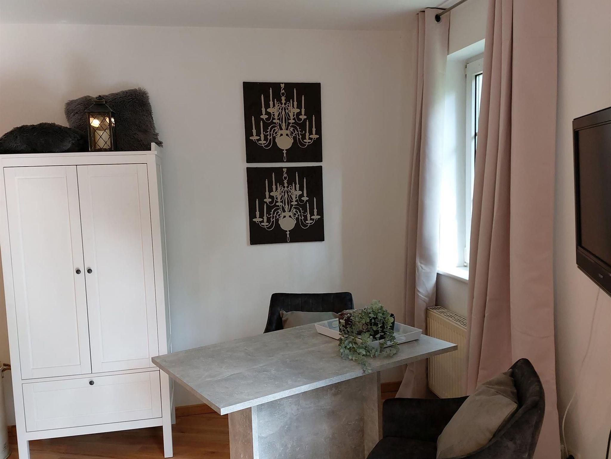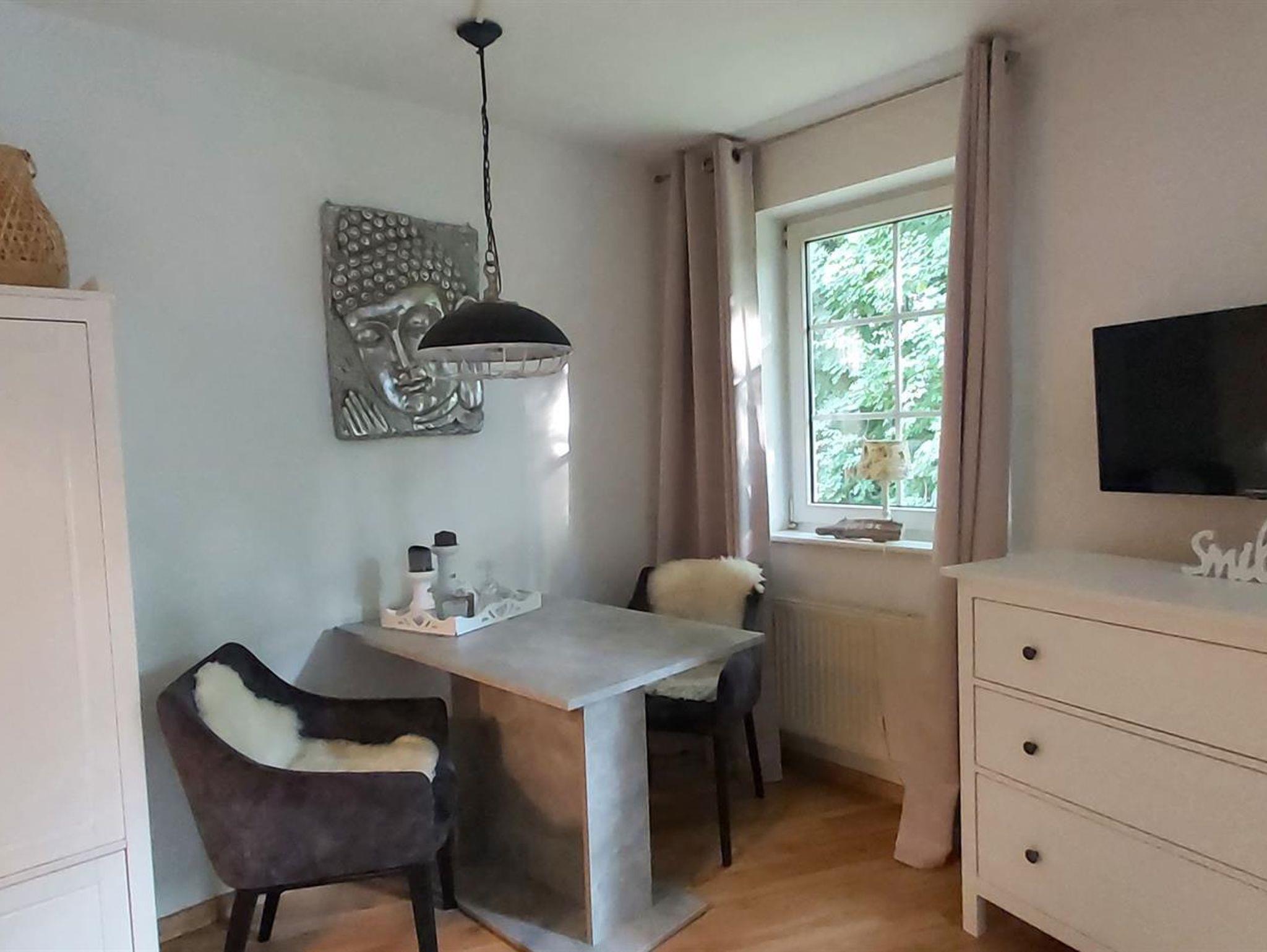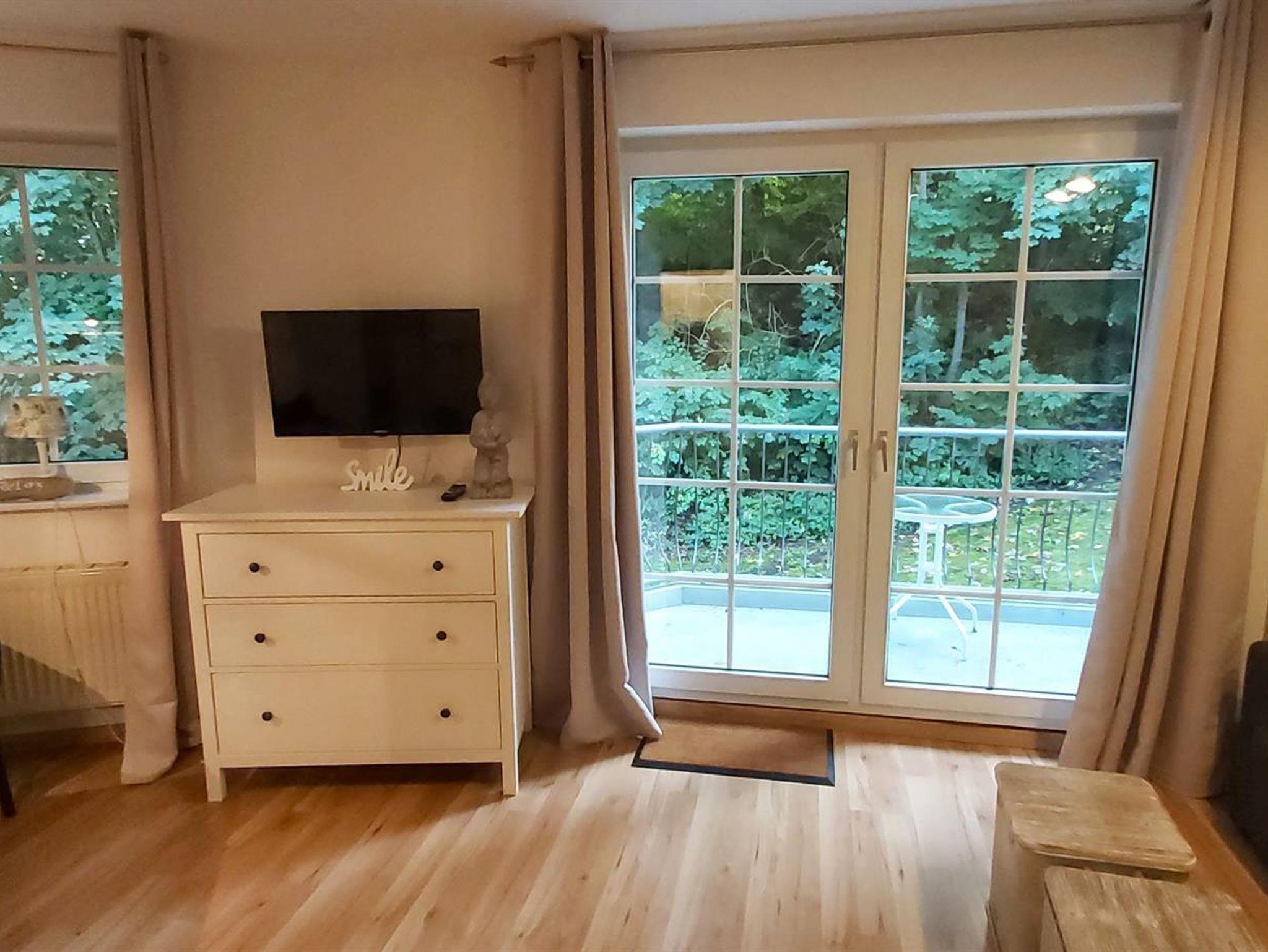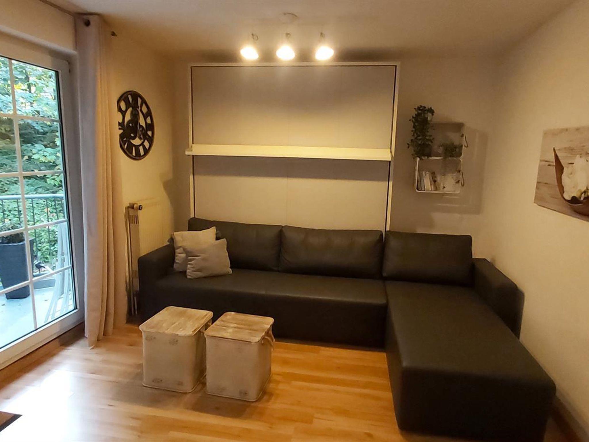 Die Ferienwohnung ist 28m² groß und verfügt über einen kombinierten Wohn- / Schlafraum mit Essecke und komfortablem Schrankbett, eine Kochnische und einen sonnigen ruhigen Balkon zum Entspannen. Das separate Badezimmer ist mit einer Dusche ausgestattet.