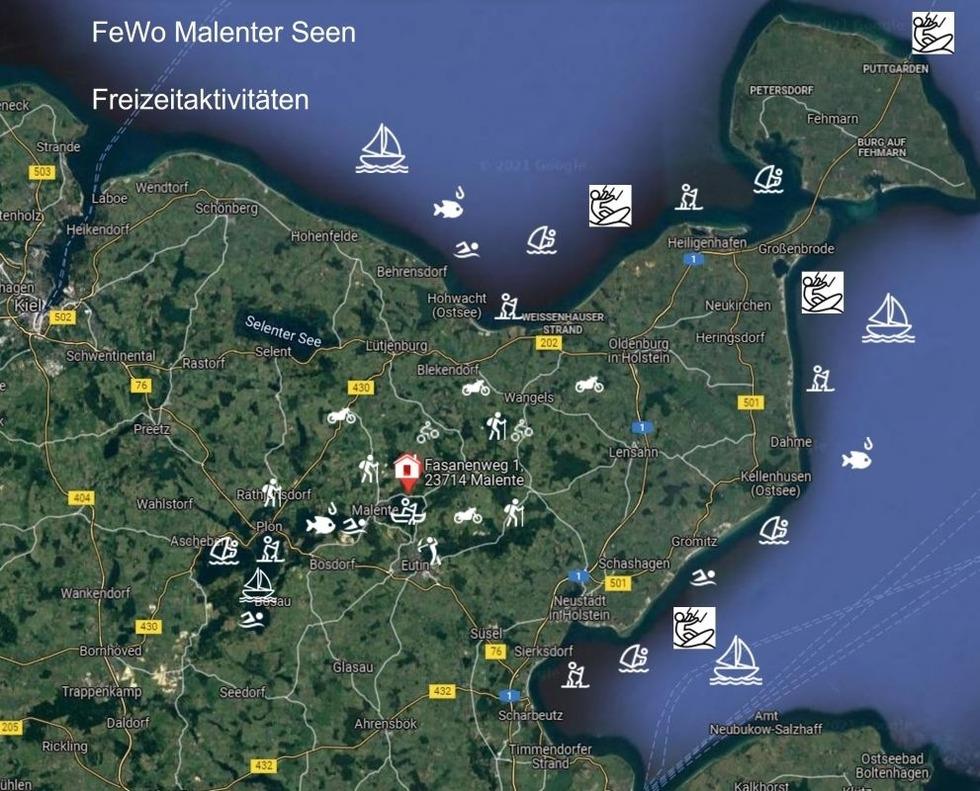 Diese können Sie auf den vielen Seen der Umgebung ausprobieren. Bad Malente Krummsee ist ein Ausgangspunkt für ausgedehnte Wanderungen, Boots-, Paddel-, Fahrrad- oder Motorradtouren. Die 20 min. entfernte Lübecker und Hohwachter Bucht locken mit weitläufigen Stränden und schönen Ostseepromenaden.