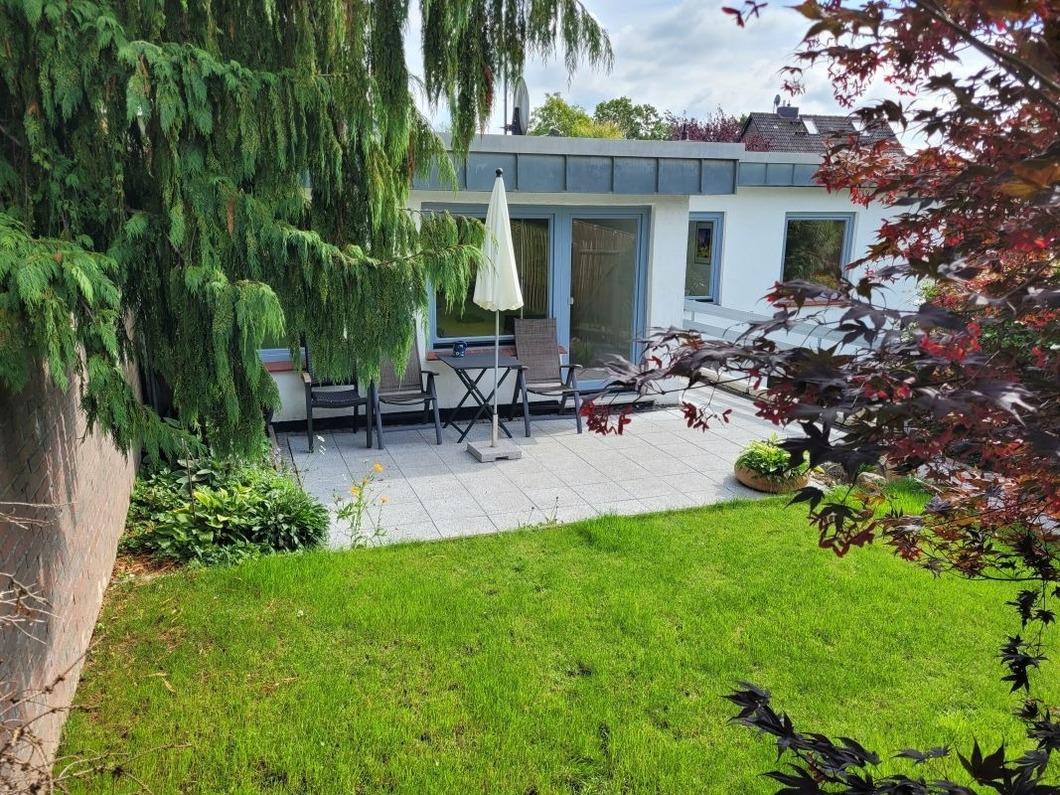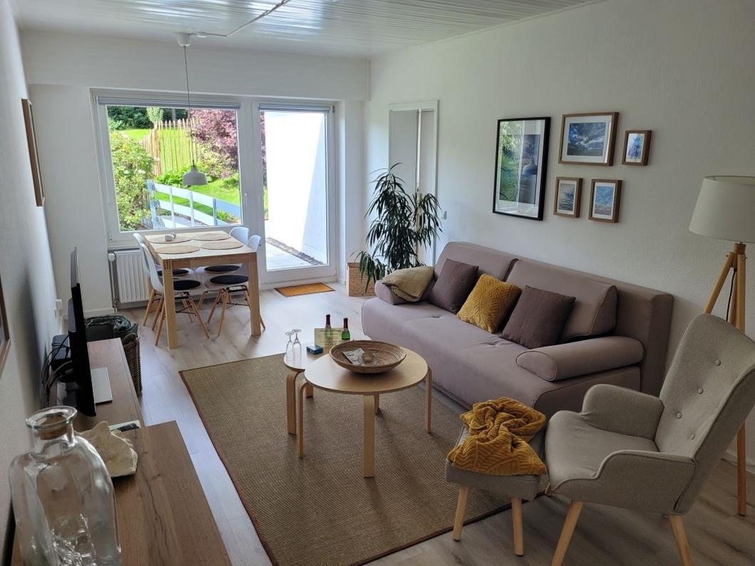 Gemütliche Ferienwohnung in Malente mit Terrasse, Gartenblick und moderner Ausstattung für erholsame Urlaubstage.